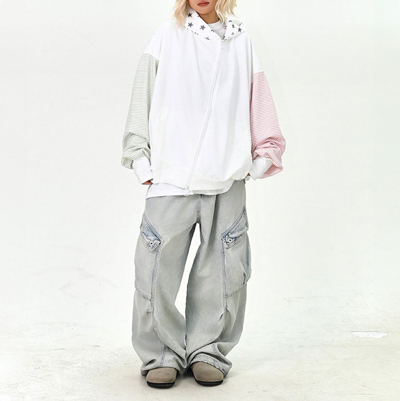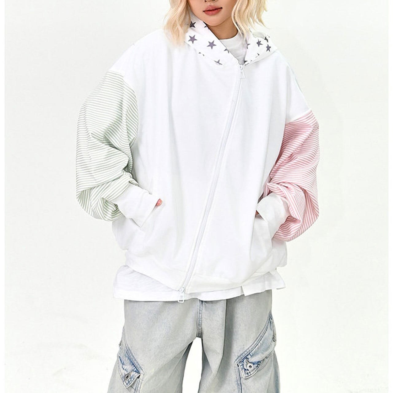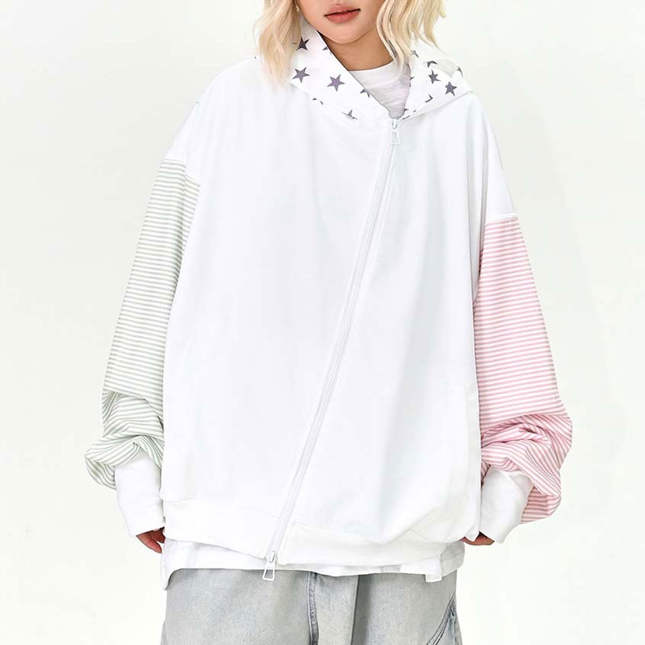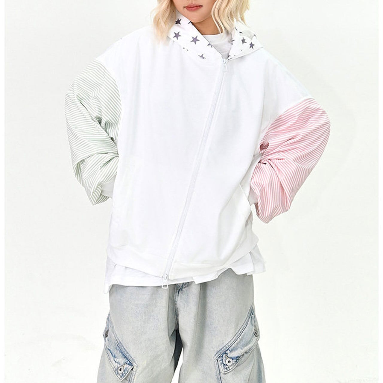 星柄フードと袖の切り替えが目を引く、ポップなデザインジップフーディ。