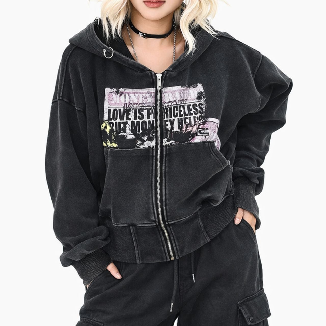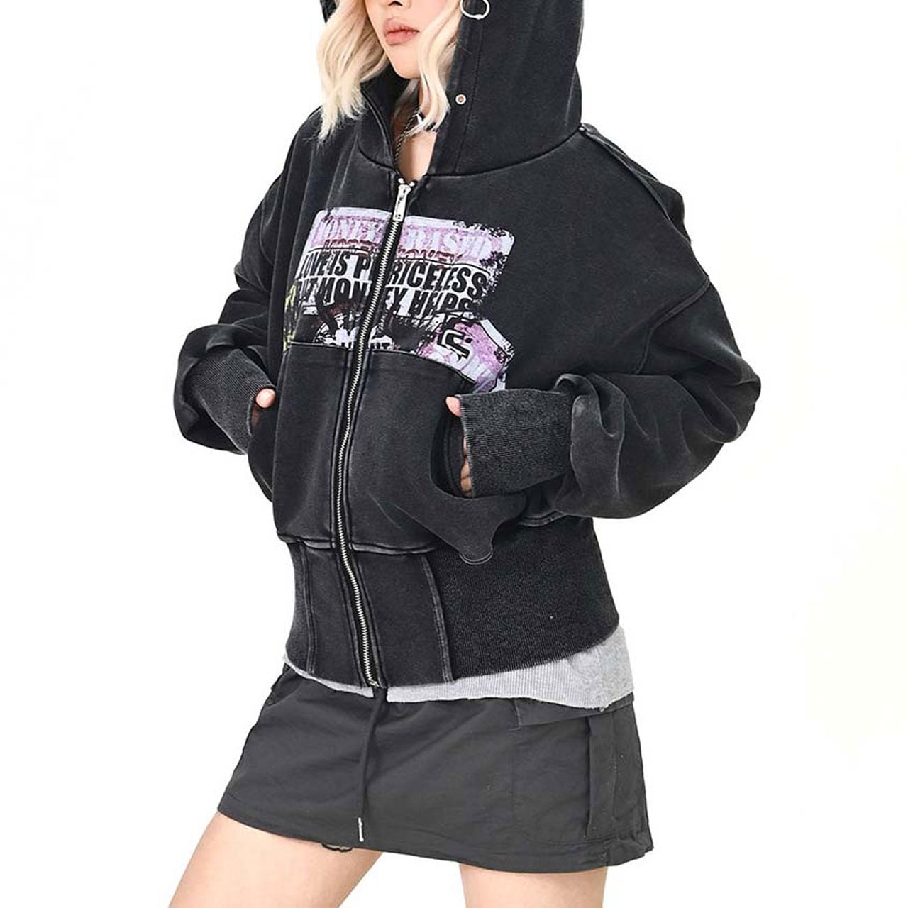 フロントのグラフィック切替が視線を引く、存在感のあるジップフーディ。