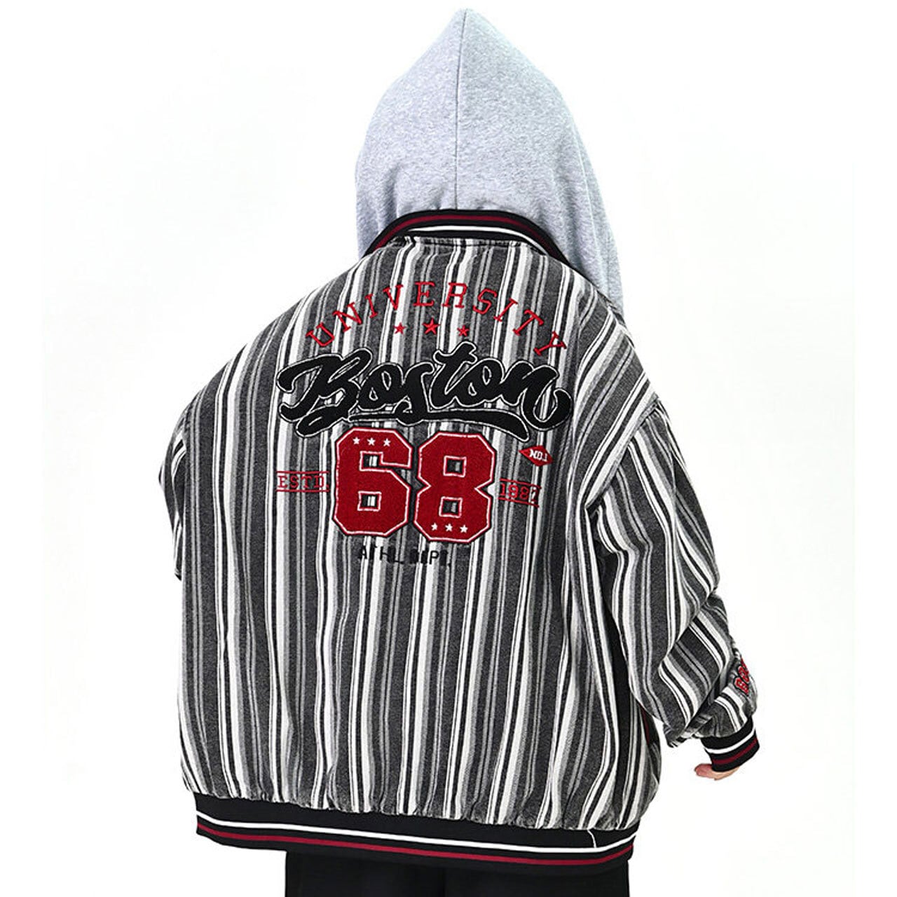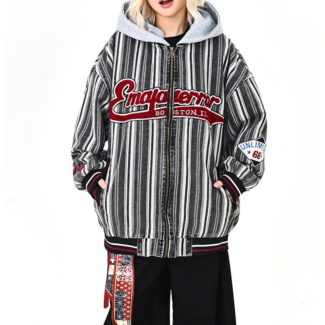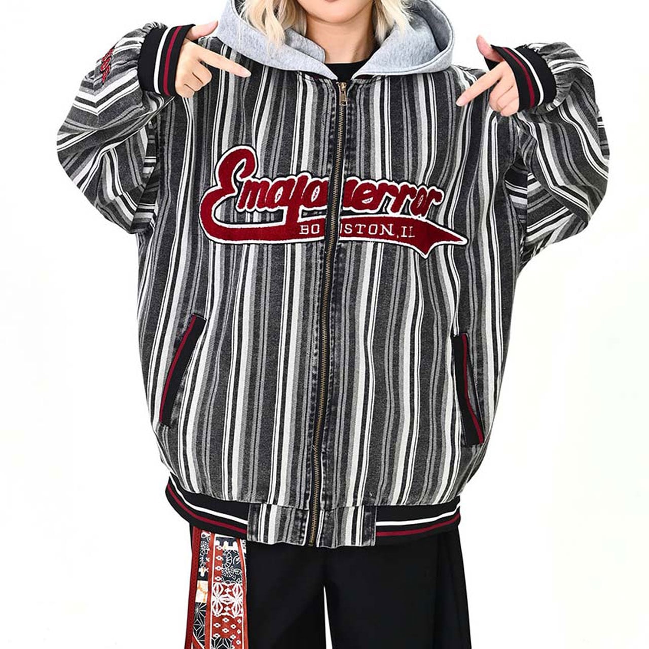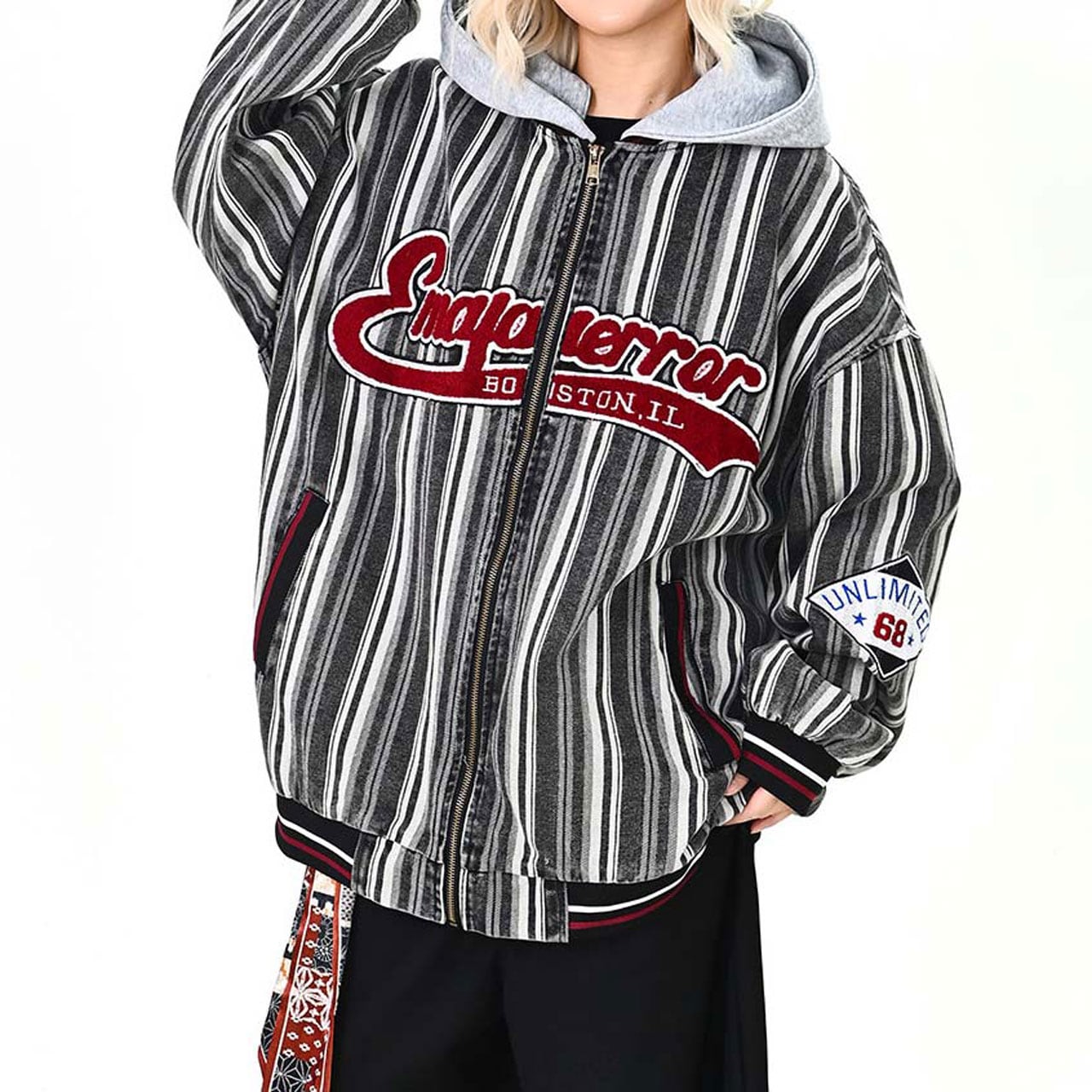 ストライプ柄に大胆なロゴを重ねた、ストリート感あふれるフーディジャケット。
