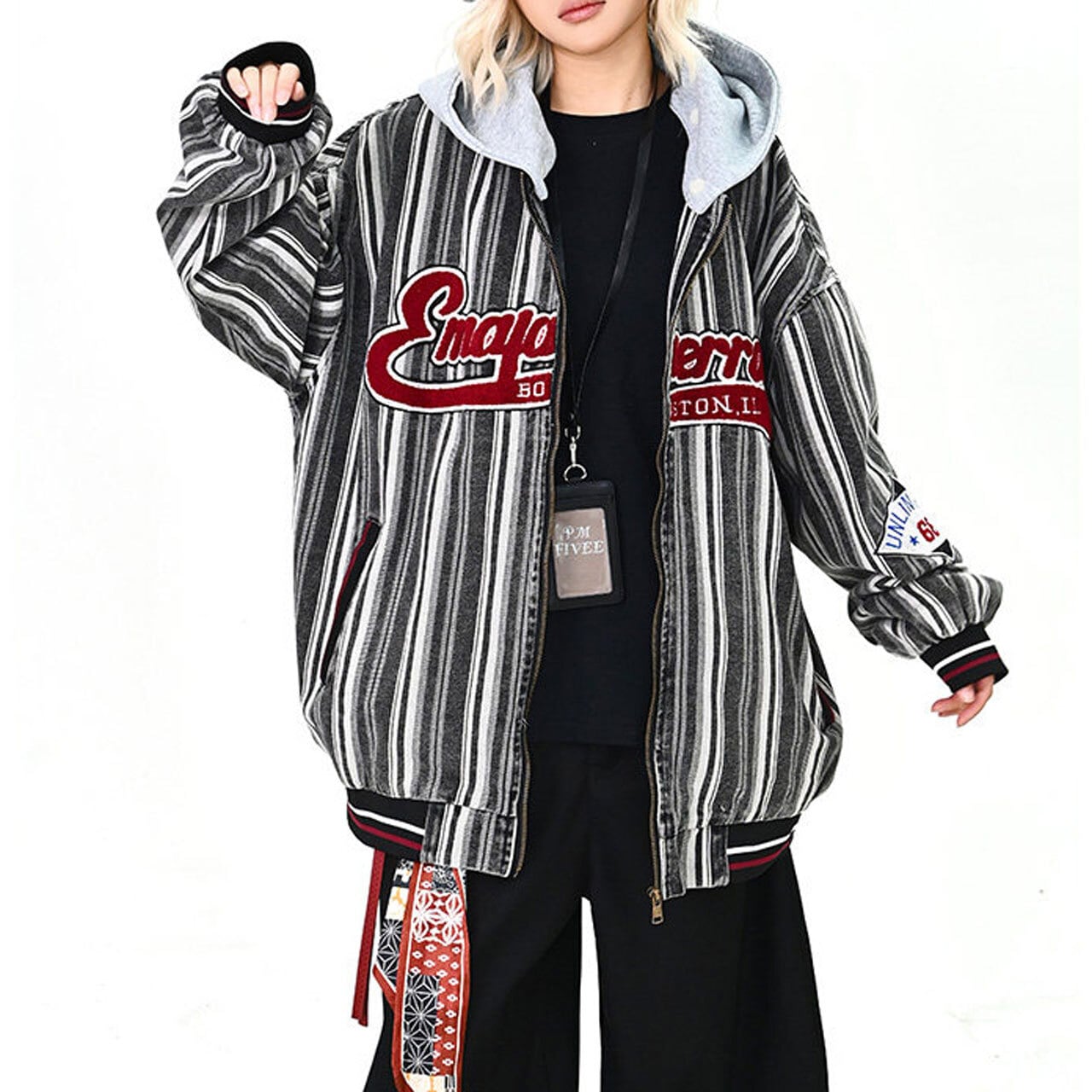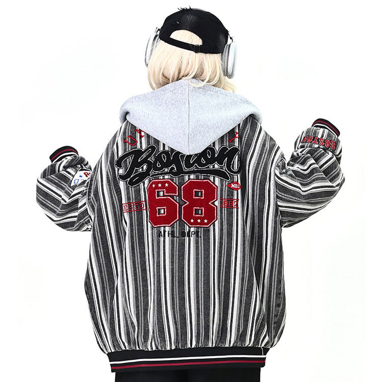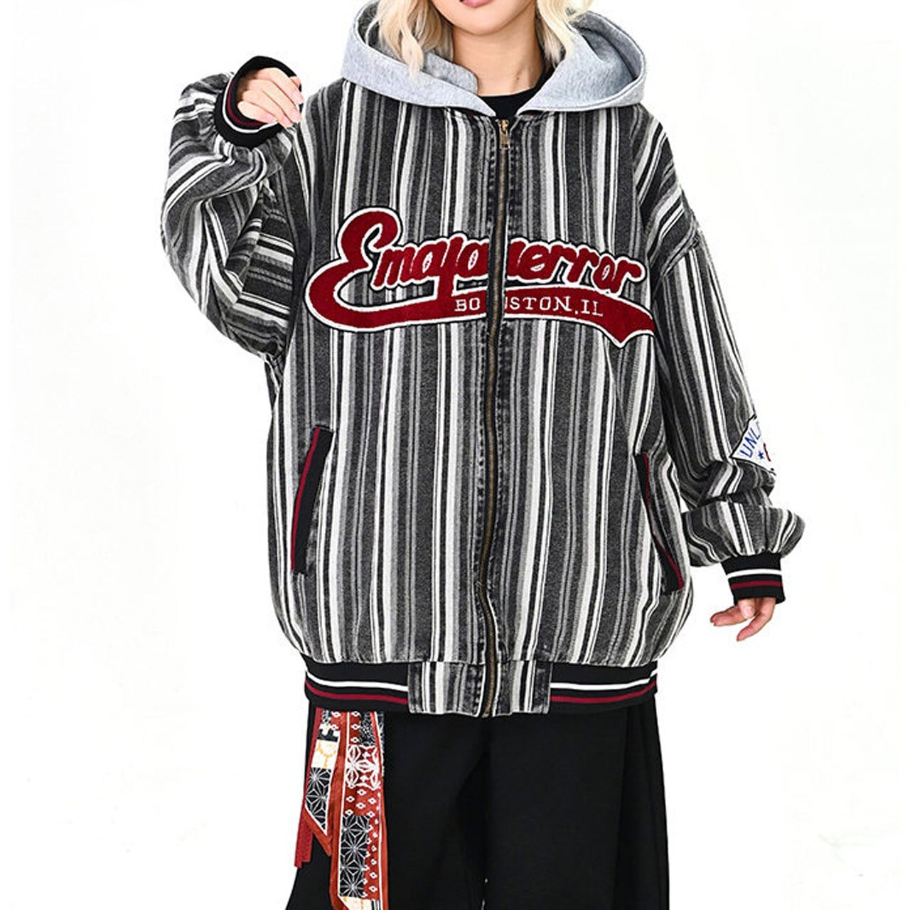 ストライプ柄に大胆なロゴを重ねた、ストリート感あふれるフーディジャケット。