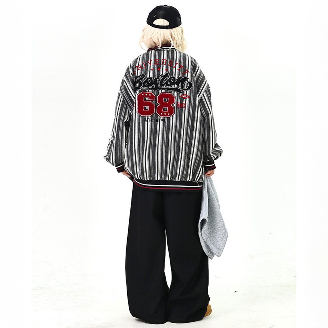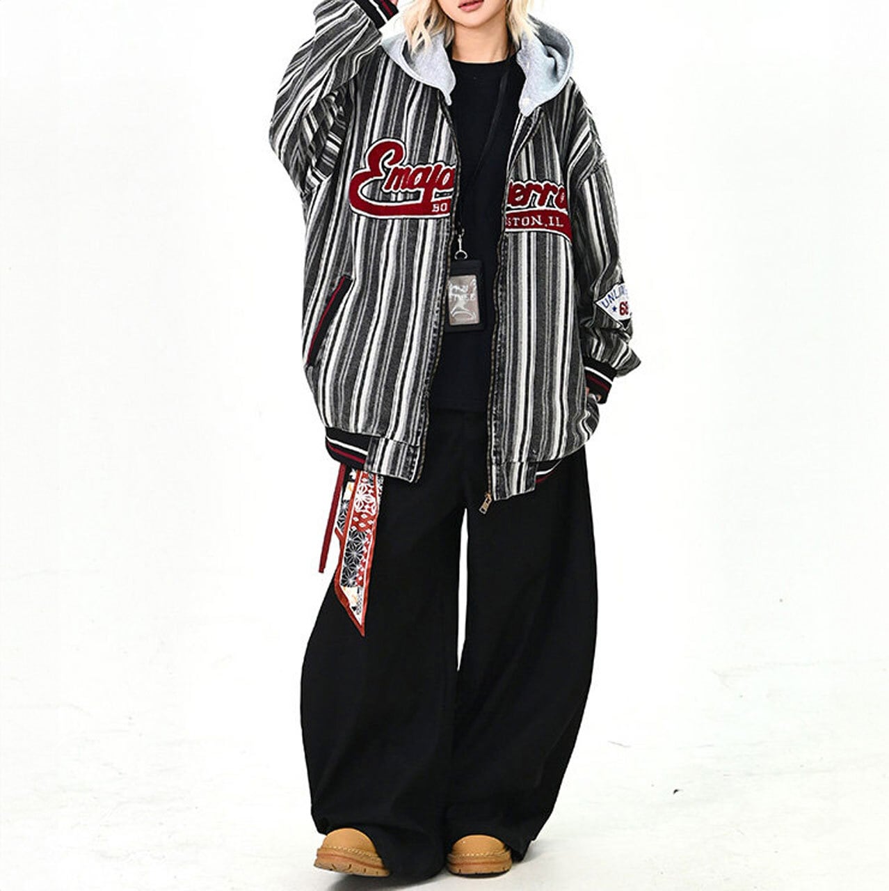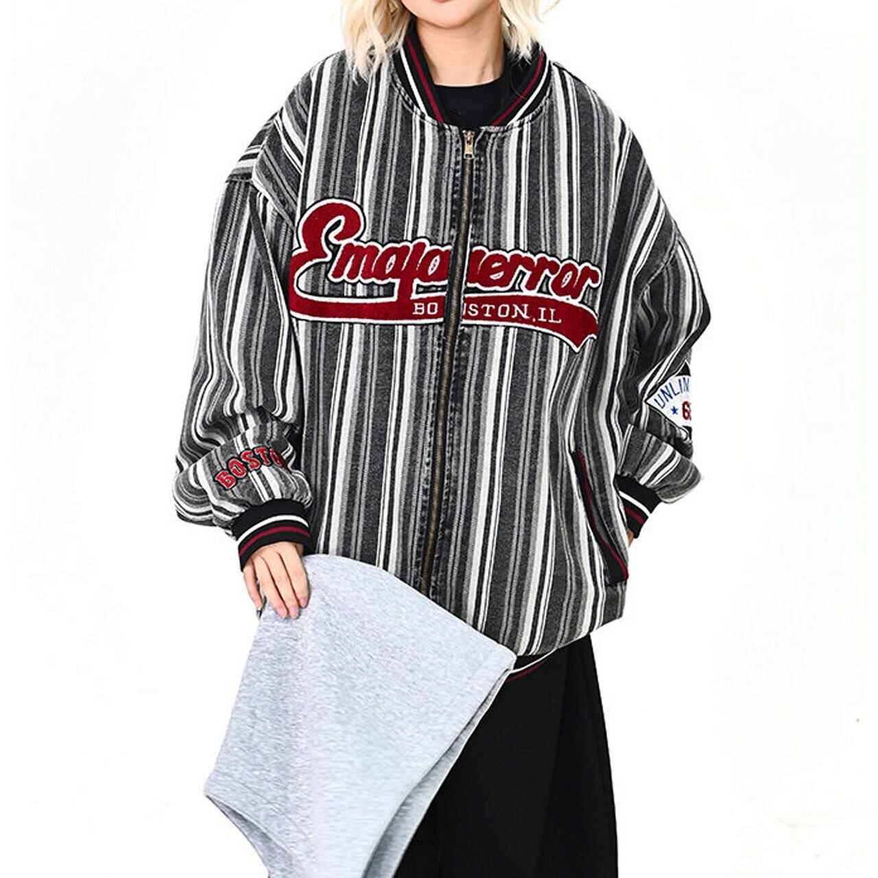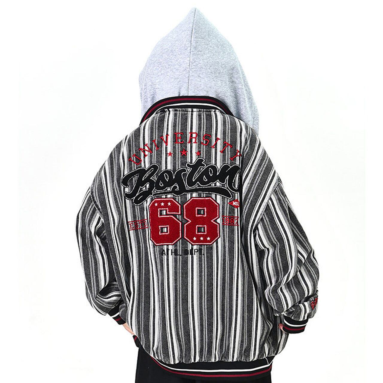 ストライプ柄に大胆なロゴを重ねた、ストリート感あふれるフーディジャケット。