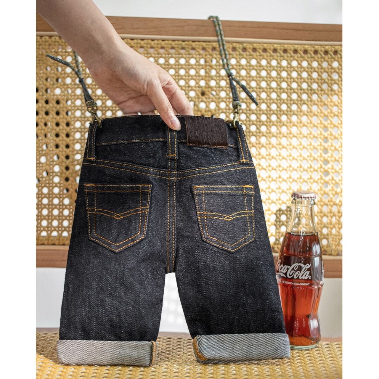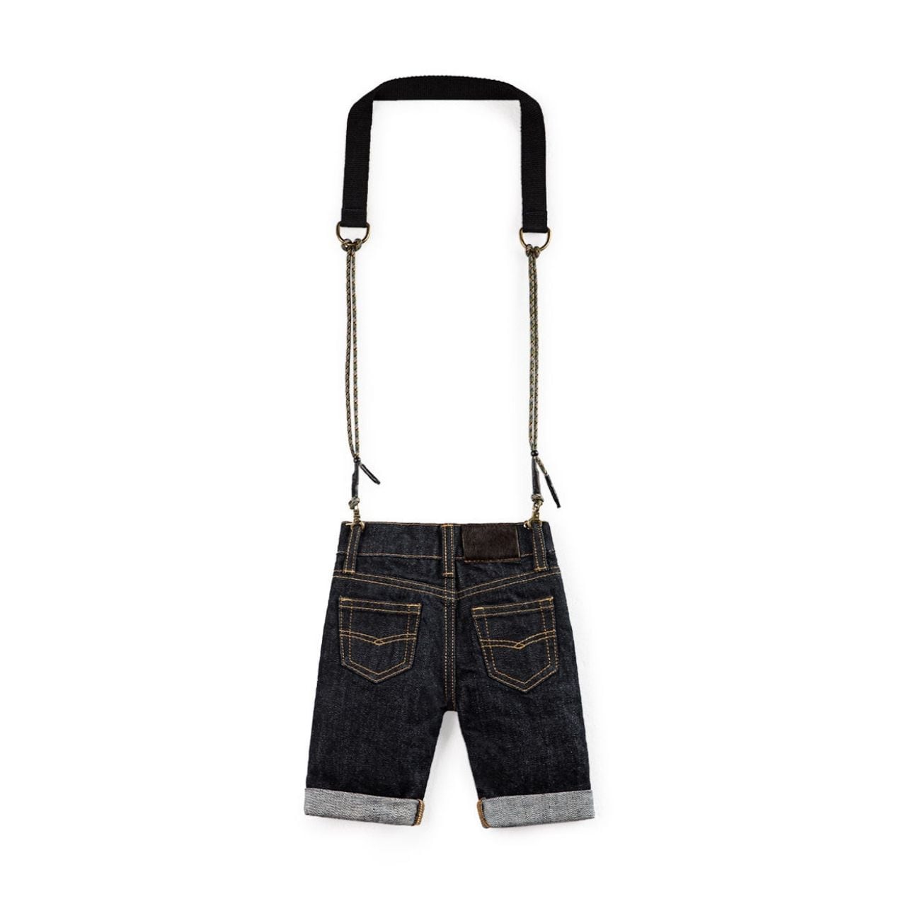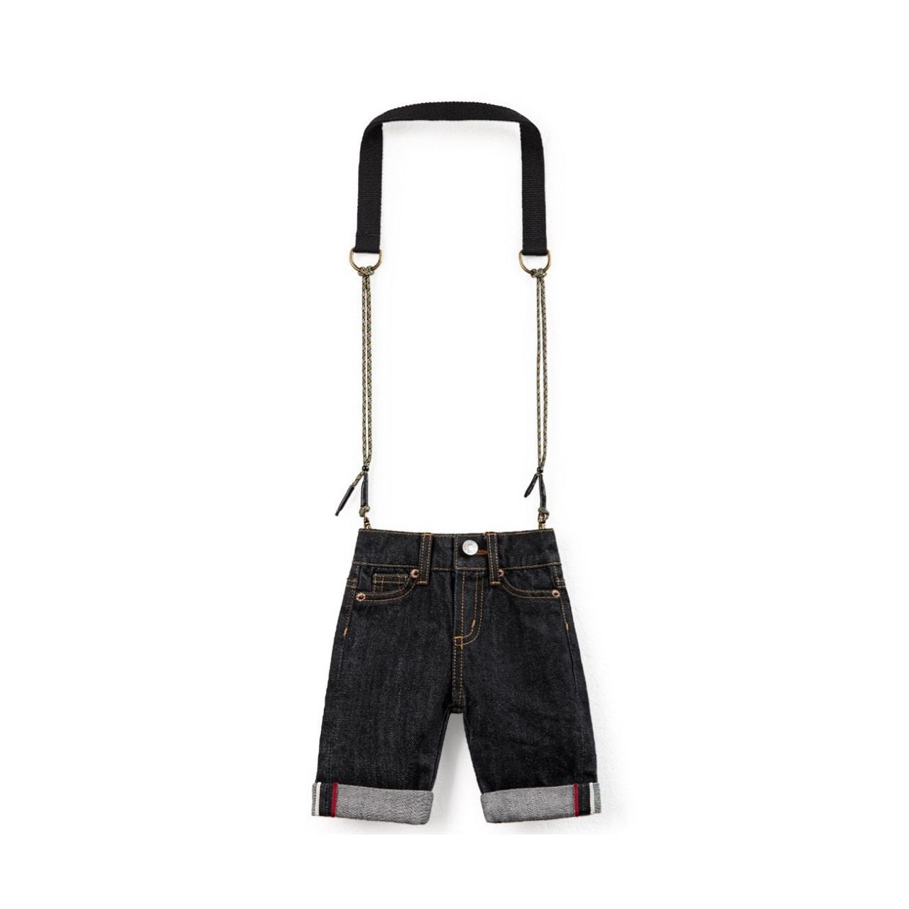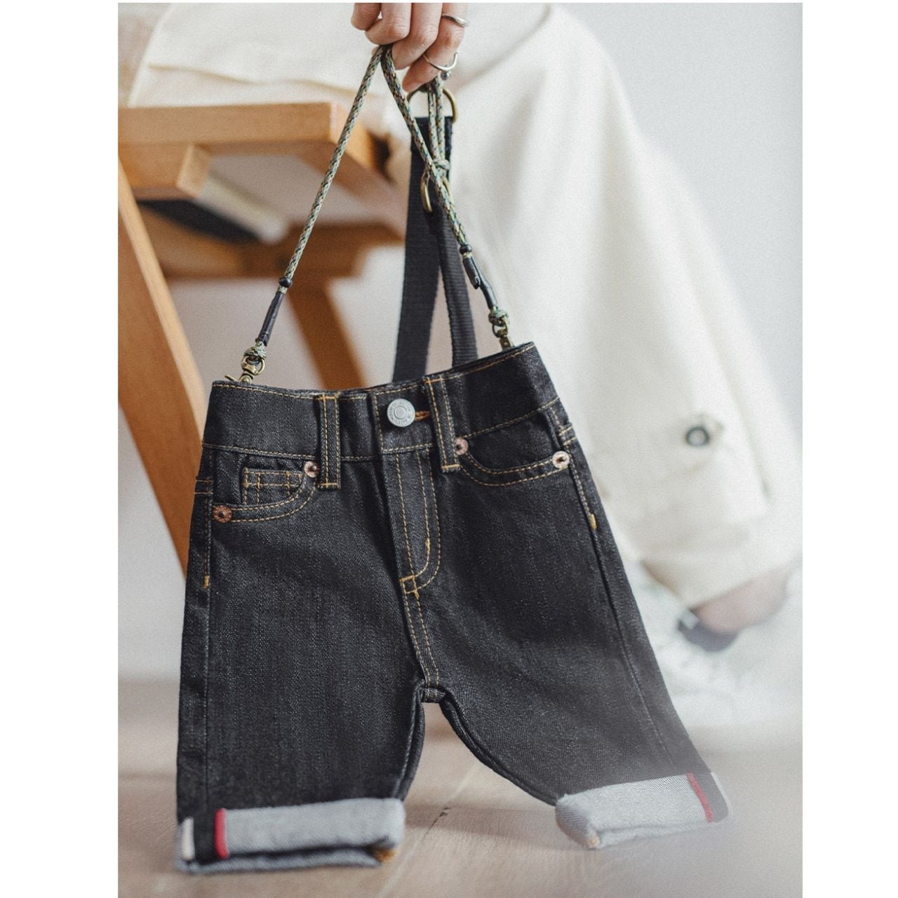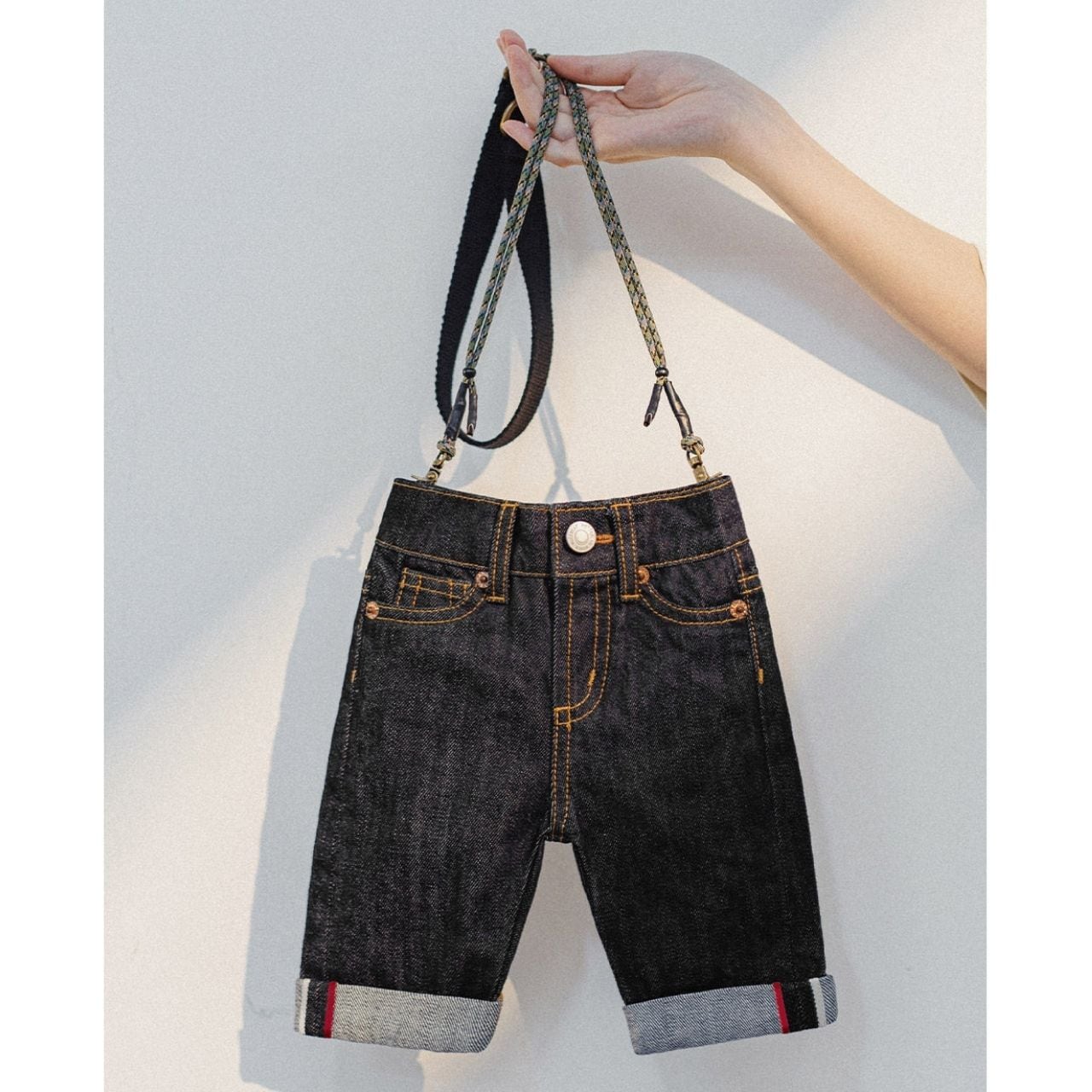 デニムパンツをそのままミニバッグに落とし込んだ、遊び心たっぷりのデザイン。