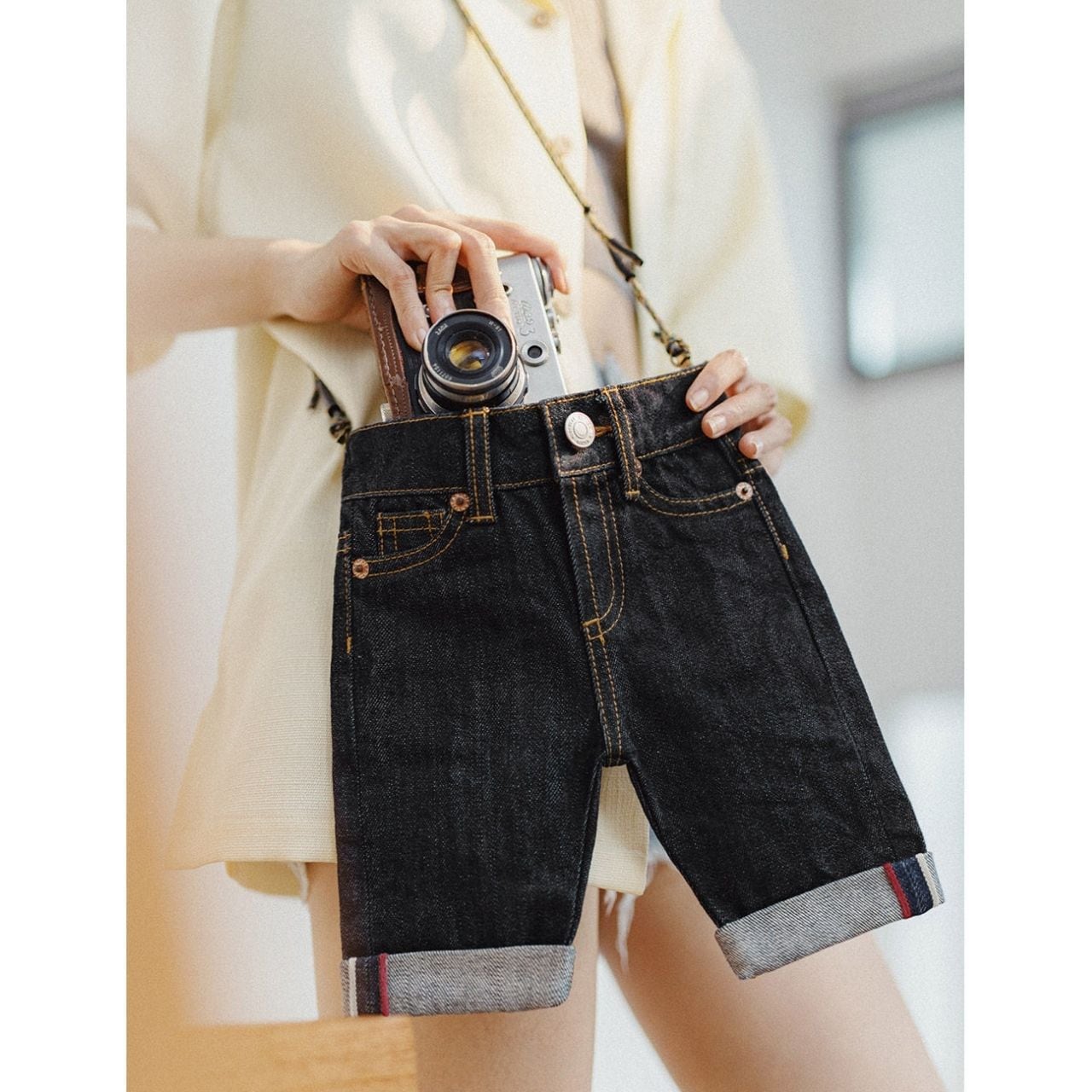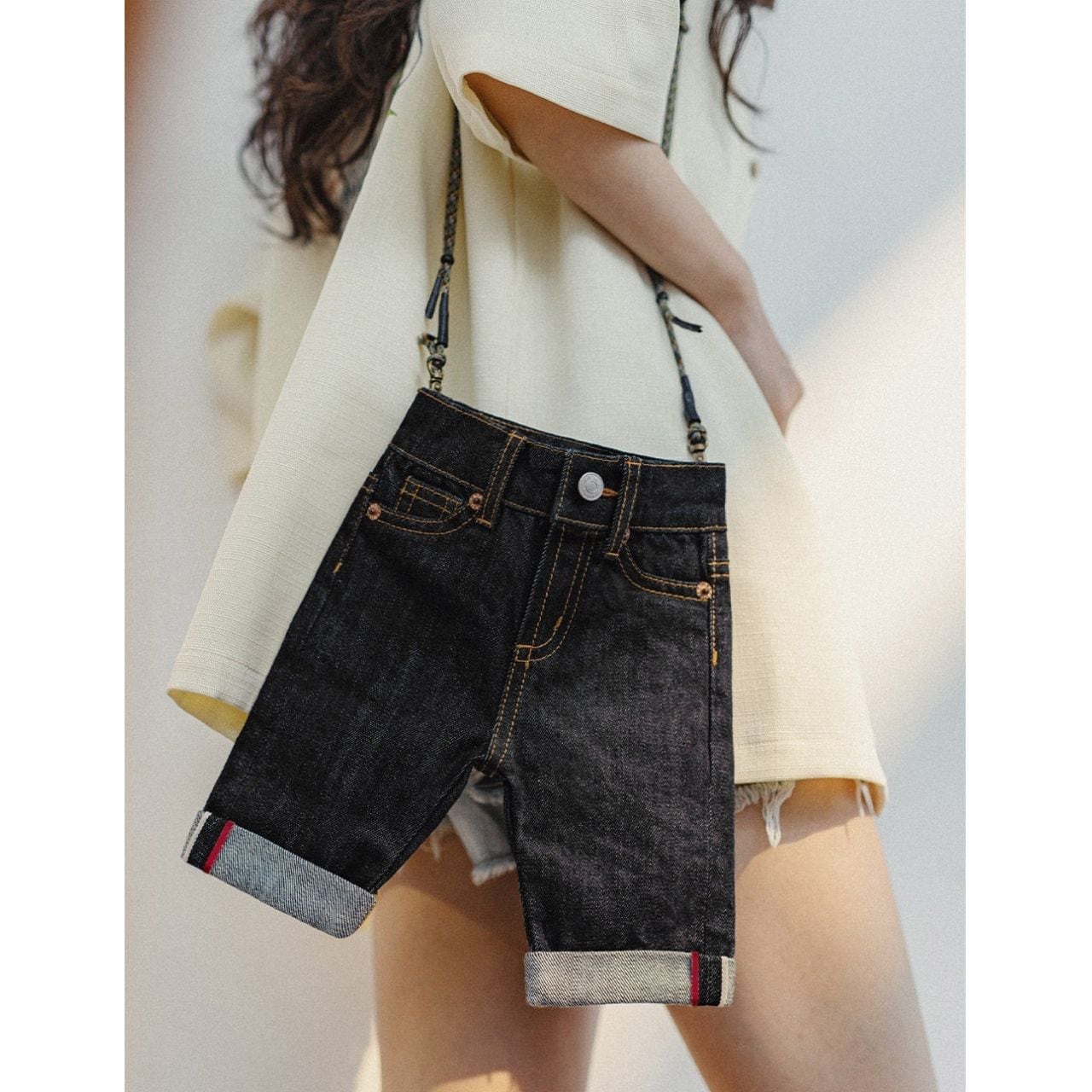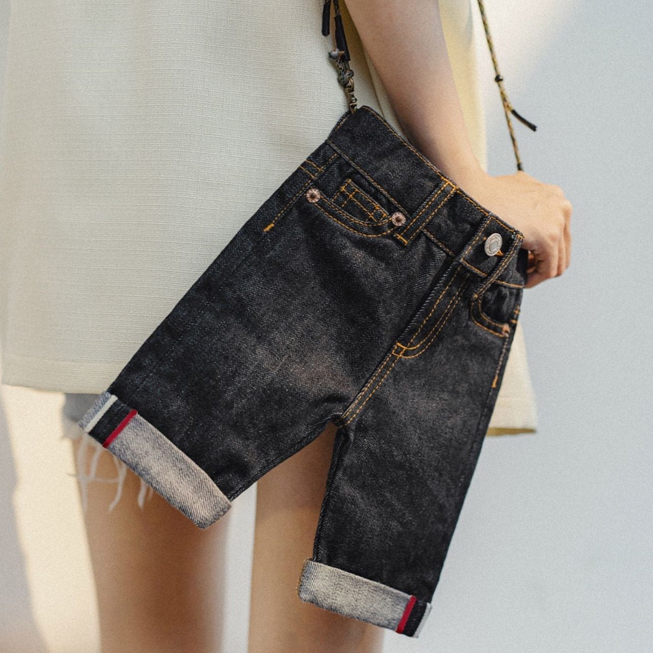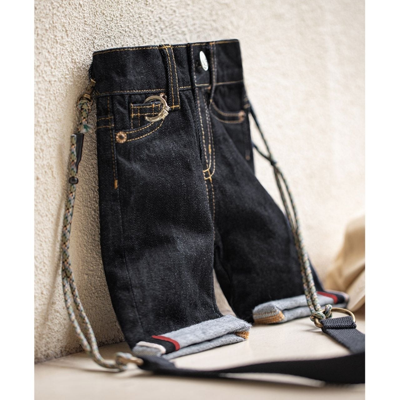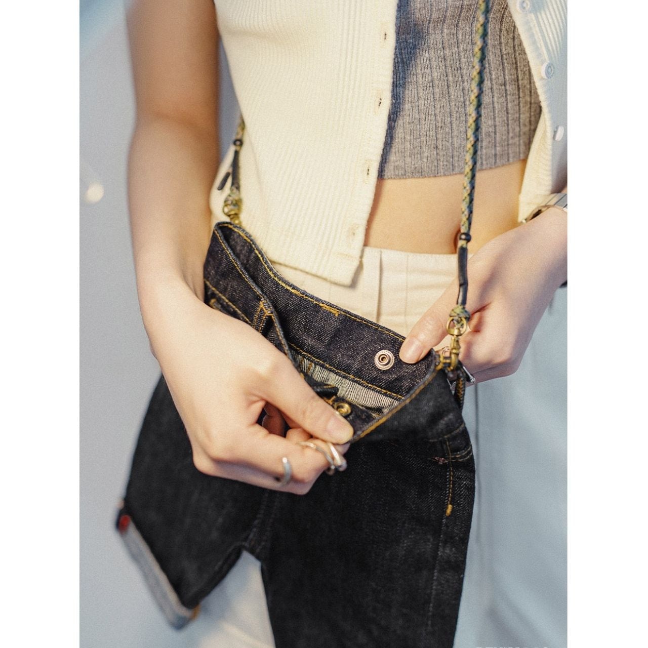 デニムパンツをそのままミニバッグに落とし込んだ、遊び心たっぷりのデザイン。