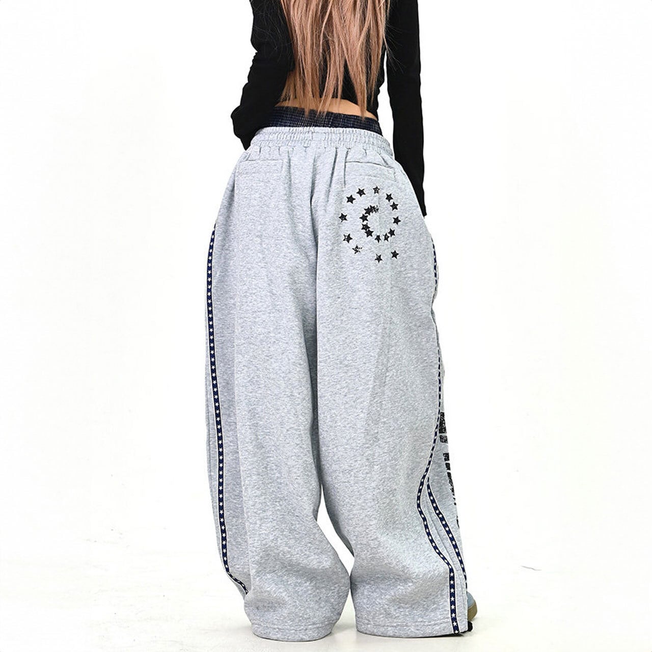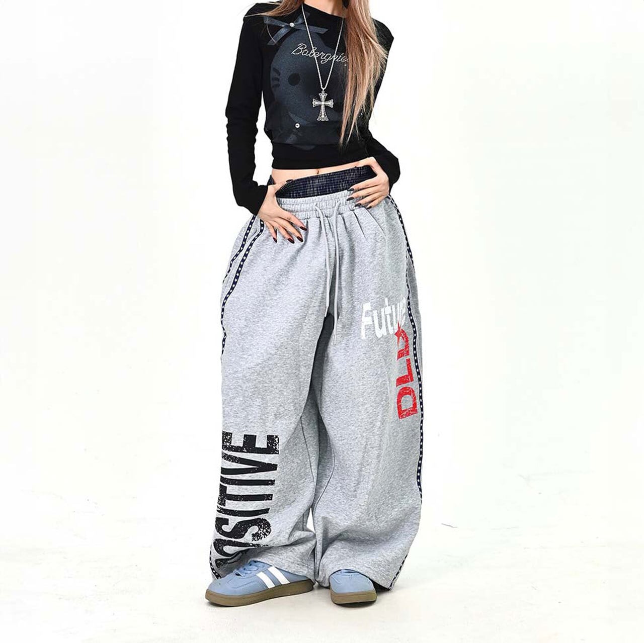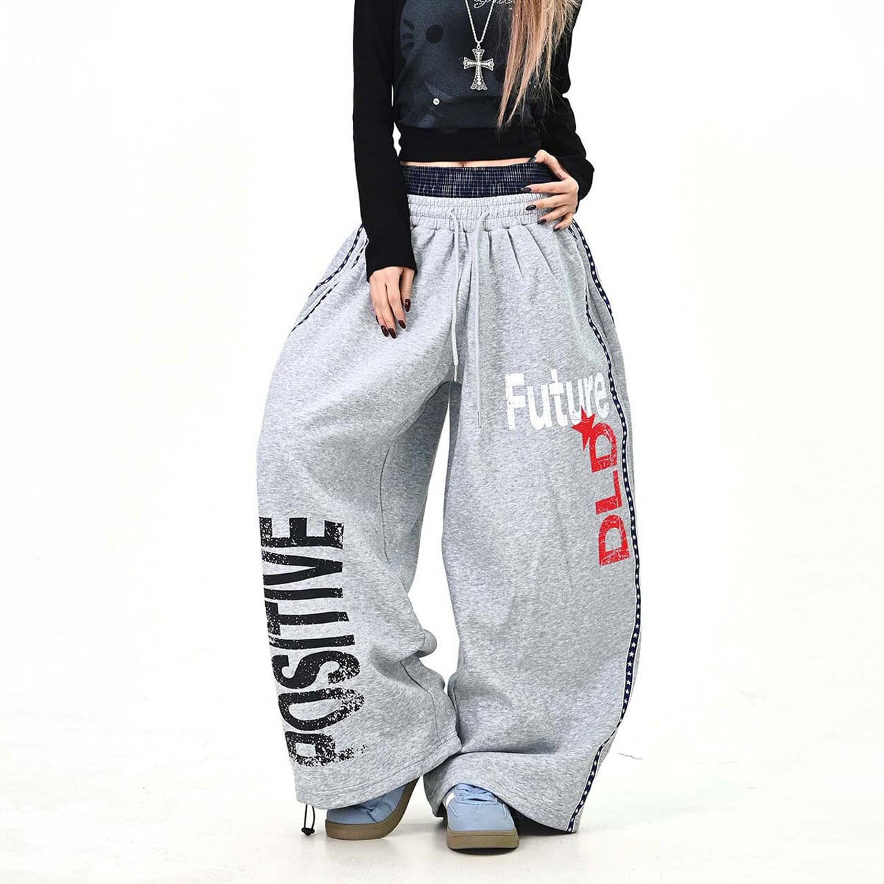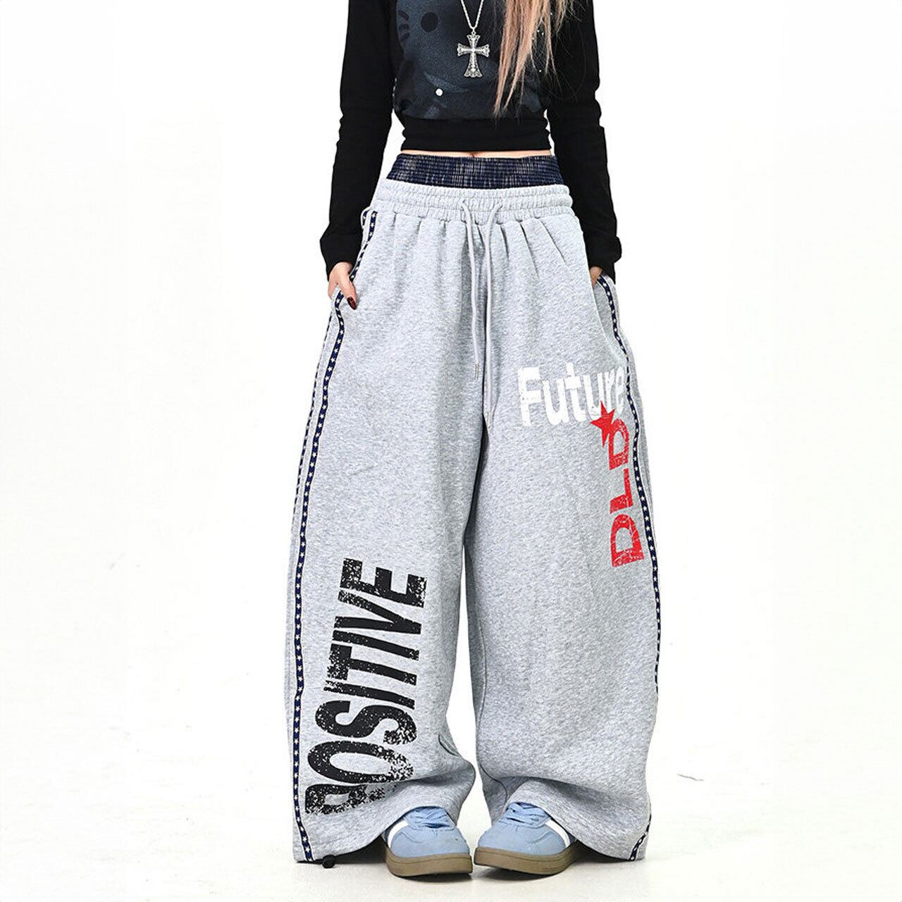 大胆なロゴプリントがストリート感を高めるワイドスウェットパンツ。