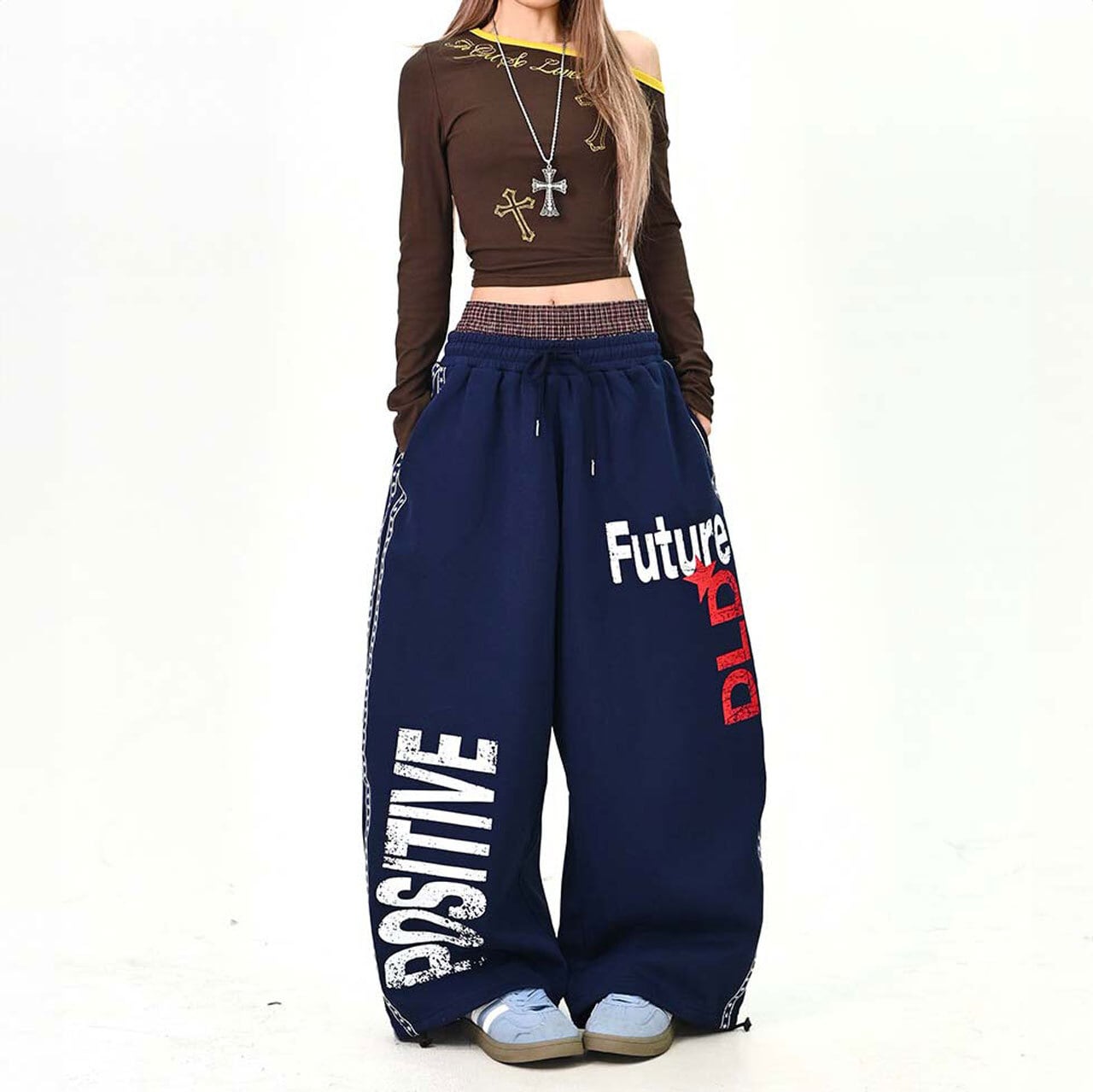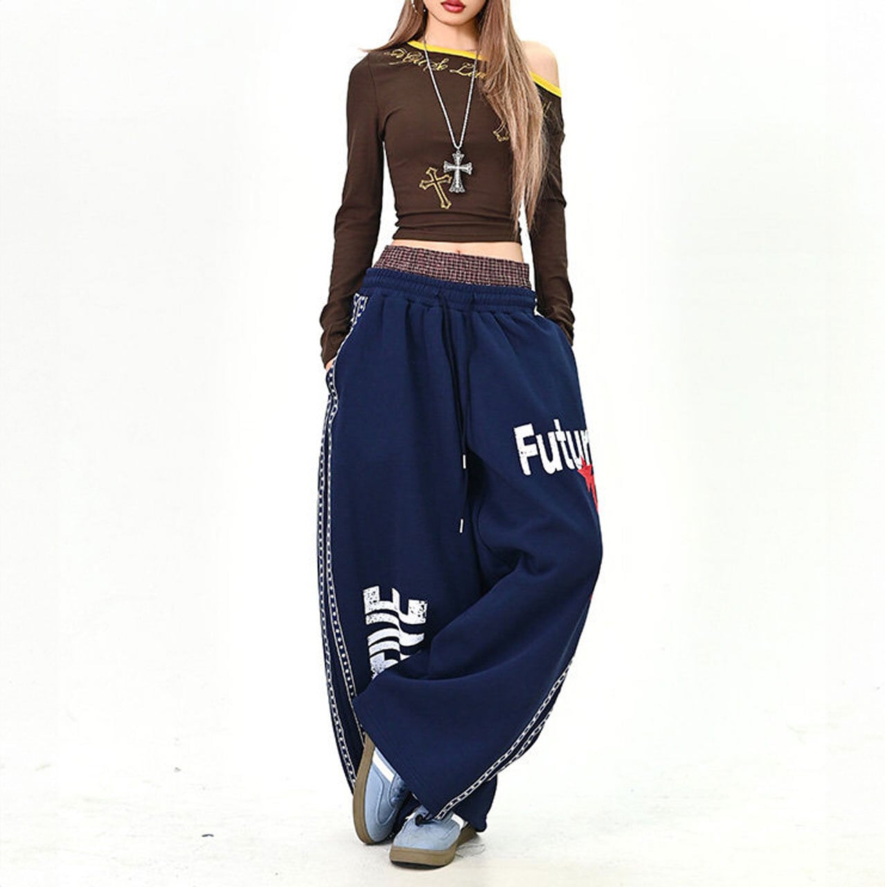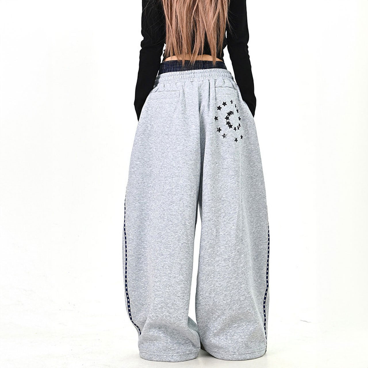 大胆なロゴプリントがストリート感を高めるワイドスウェットパンツ。