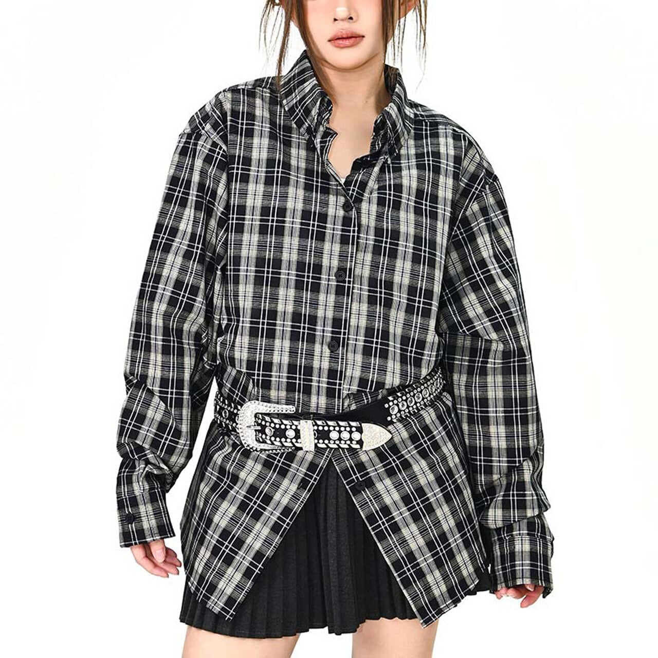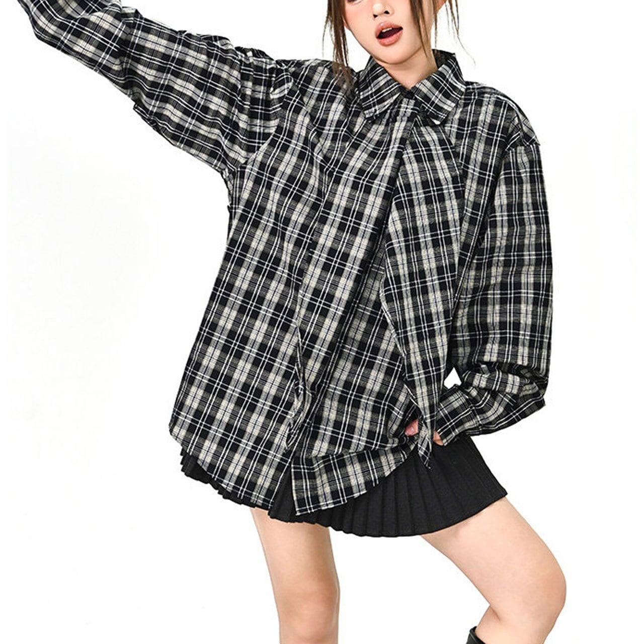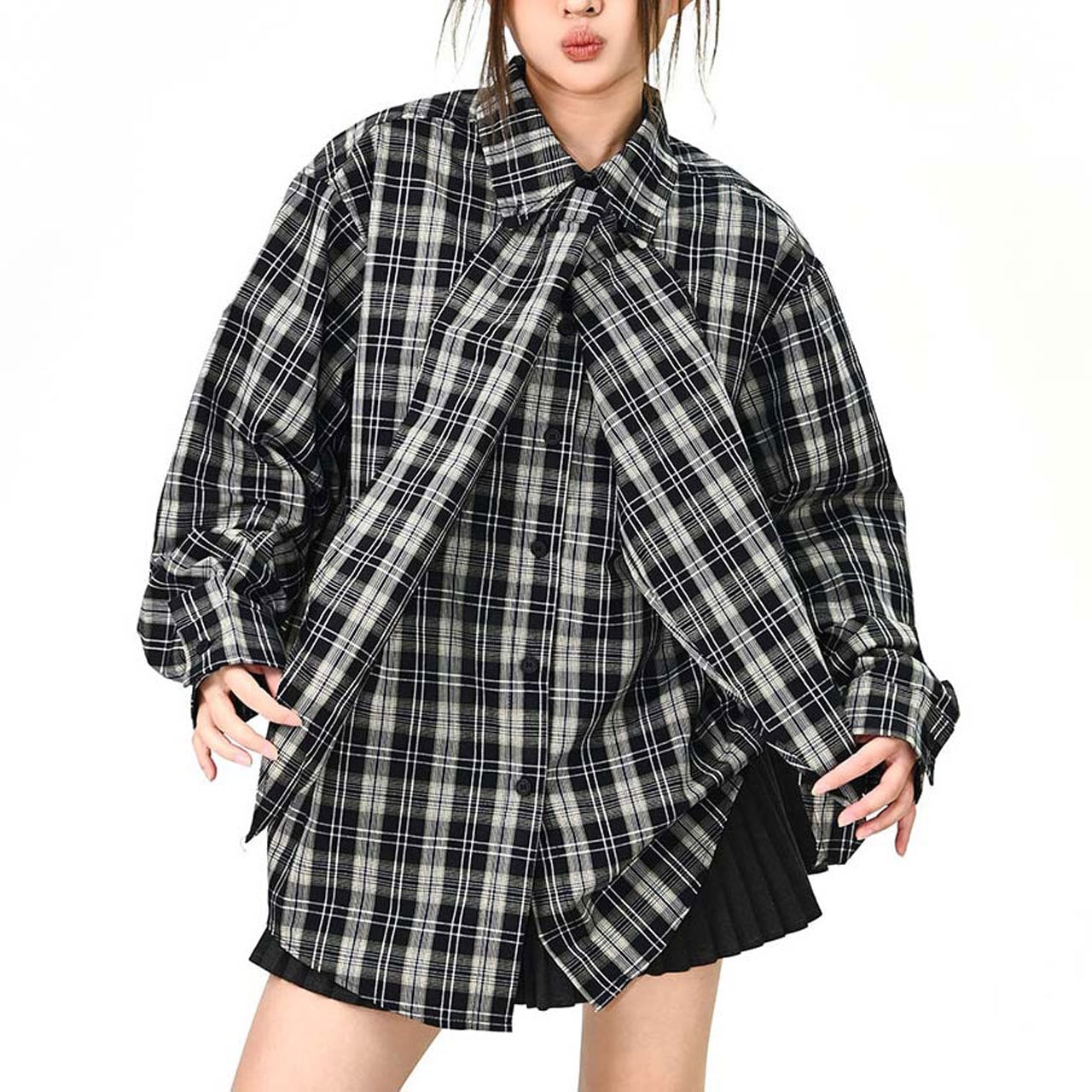チェック柄が目を引く、存在感のあるオーバーサイズシャツ。
