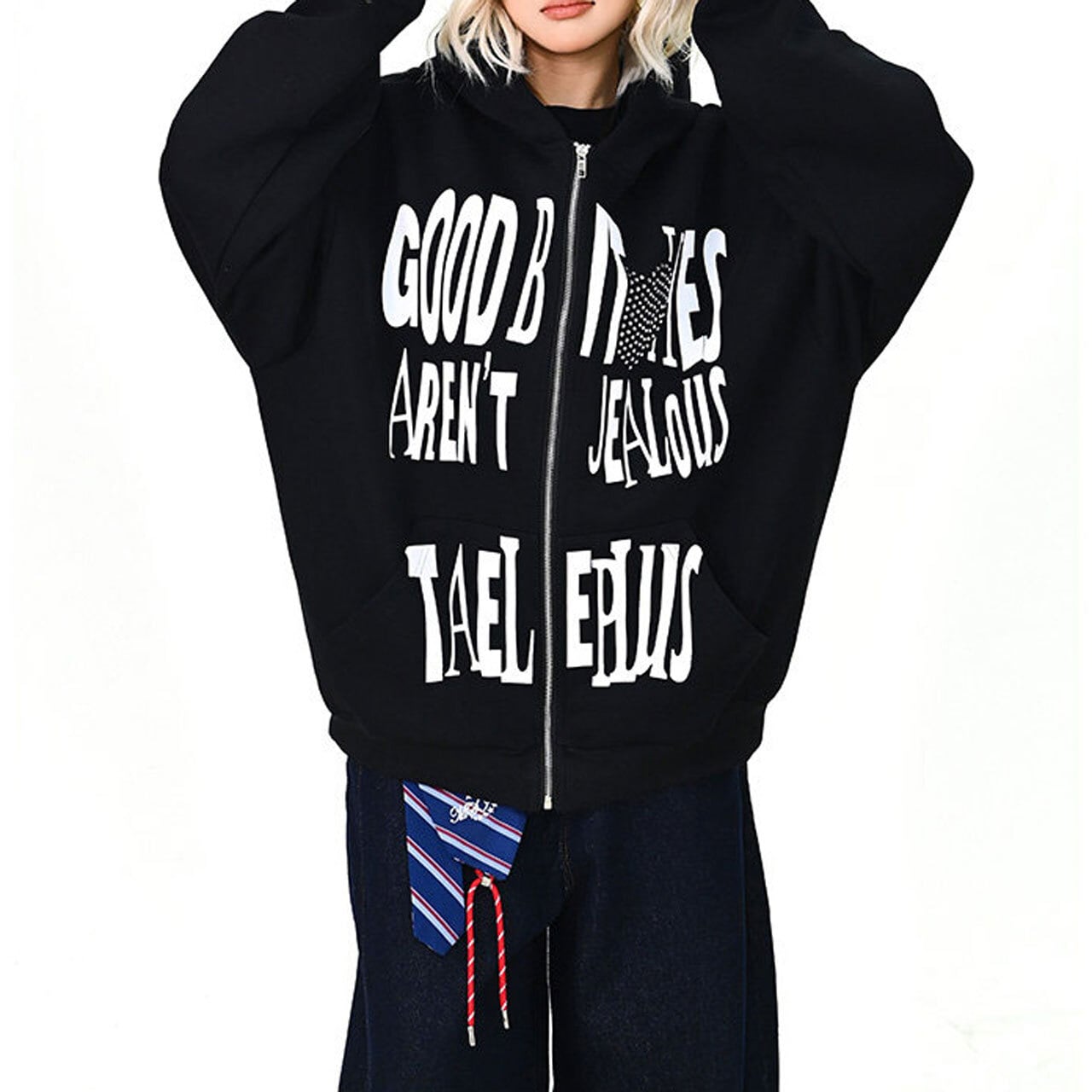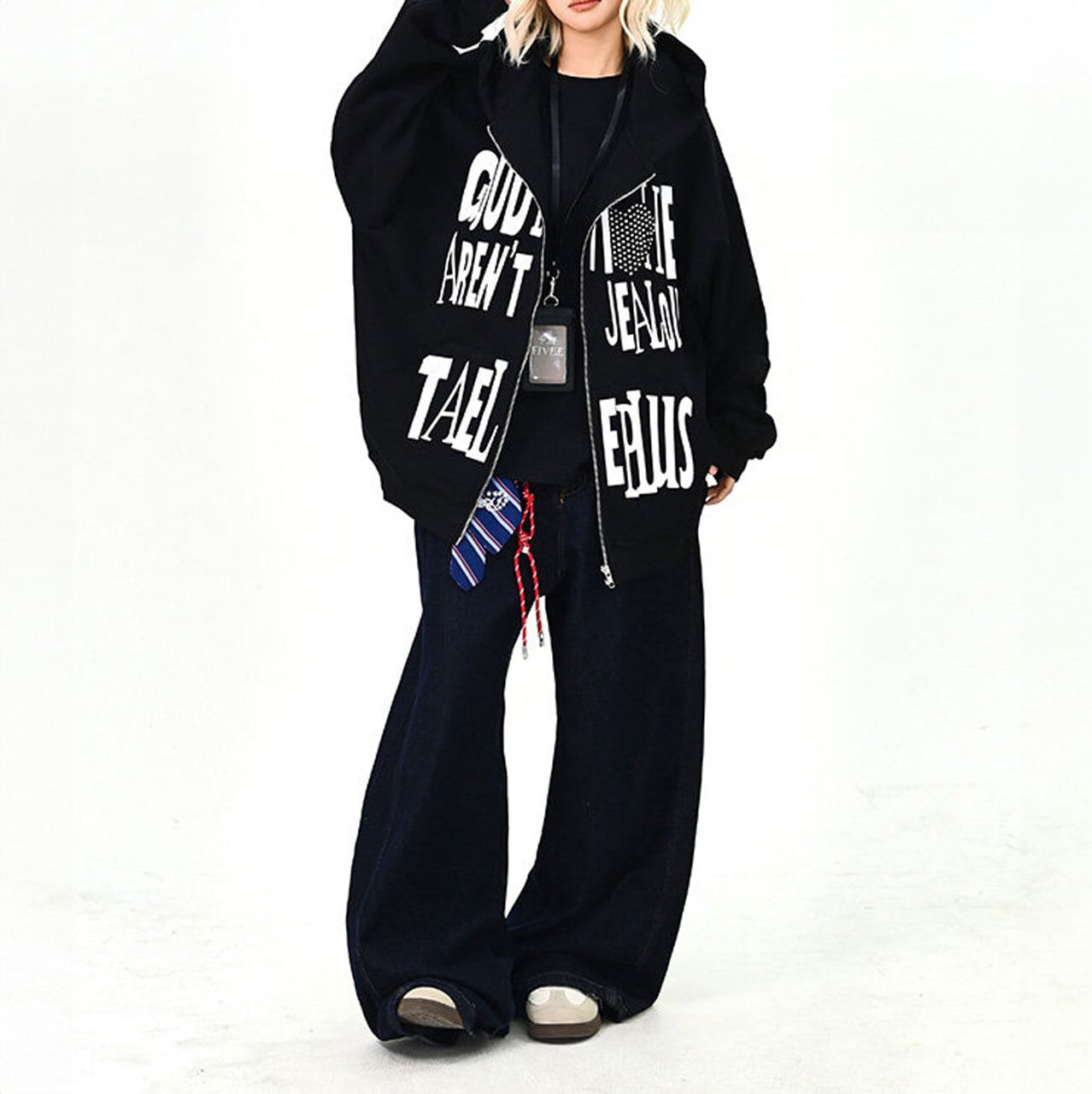 大胆なロゴプリントが印象的な、ストリートムード漂うフーディ。