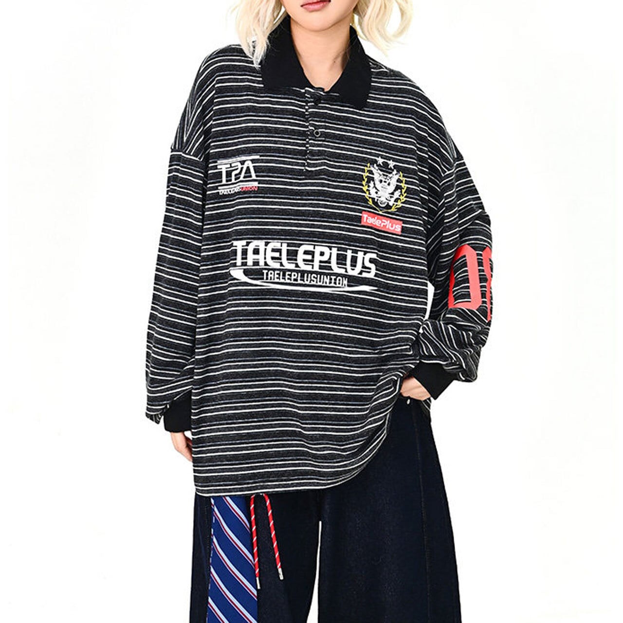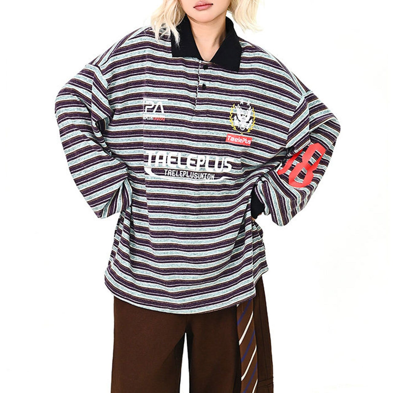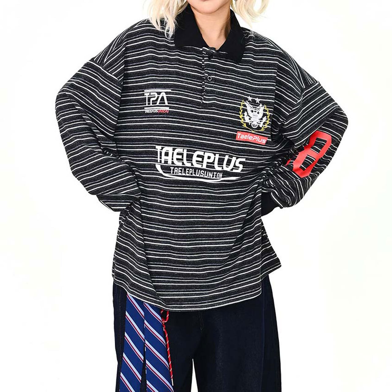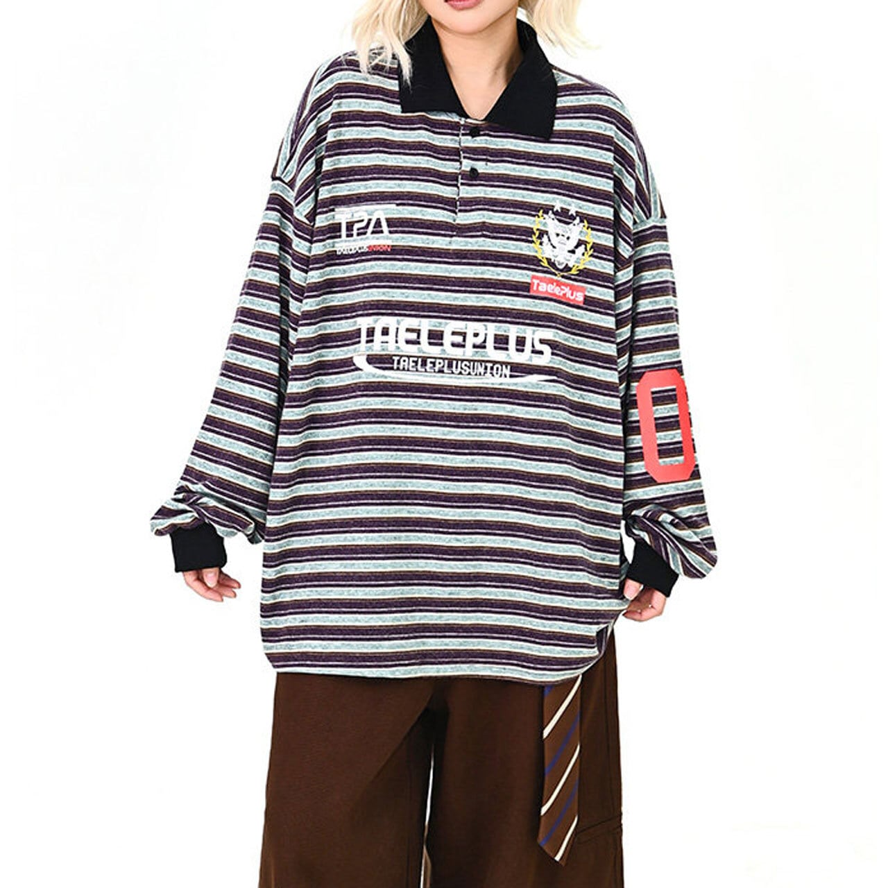 マルチボーダーにロゴを効かせた、存在感のあるトップス。