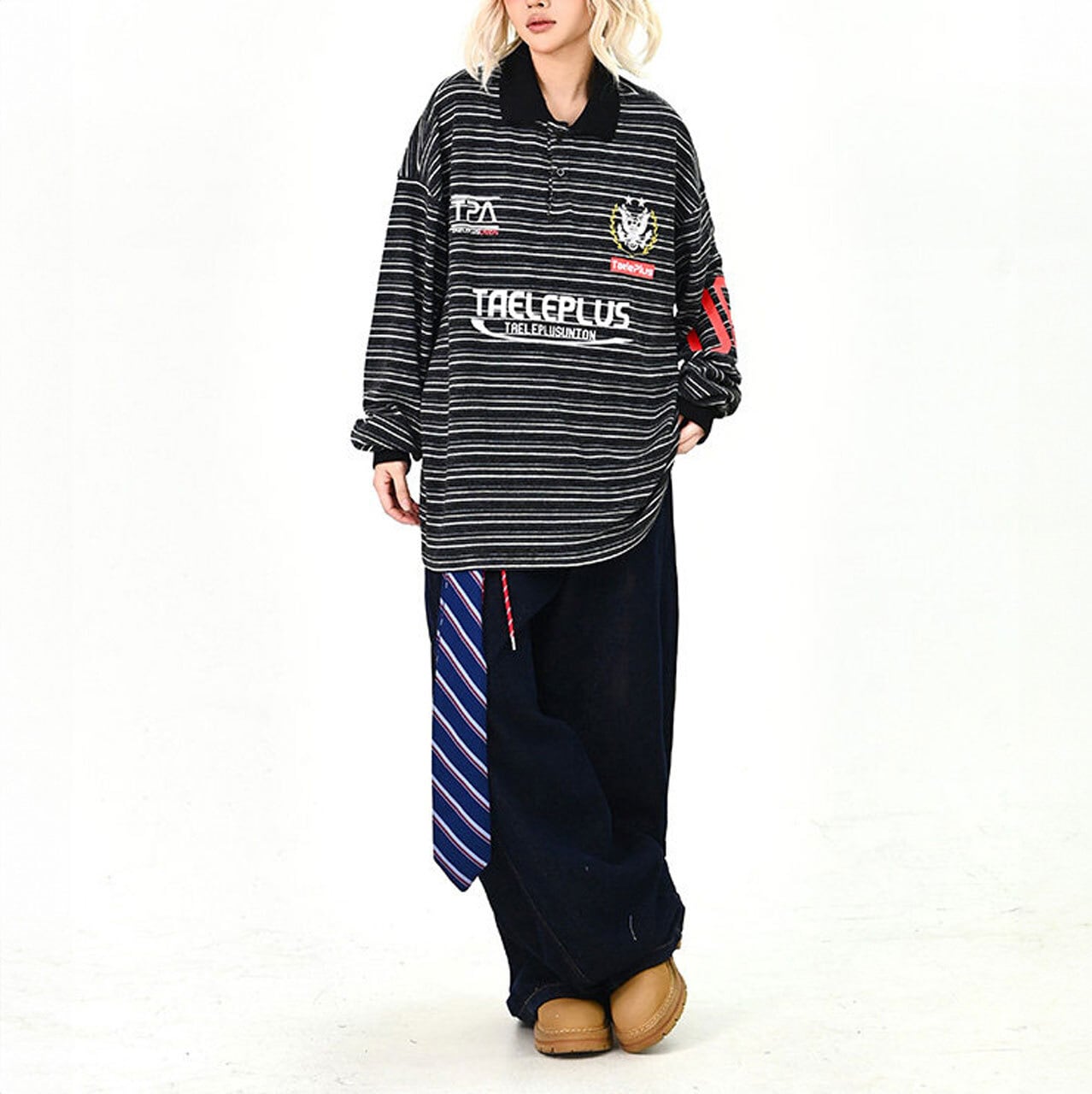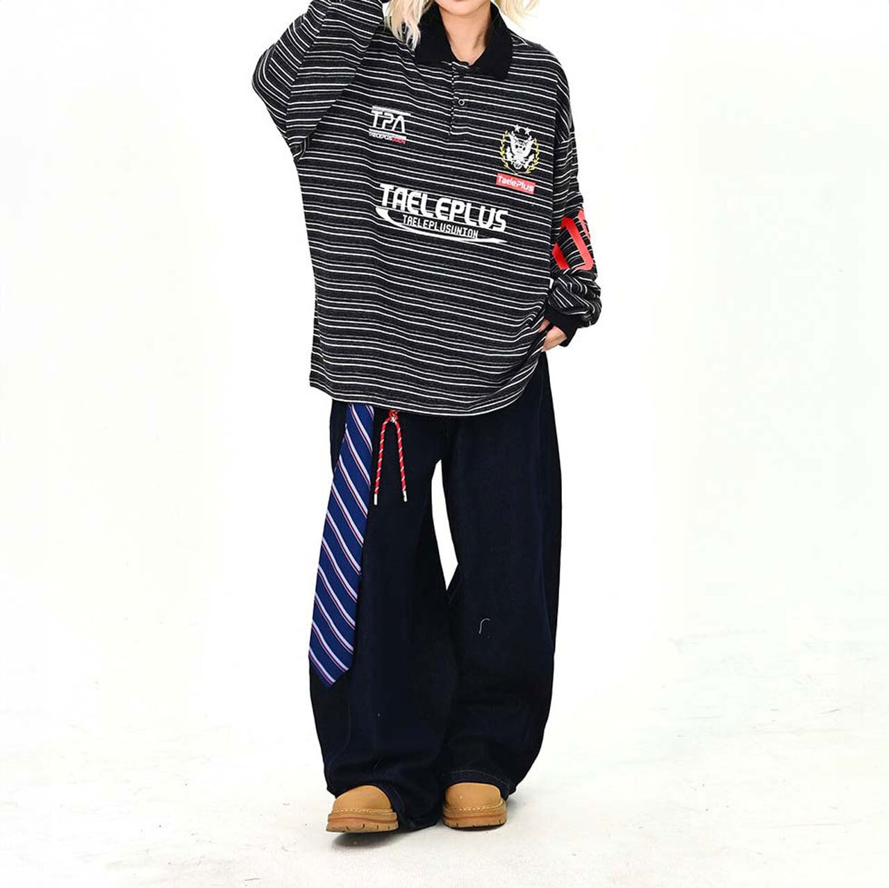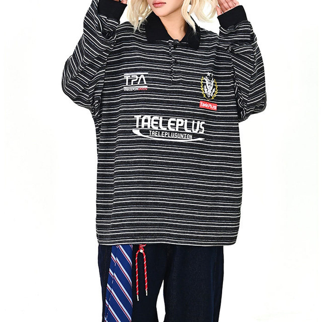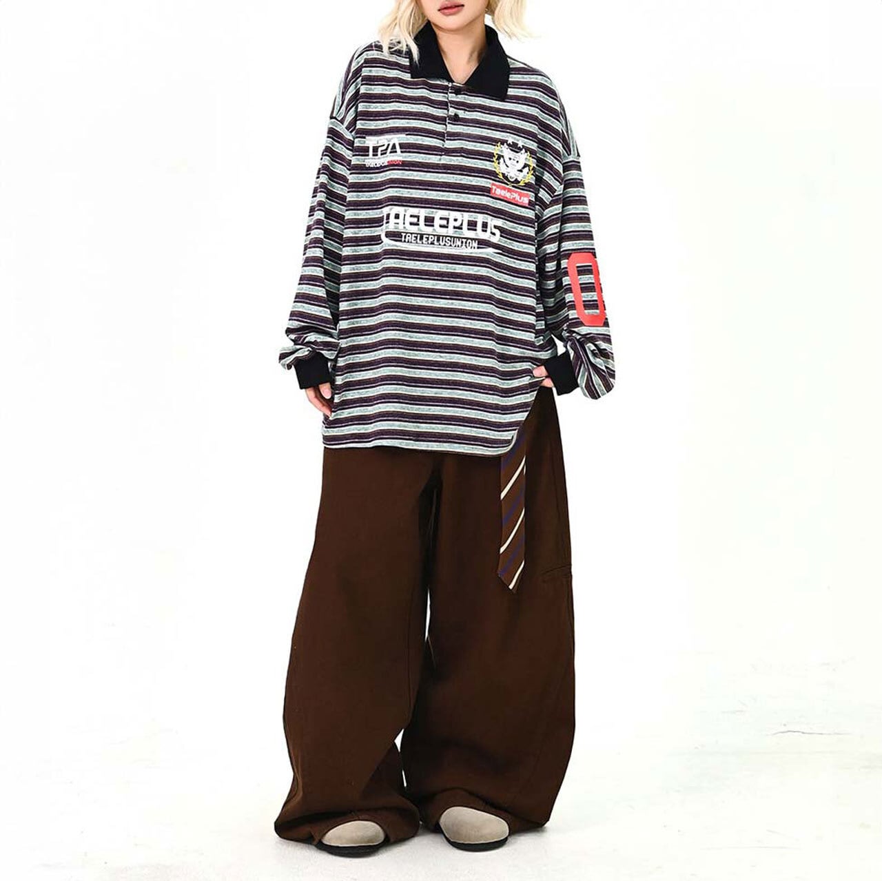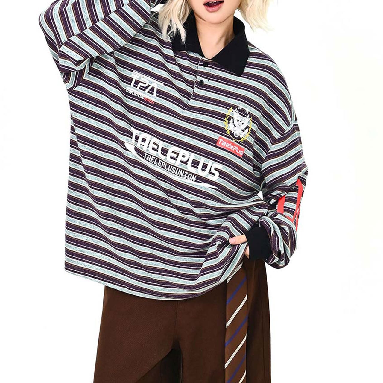 マルチボーダーにロゴを効かせた、存在感のあるトップス。