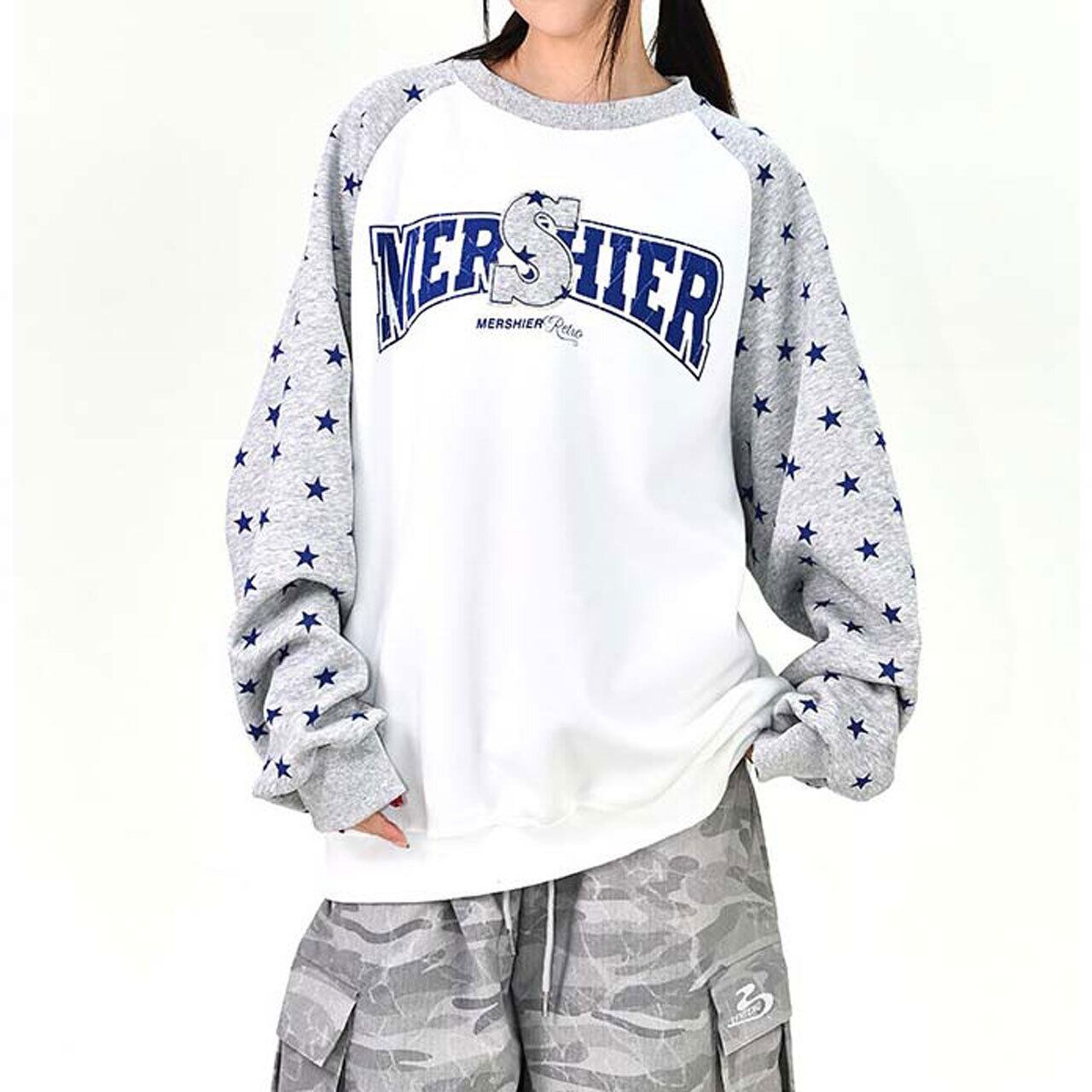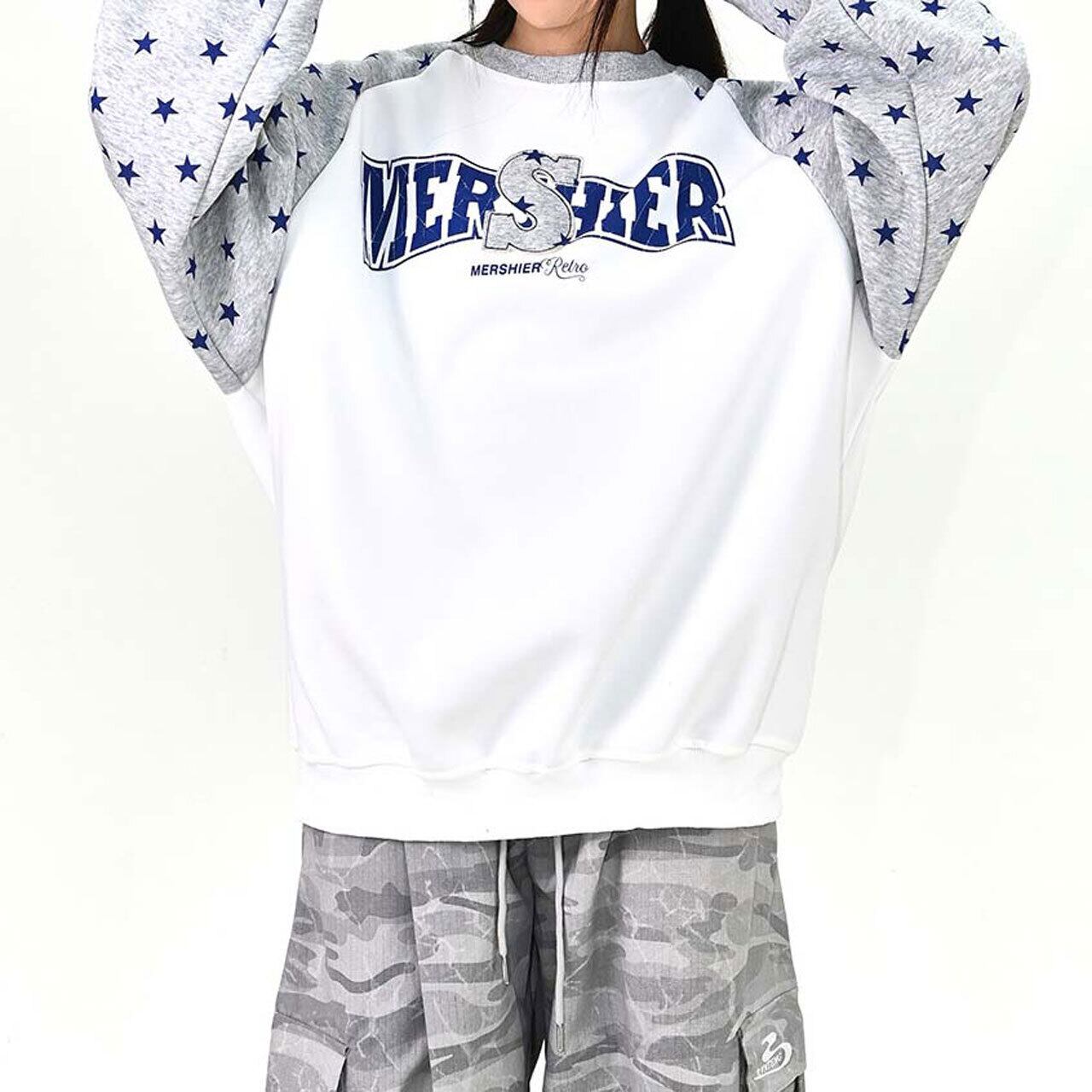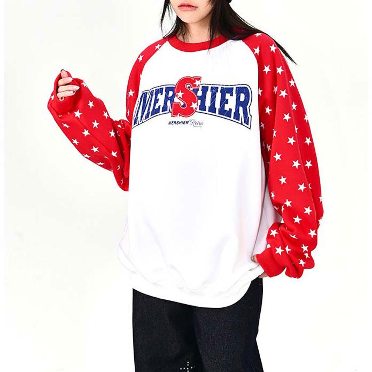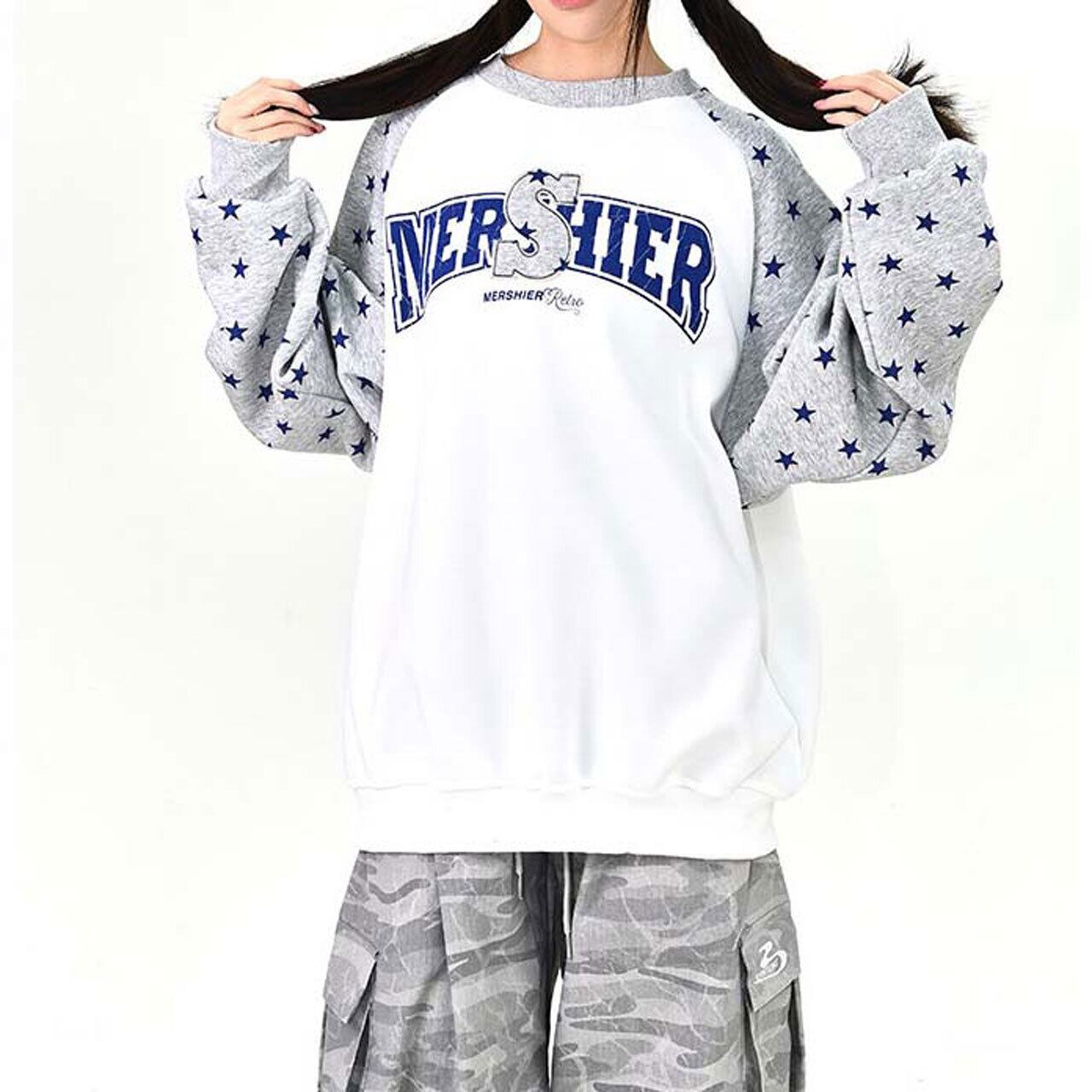 ロゴデザインと星柄スリーブの組み合わせが目を引く、遊び心のあるトップス。