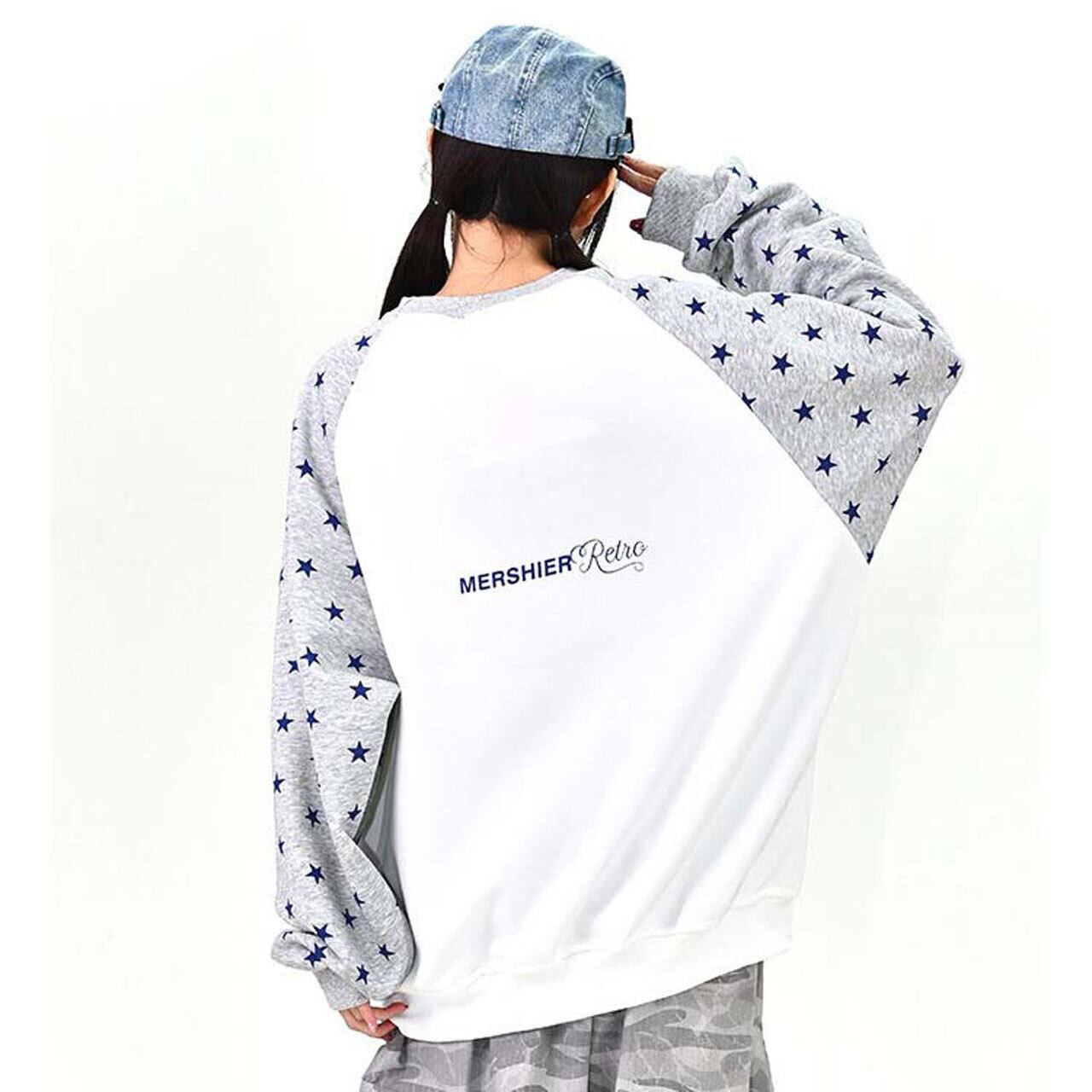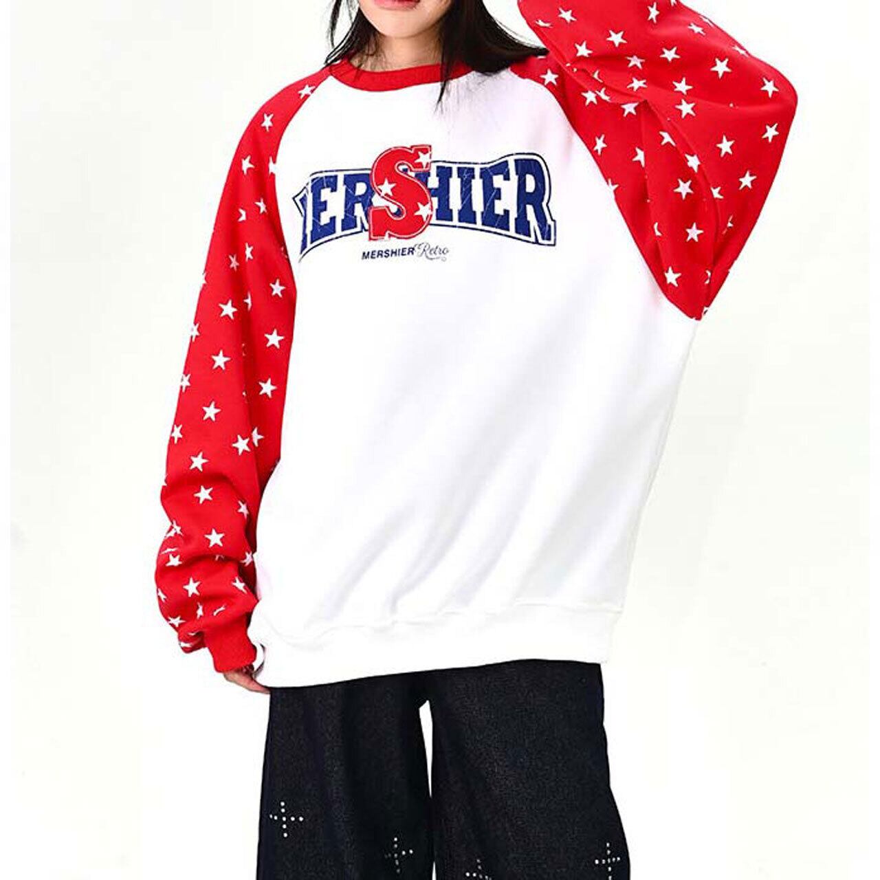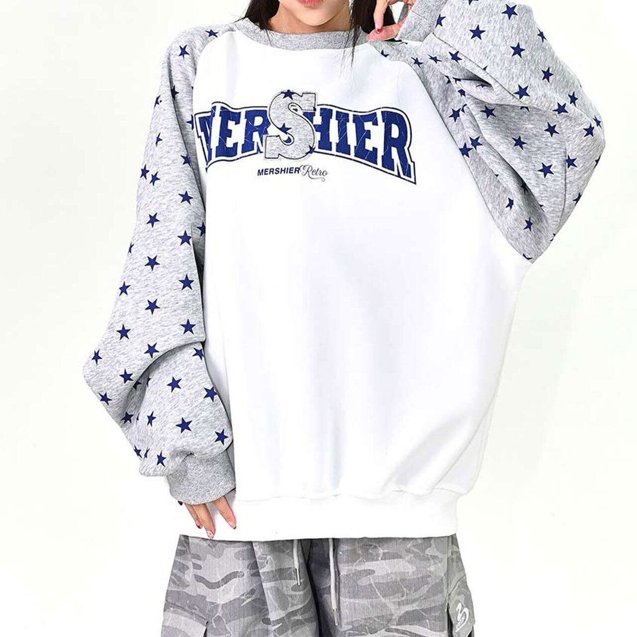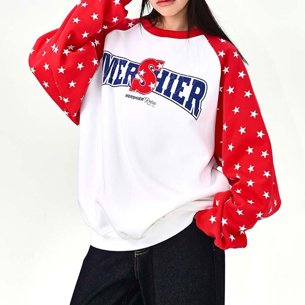 ロゴデザインと星柄スリーブの組み合わせが目を引く、遊び心のあるトップス。