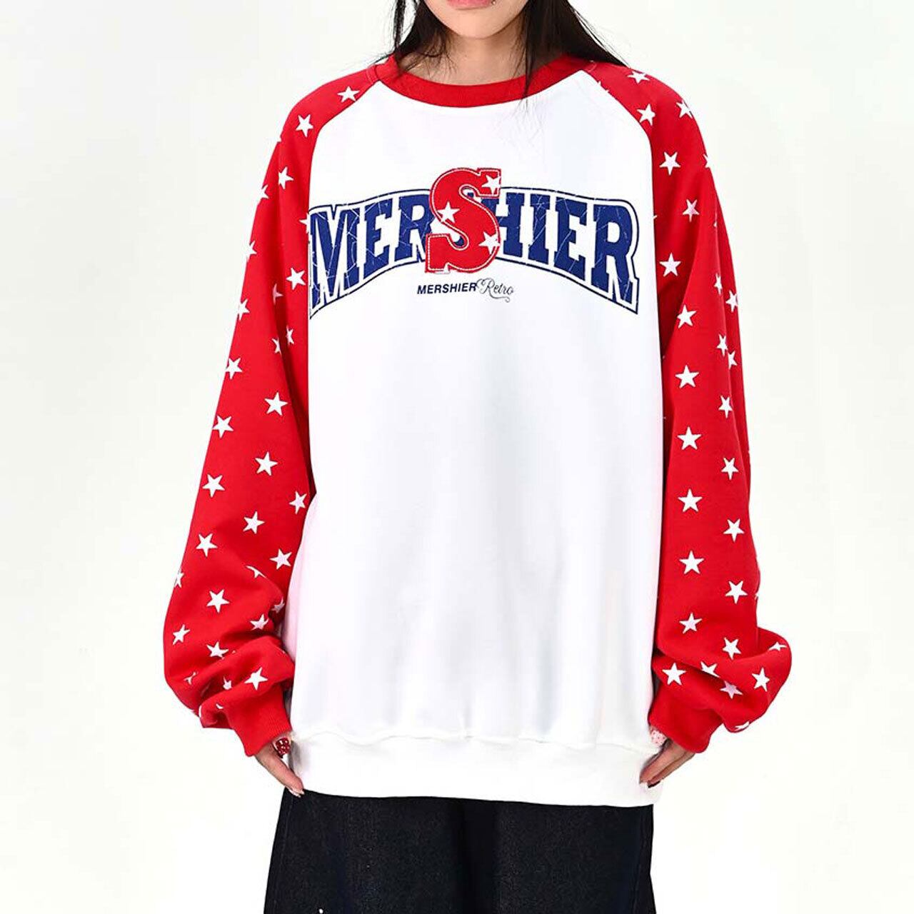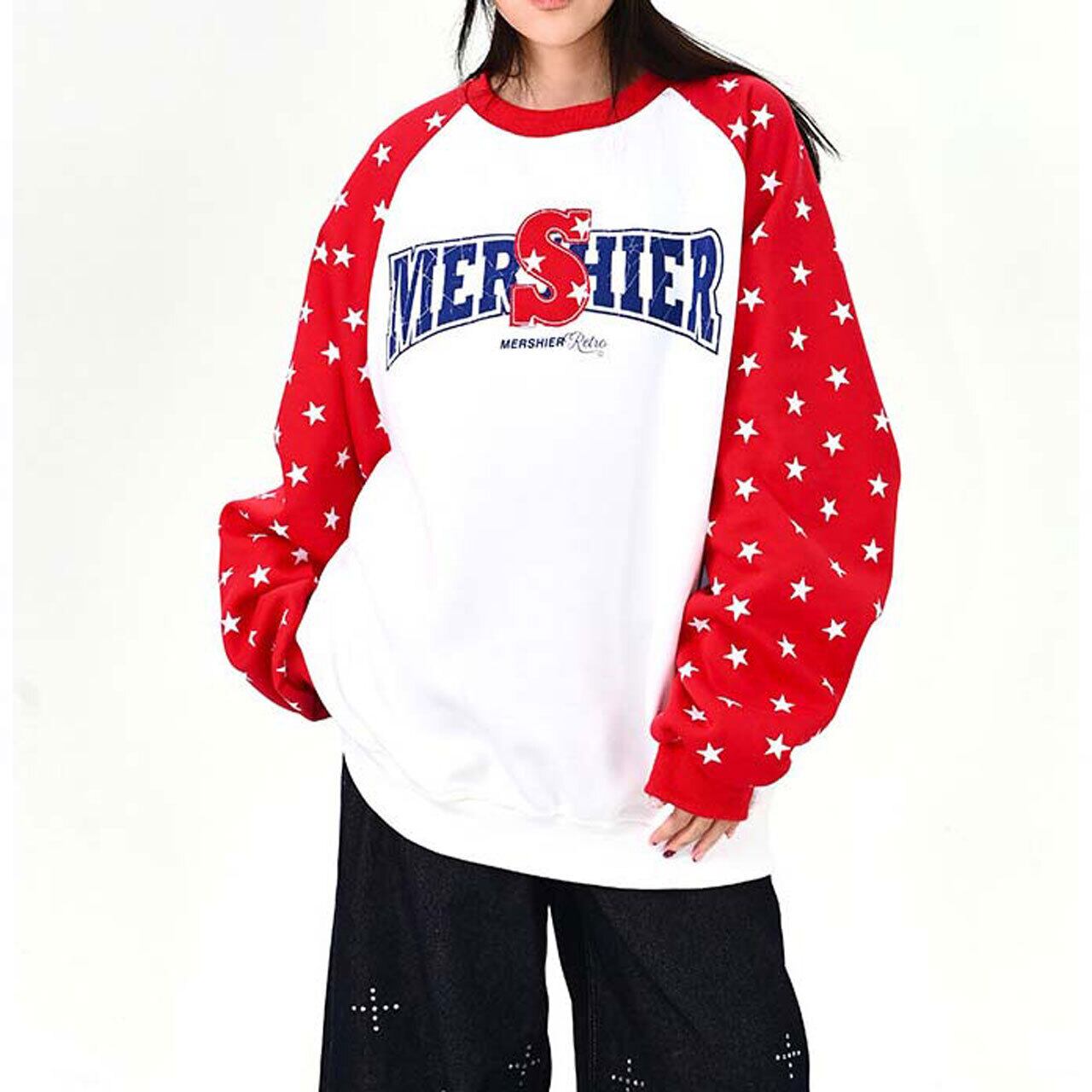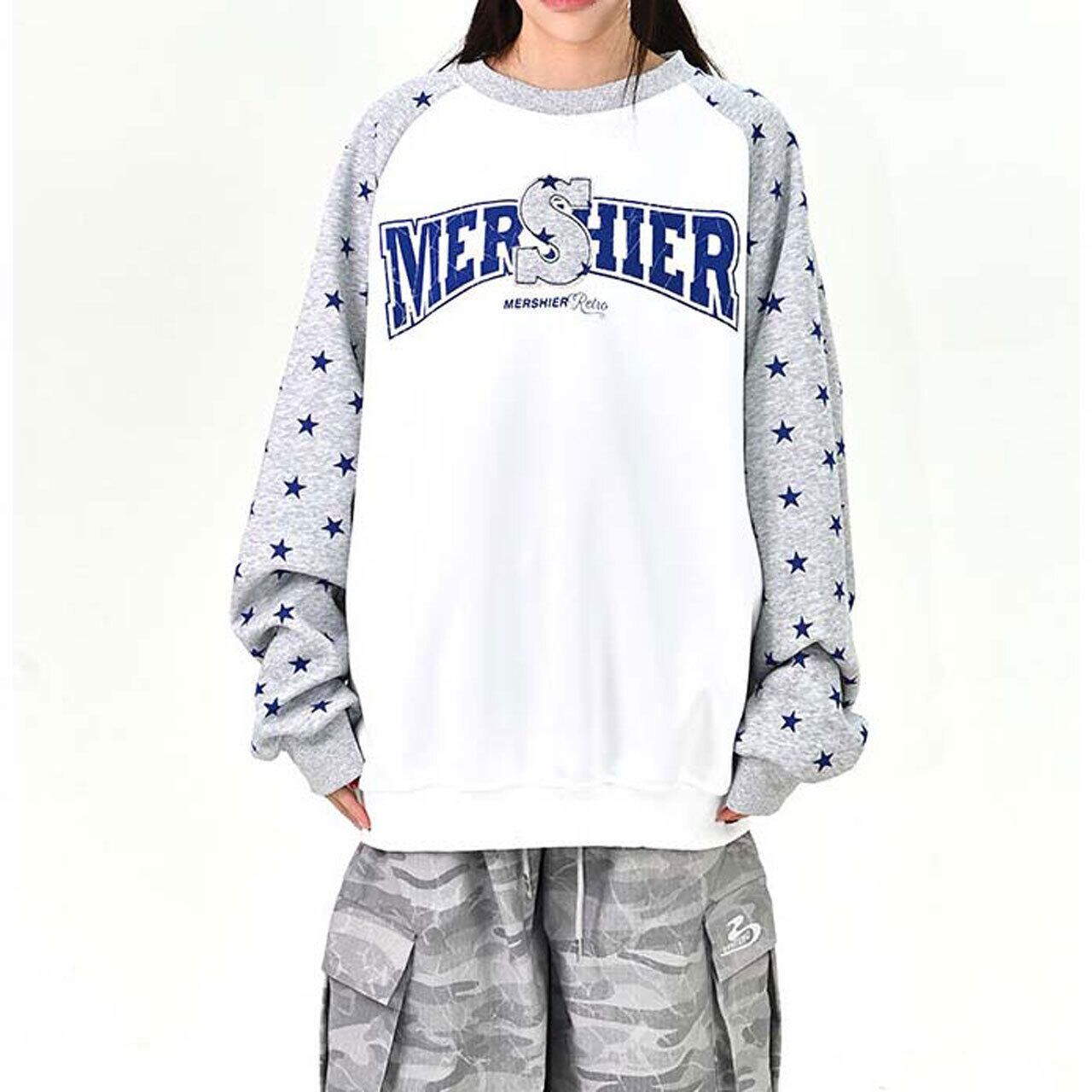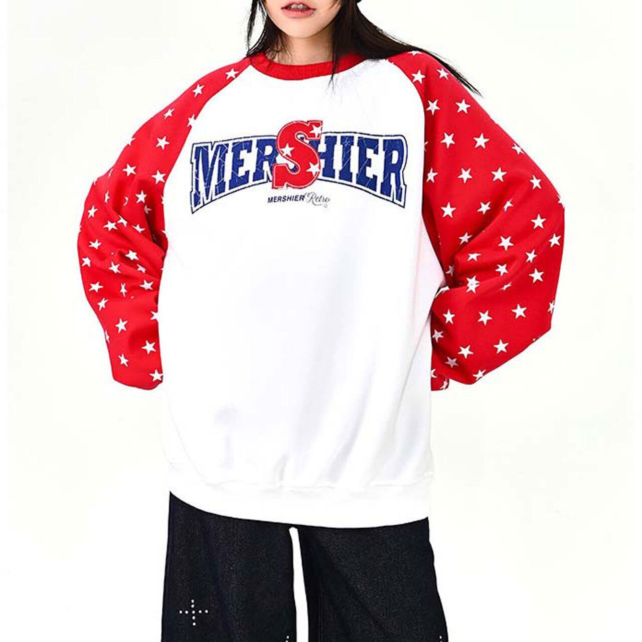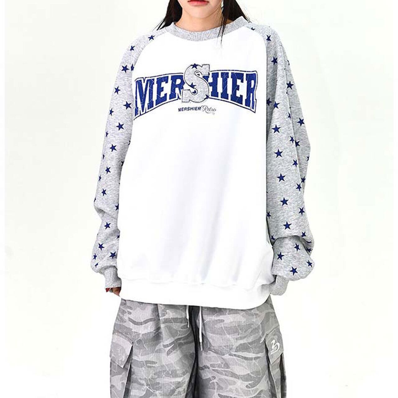 ロゴデザインと星柄スリーブの組み合わせが目を引く、遊び心のあるトップス。
