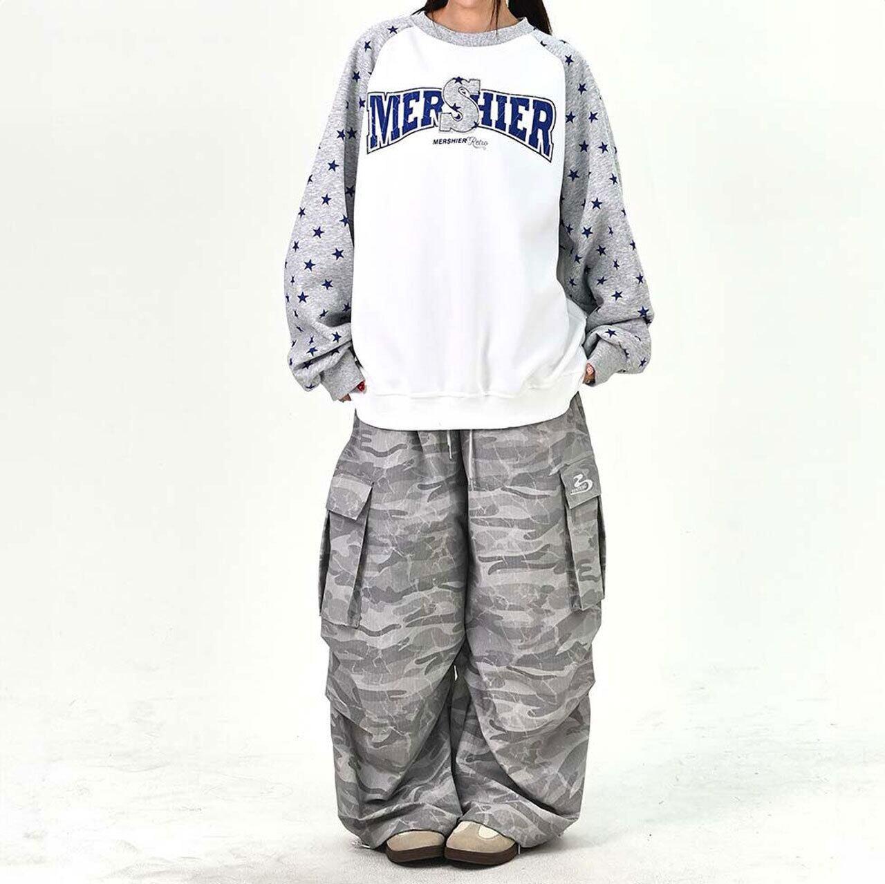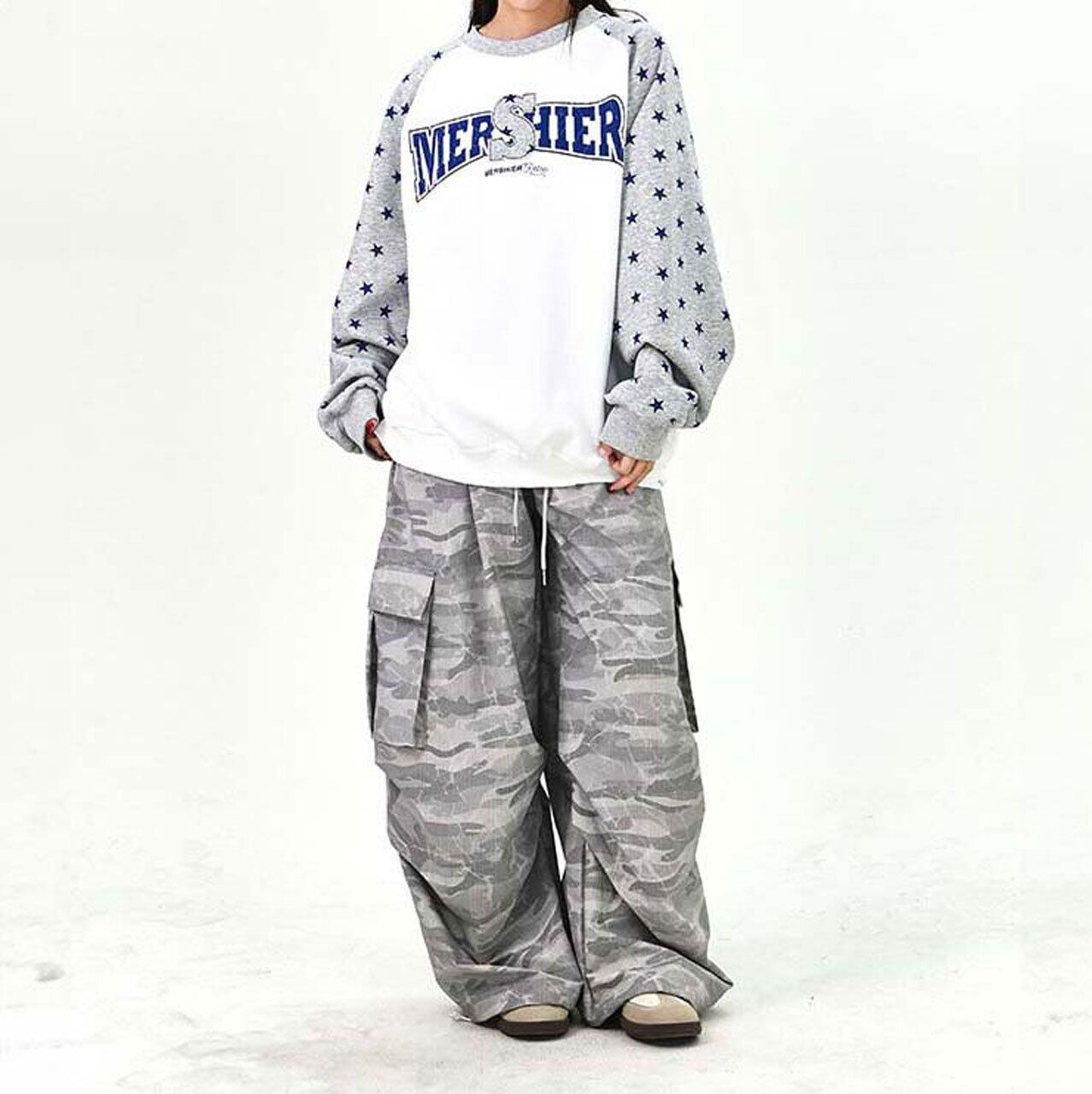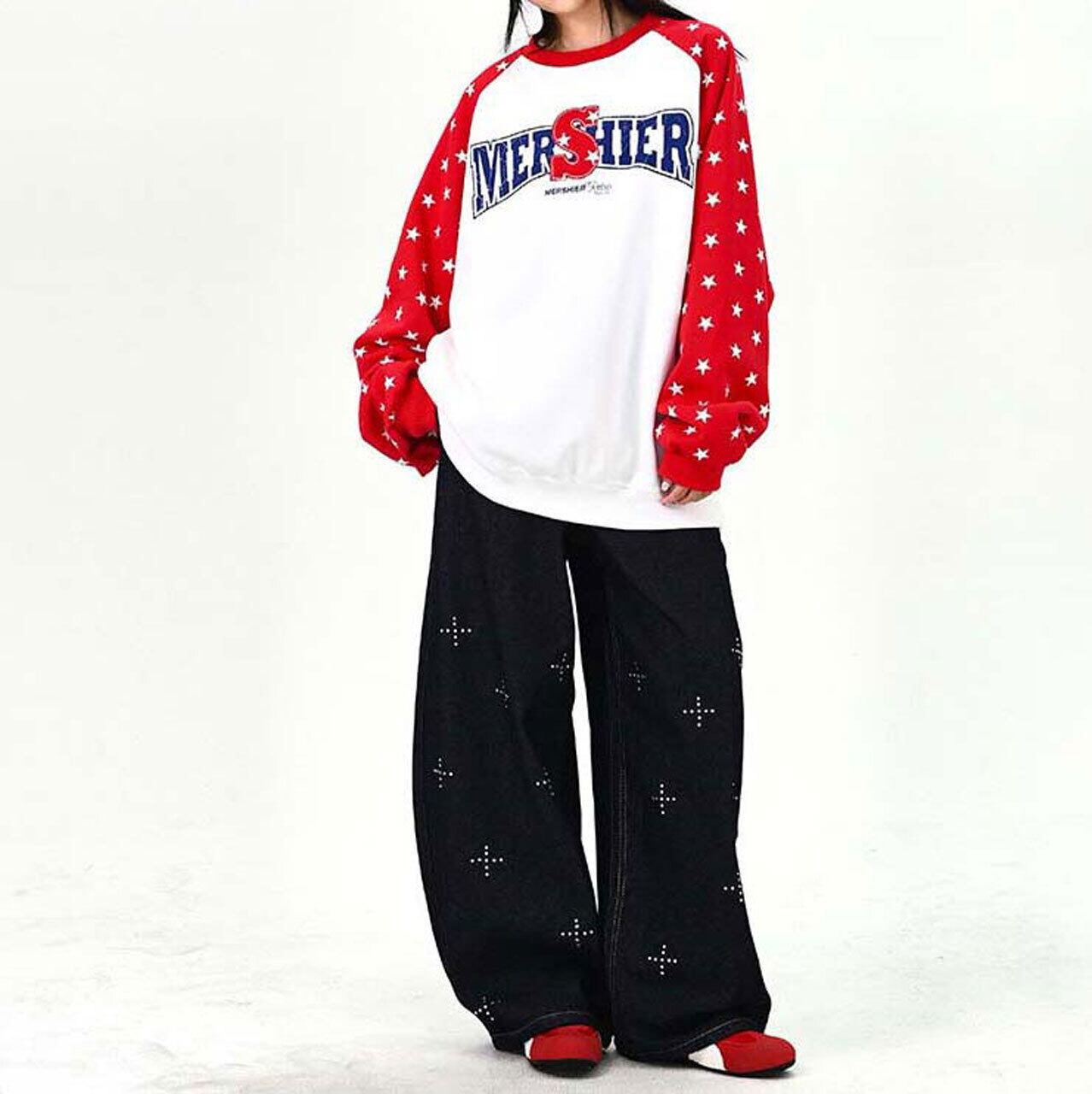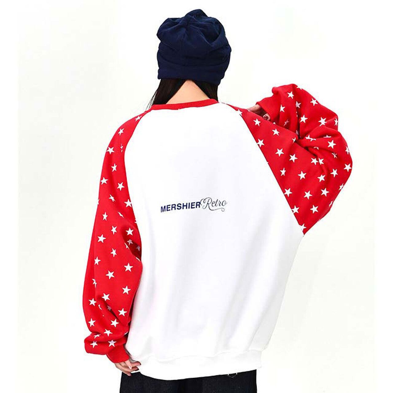 ロゴデザインと星柄スリーブの組み合わせが目を引く、遊び心のあるトップス。