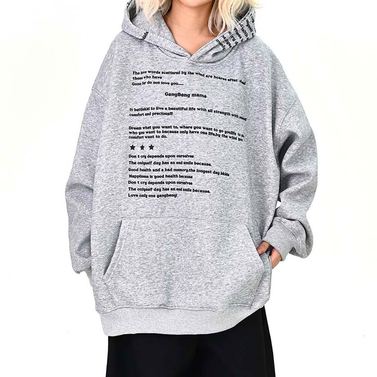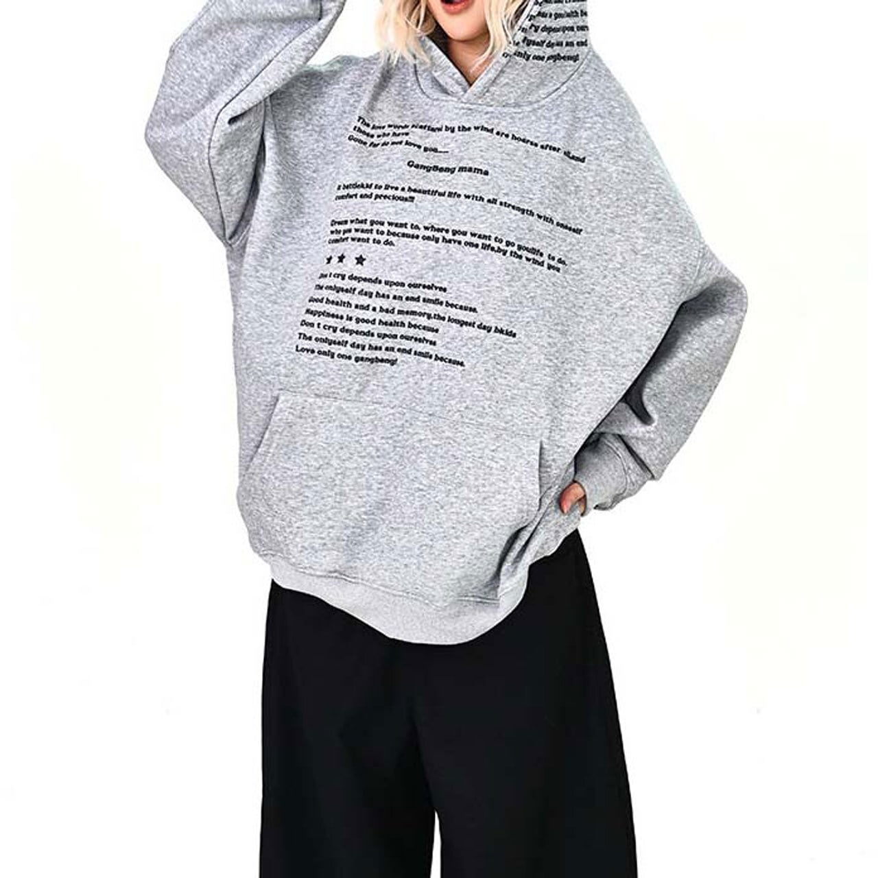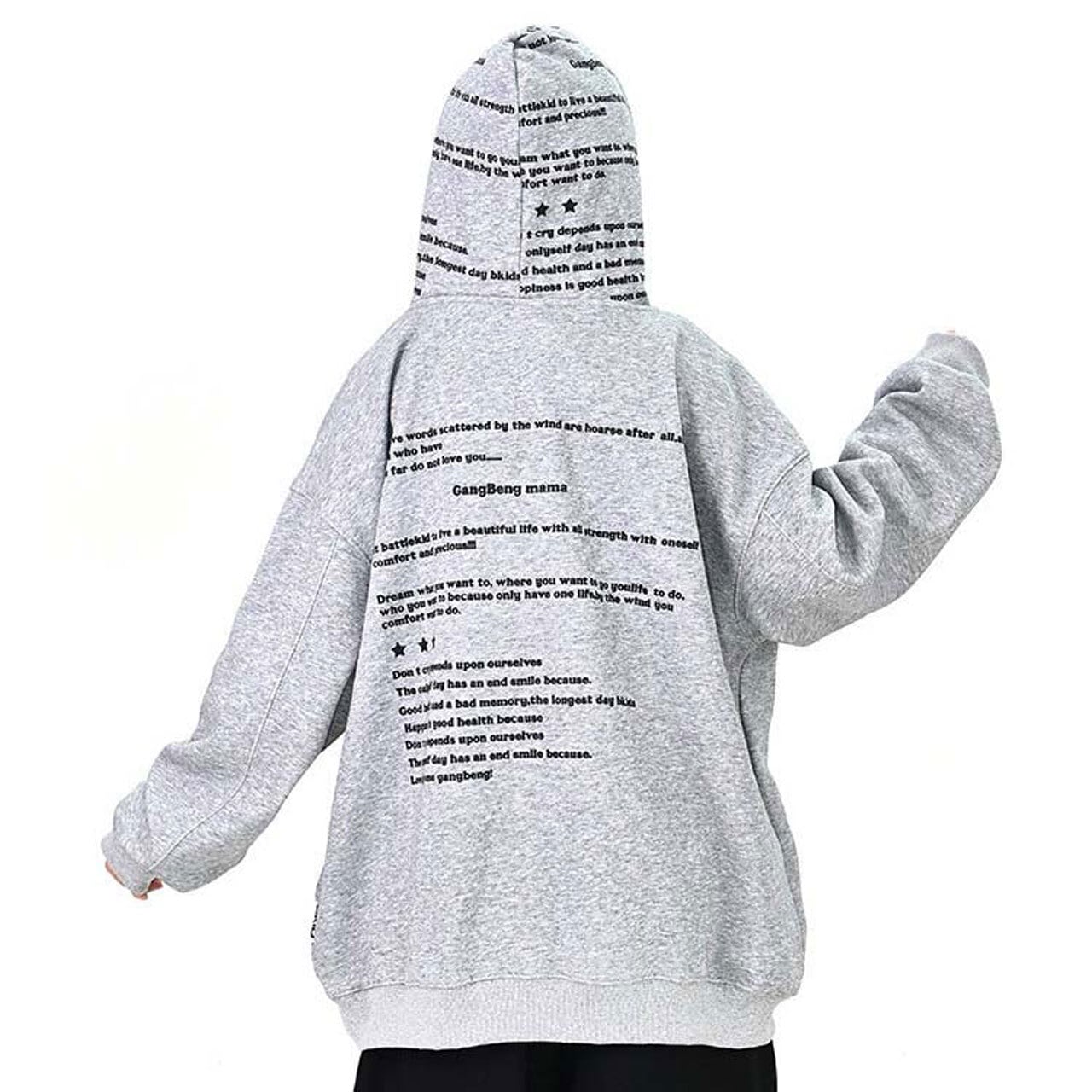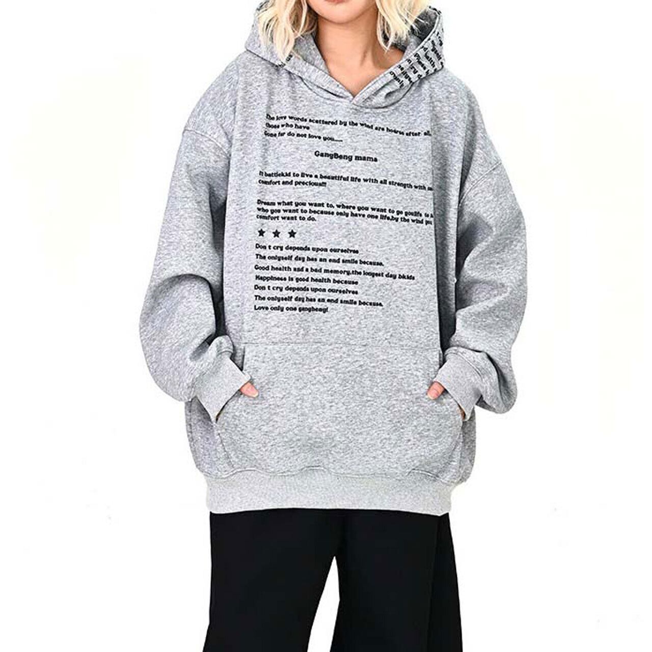 全面に散りばめたメッセージプリントが印象的な、主役級のフーディトップス。