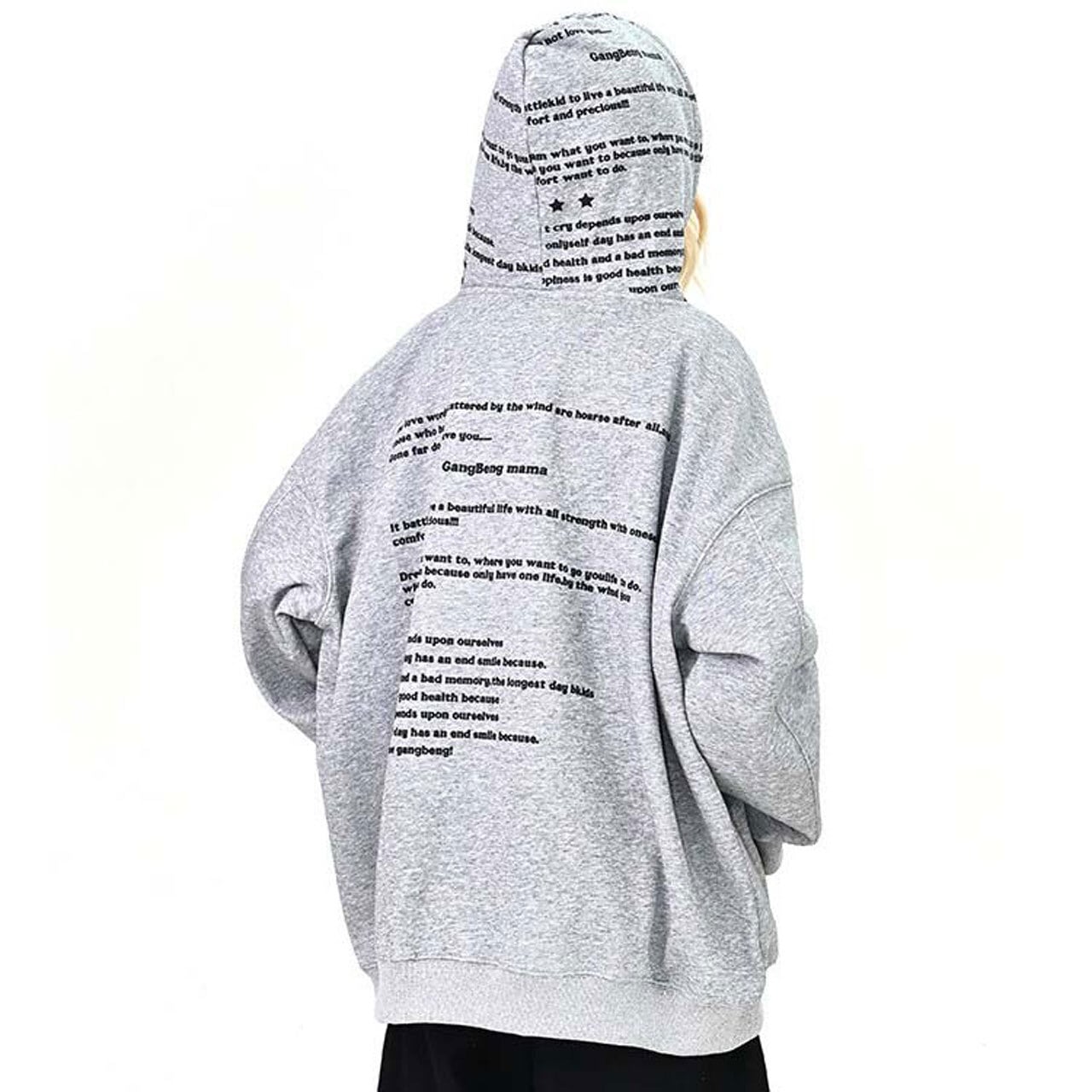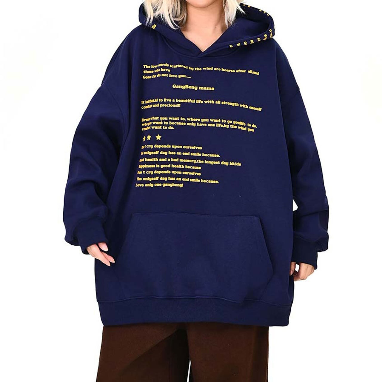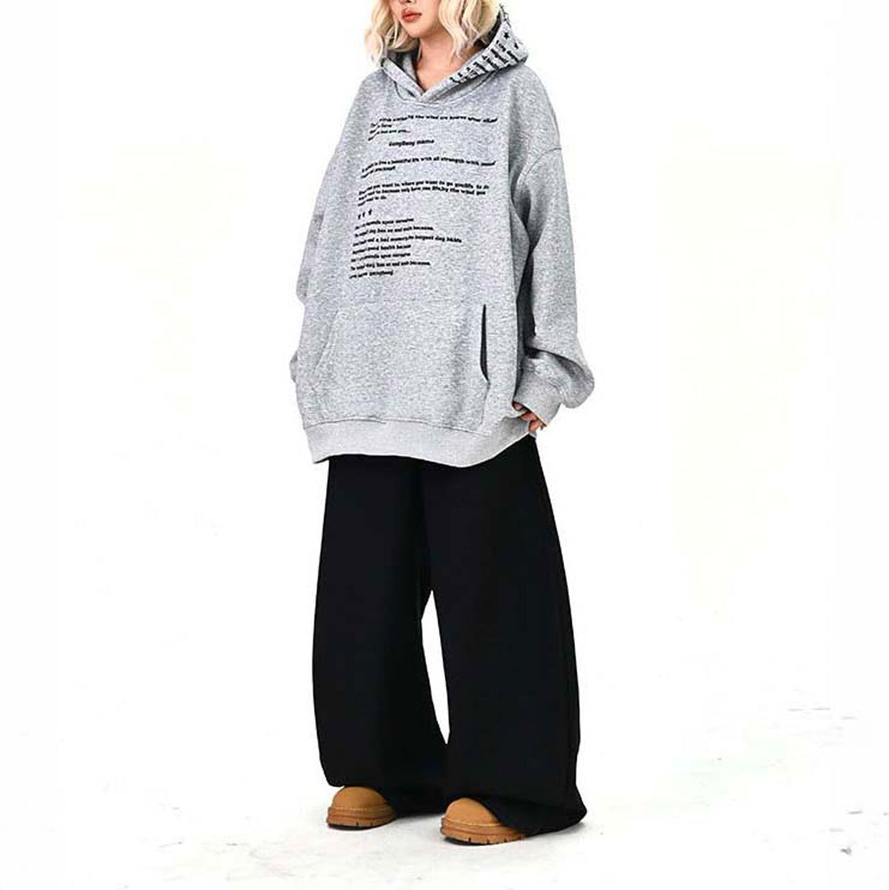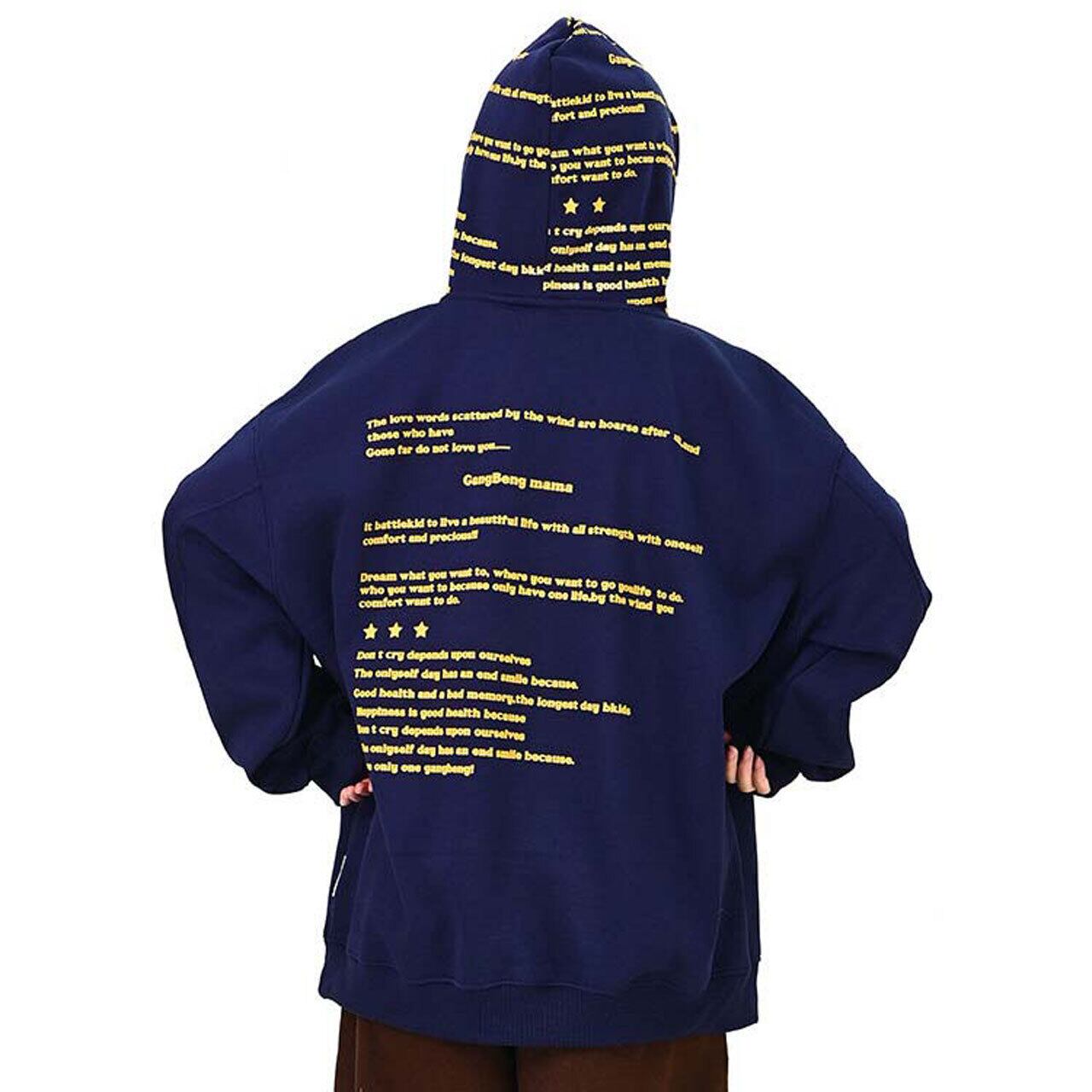 全面に散りばめたメッセージプリントが印象的な、主役級のフーディトップス。