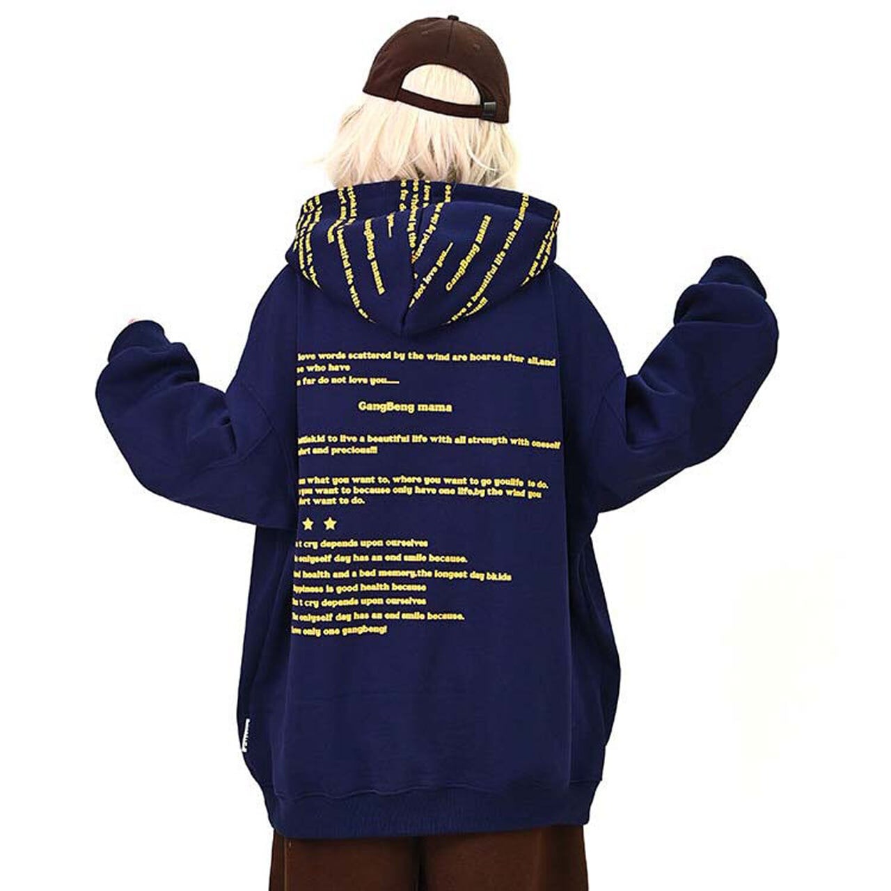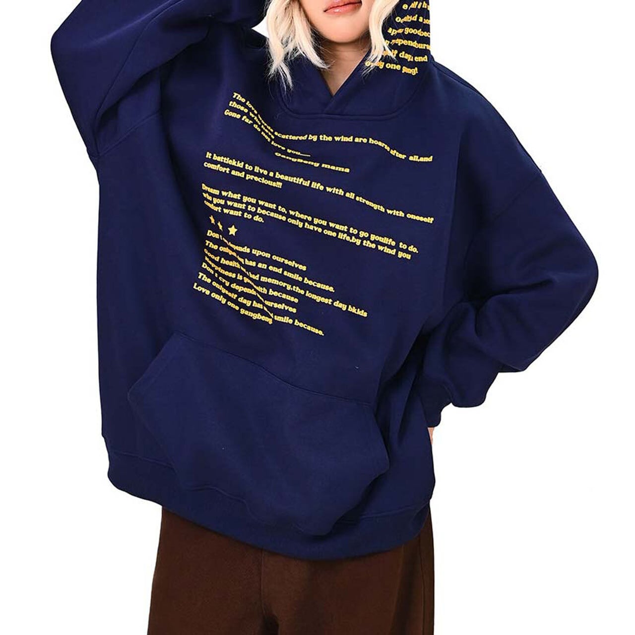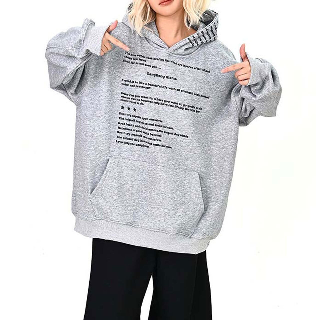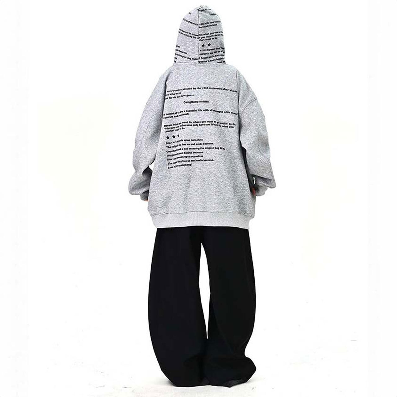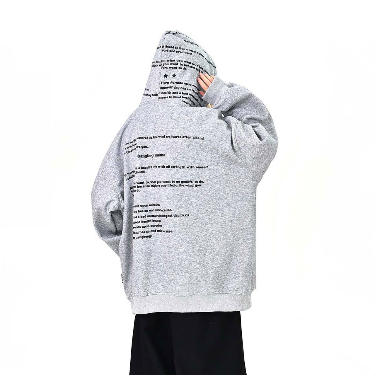 全面に散りばめたメッセージプリントが印象的な、主役級のフーディトップス。
