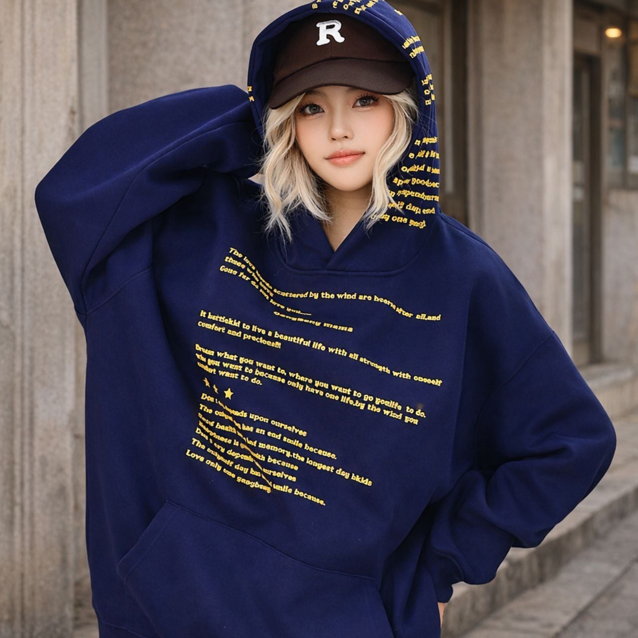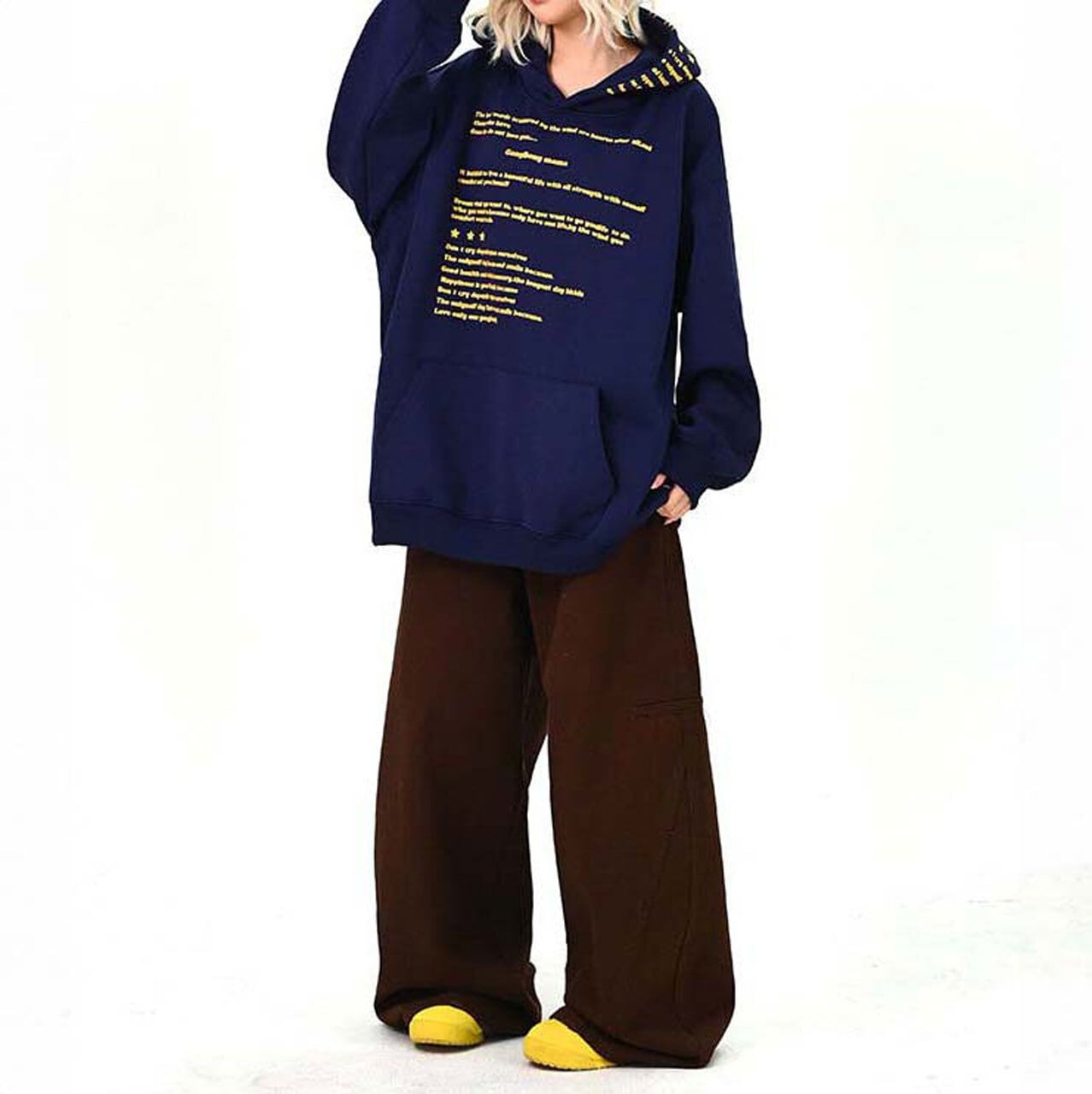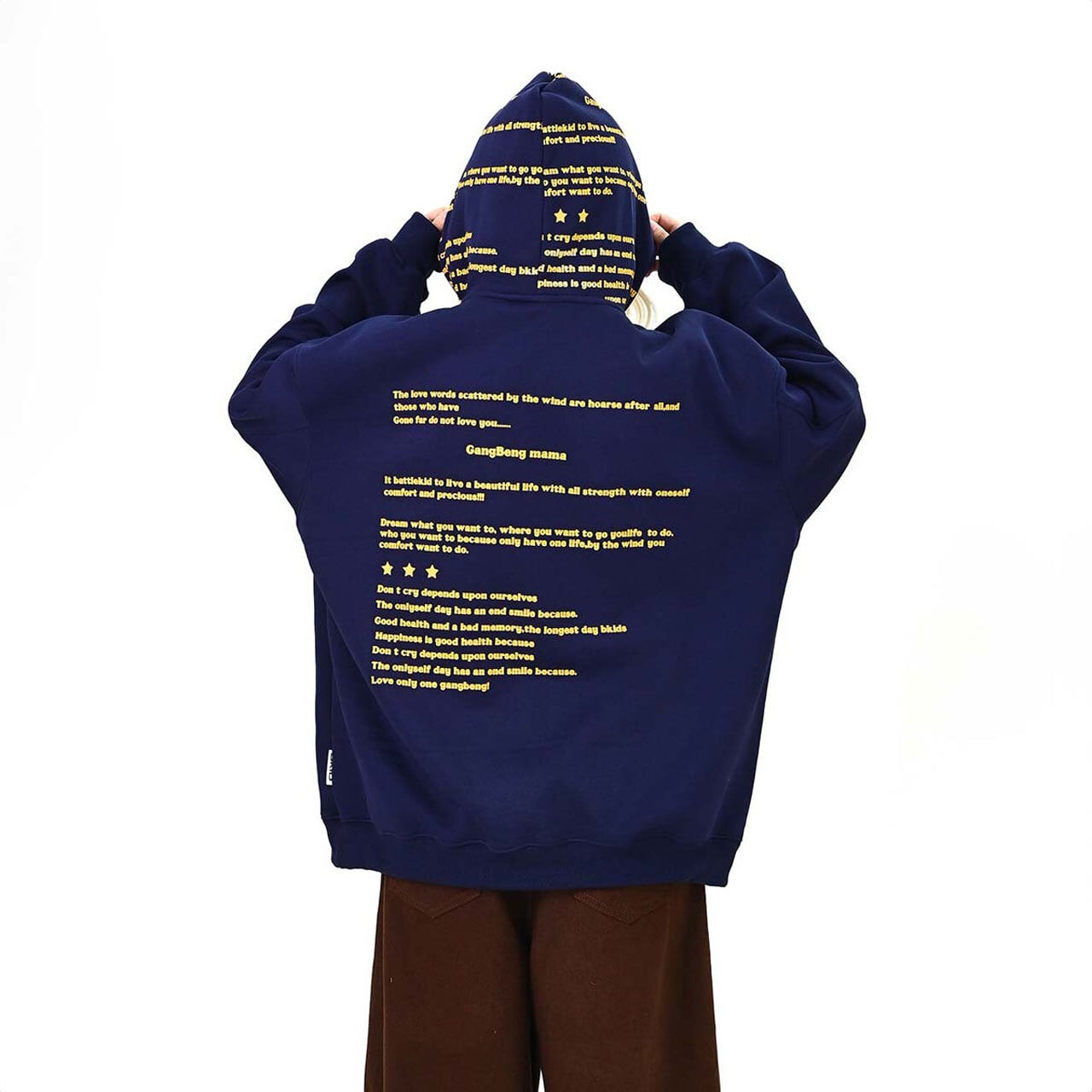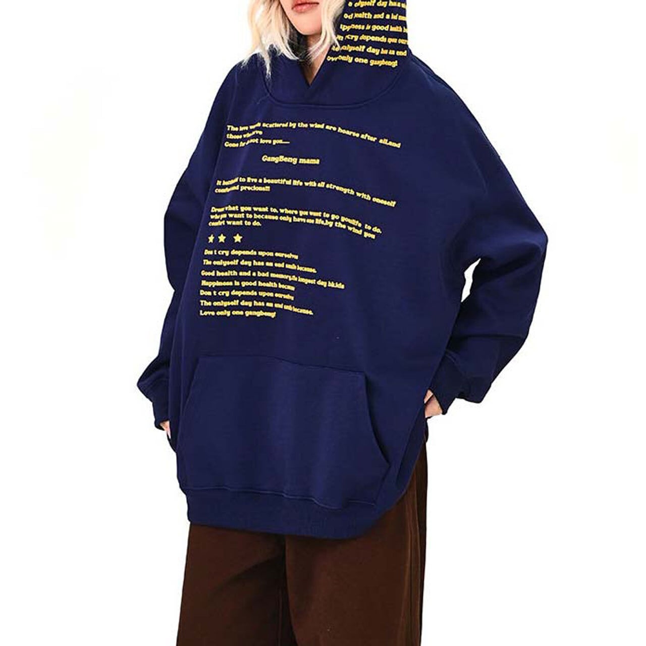 全面に散りばめたメッセージプリントが印象的な、主役級のフーディトップス。