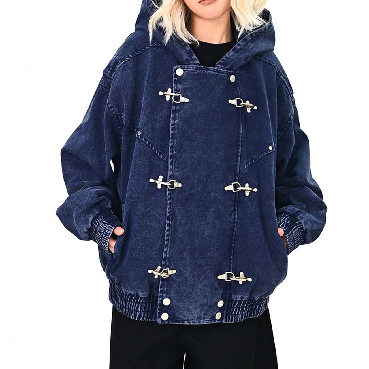 トグル風のフロントディテールが印象的な、個性際立つフーディジャケット。