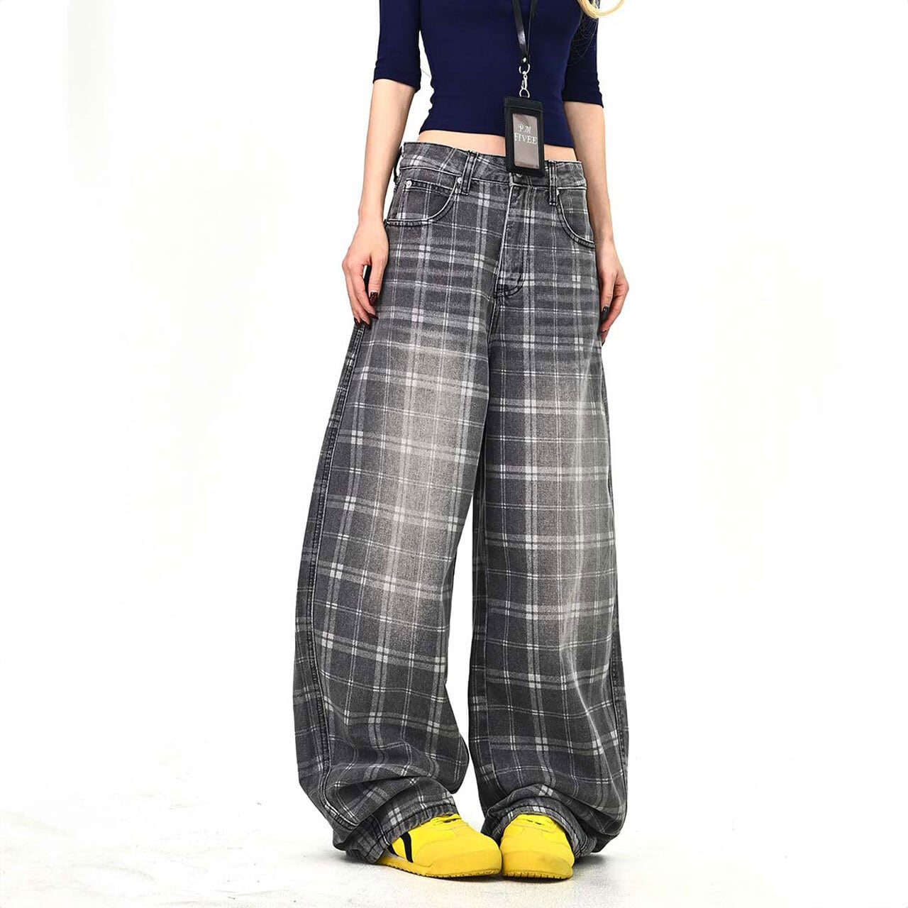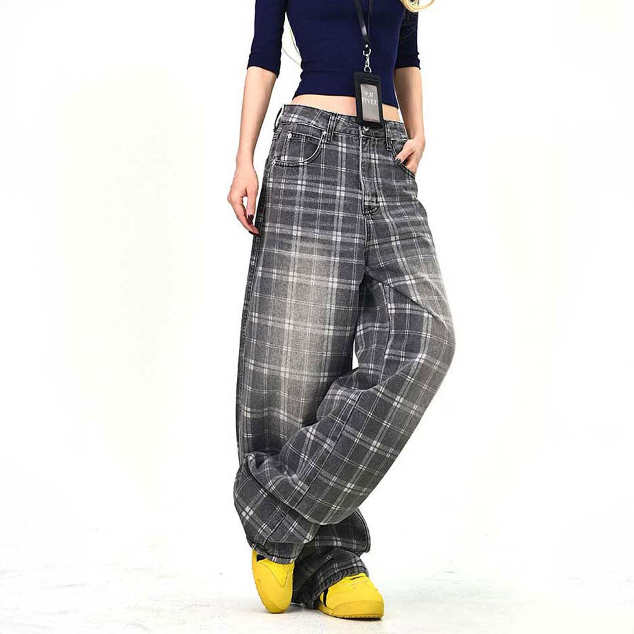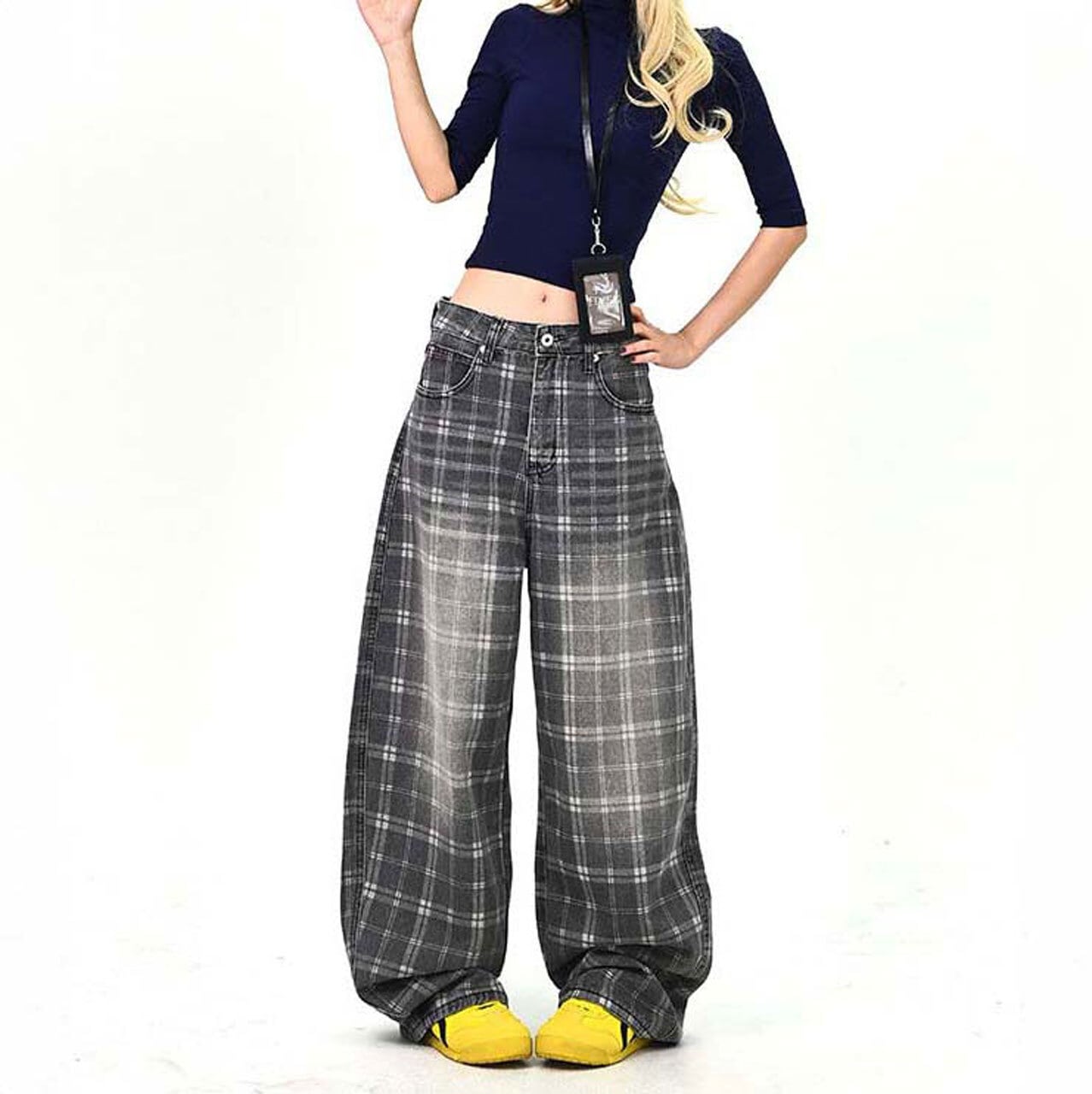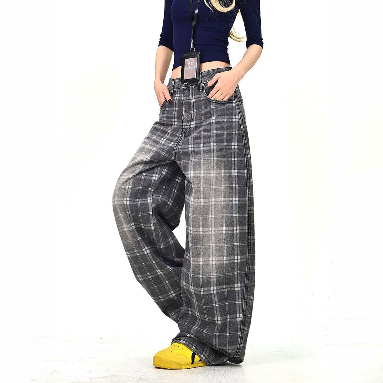 落ち着いたチェック柄が印象的な、ストリート感のあるワイドパンツ。