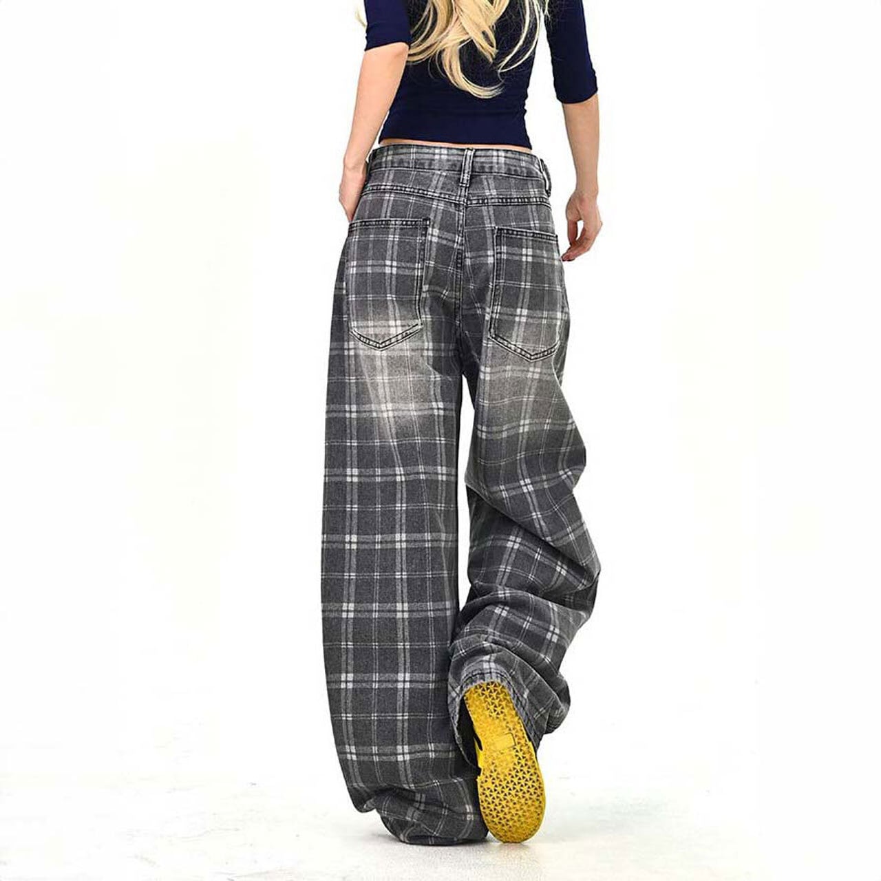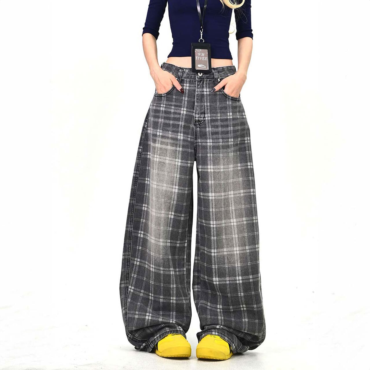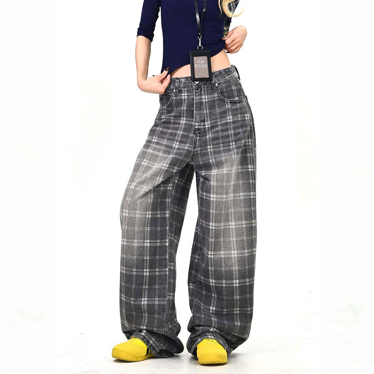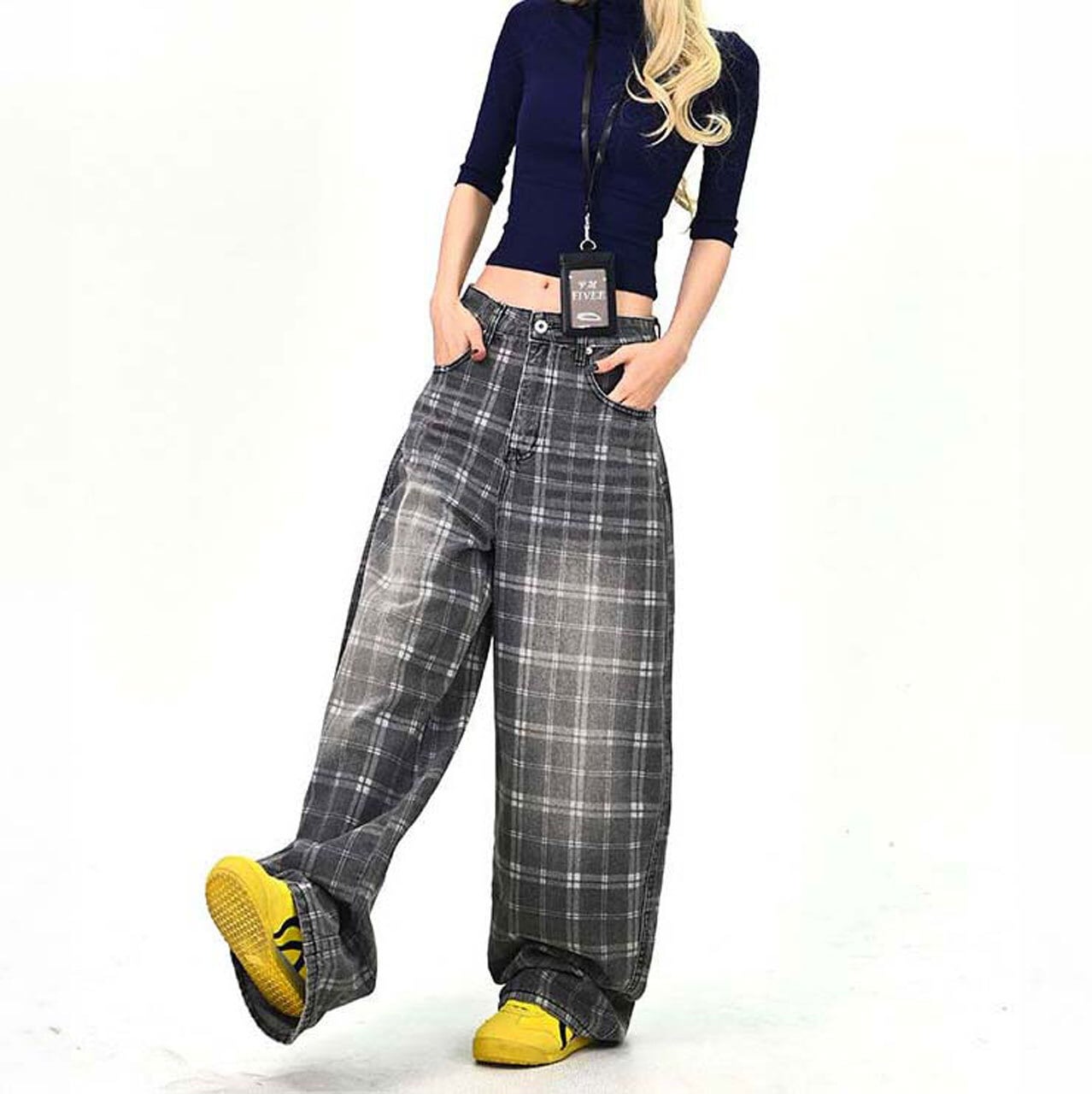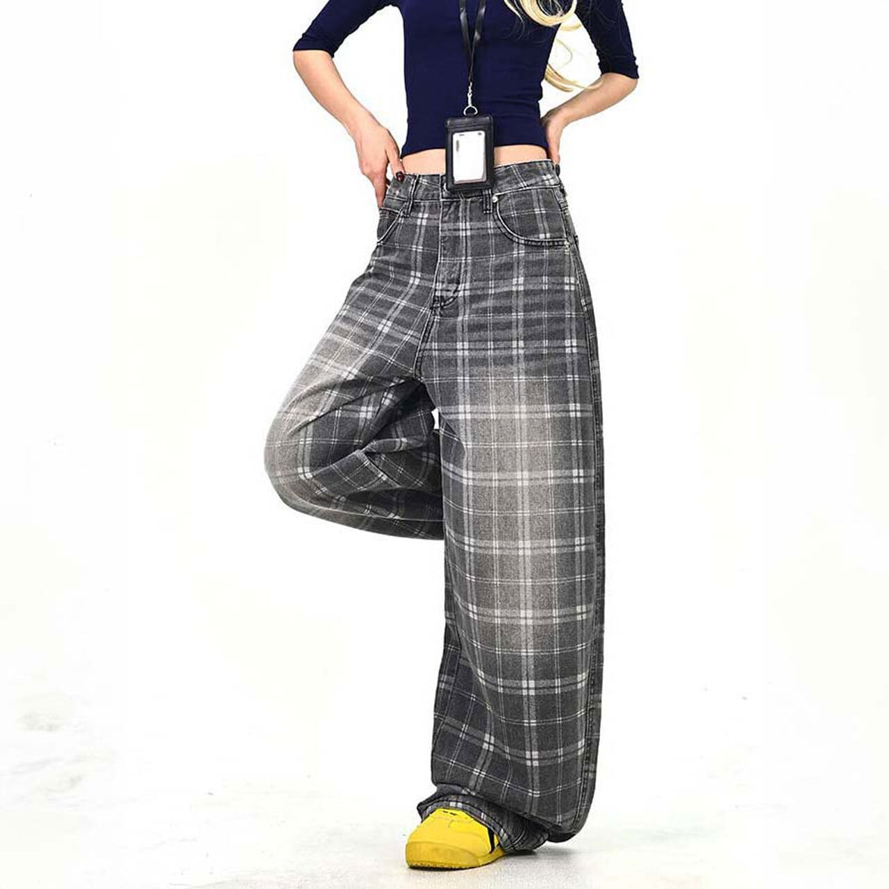 落ち着いたチェック柄が印象的な、ストリート感のあるワイドパンツ。