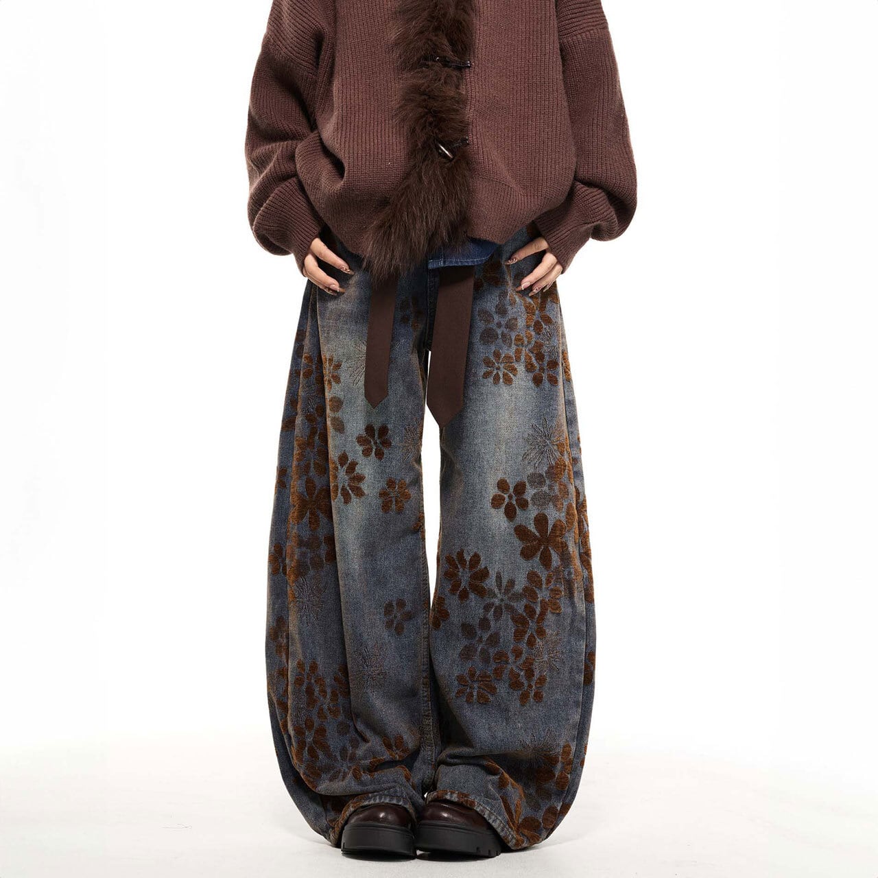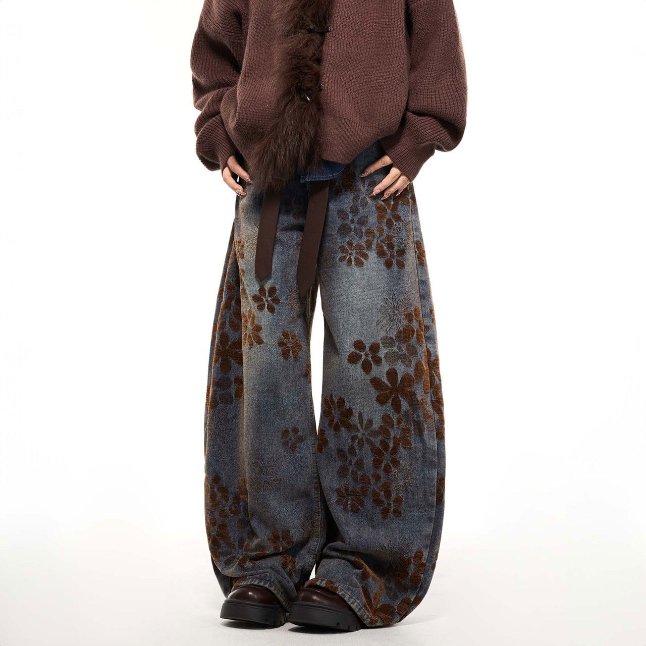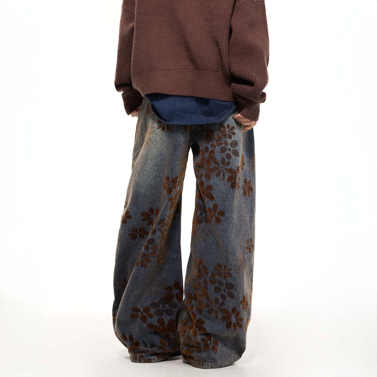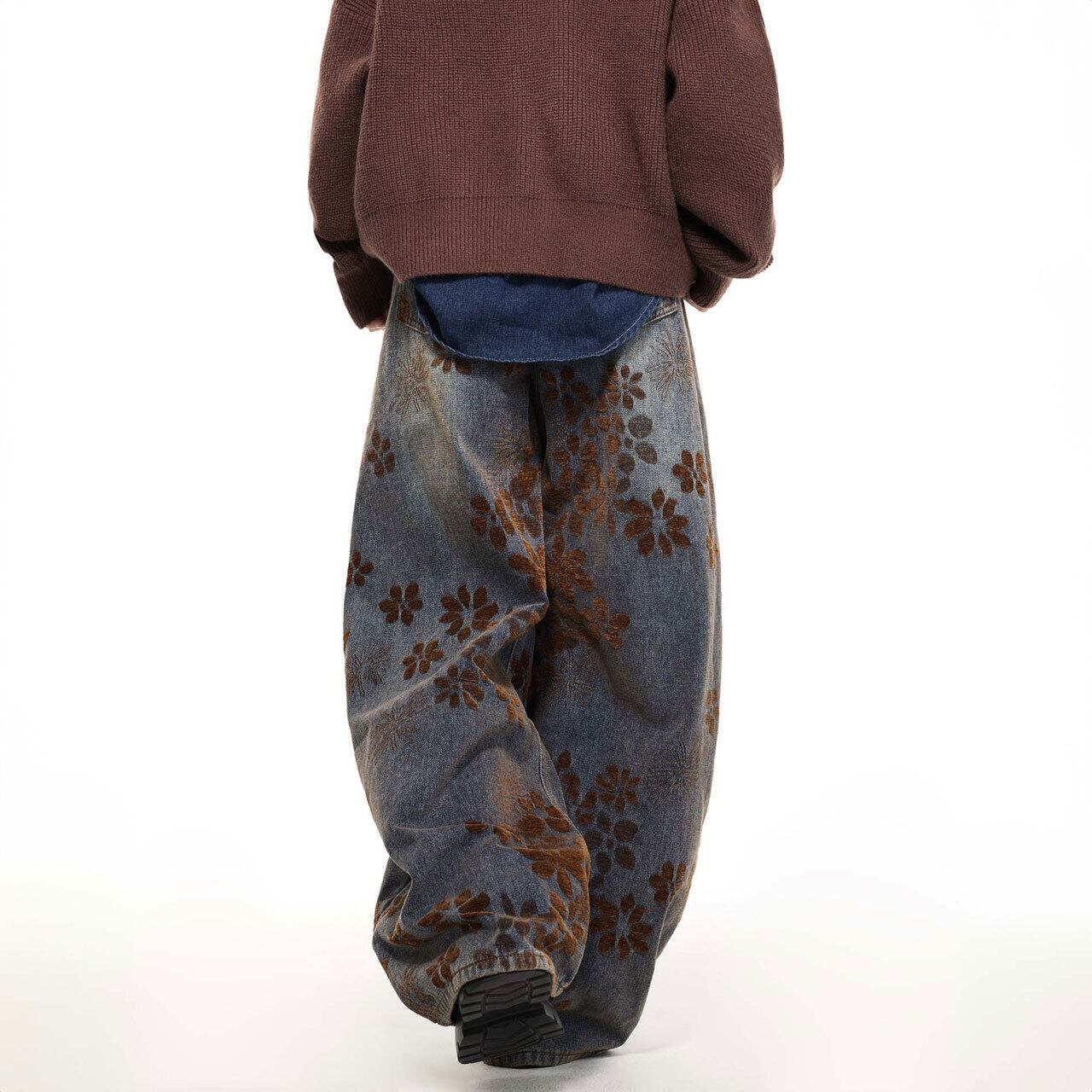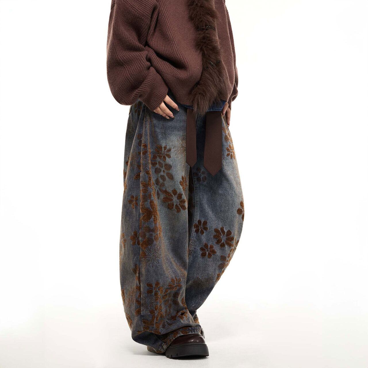 総柄フラワーデザインが印象的な、存在感のあるワイドパンツ。