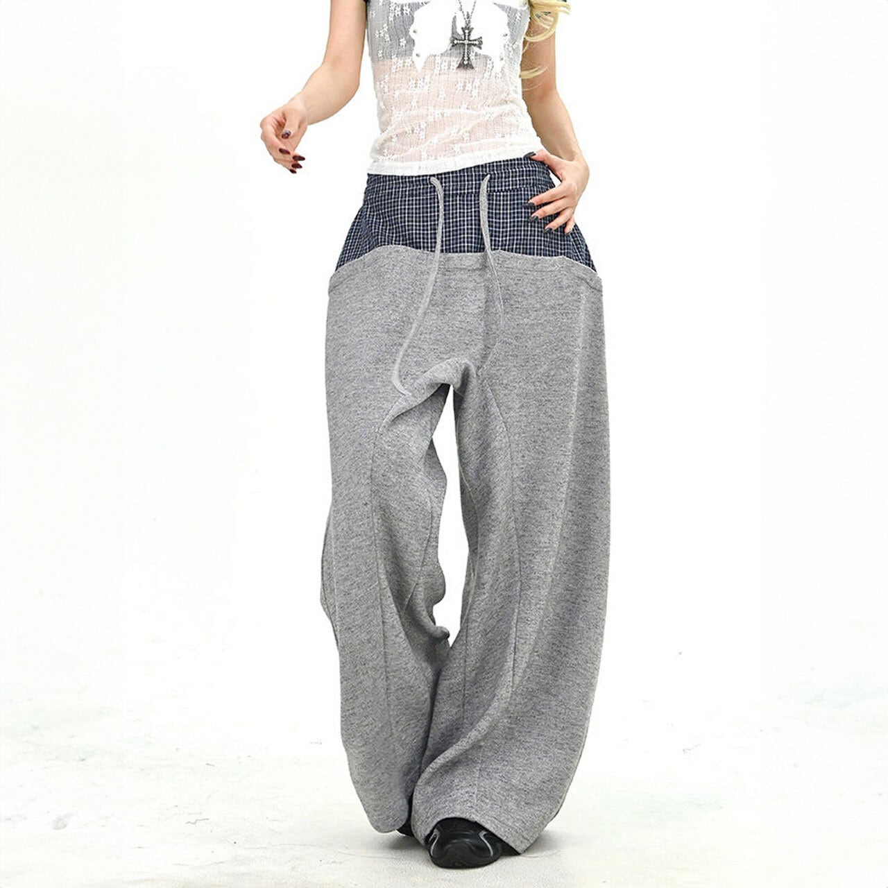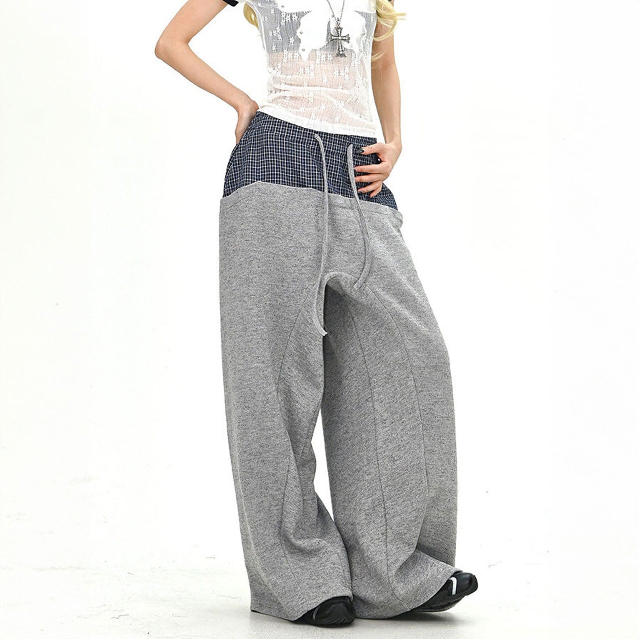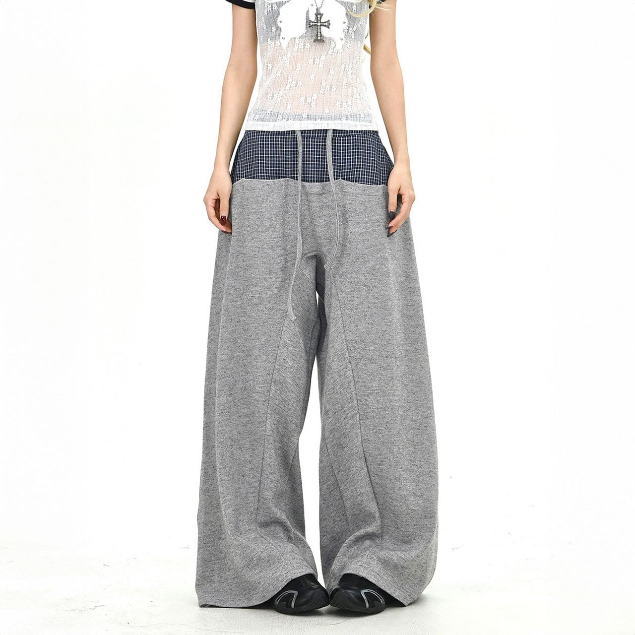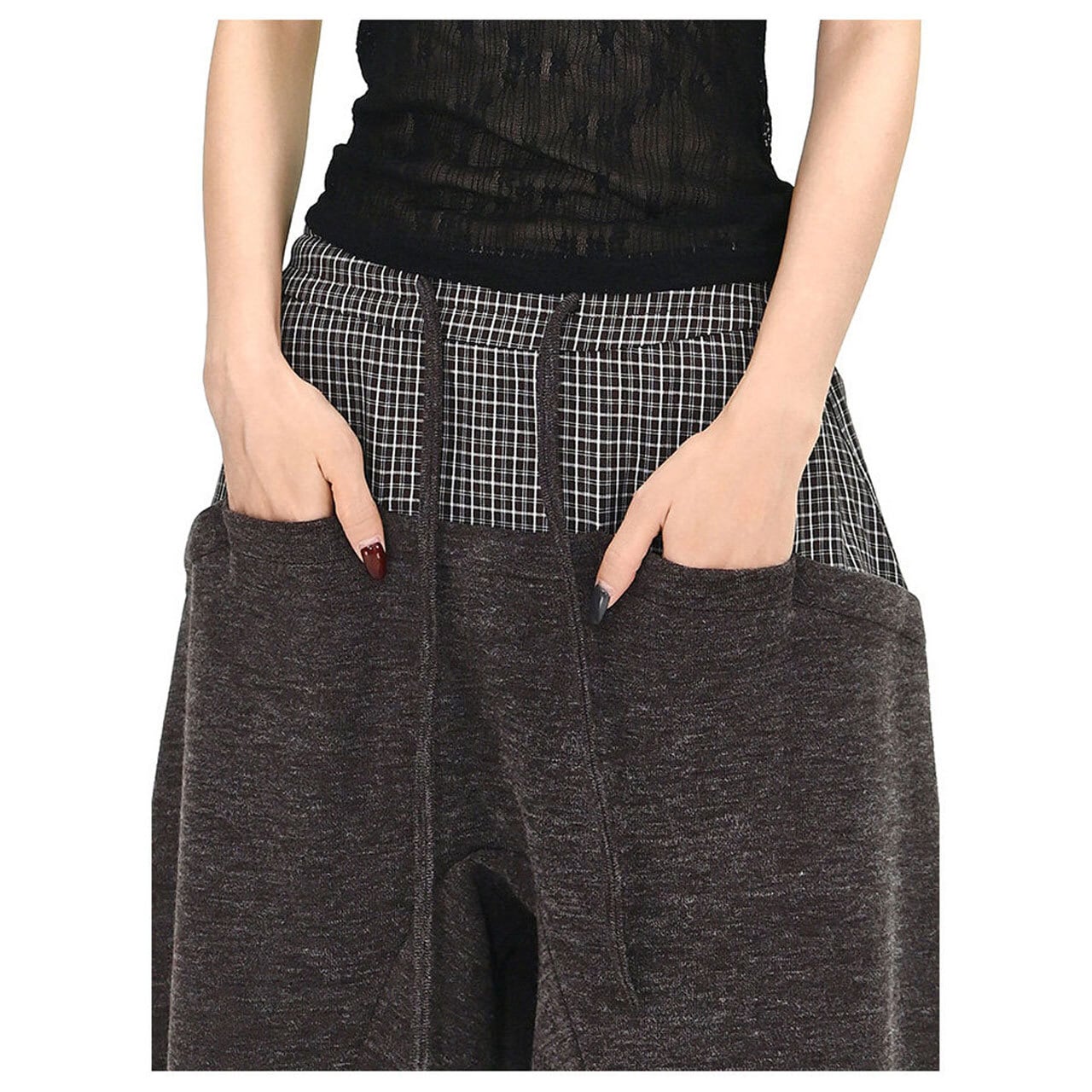 チェックレイヤードドローストリングワイドパンツ 2col R01663