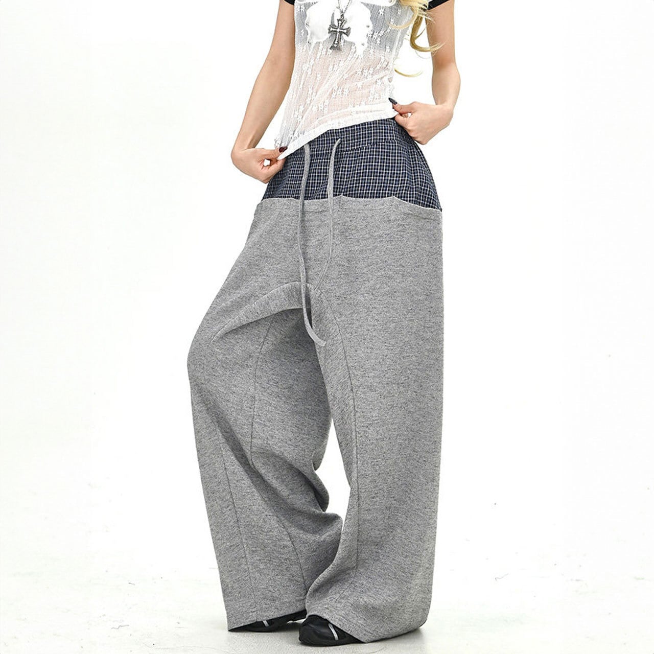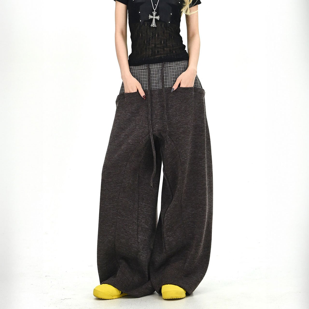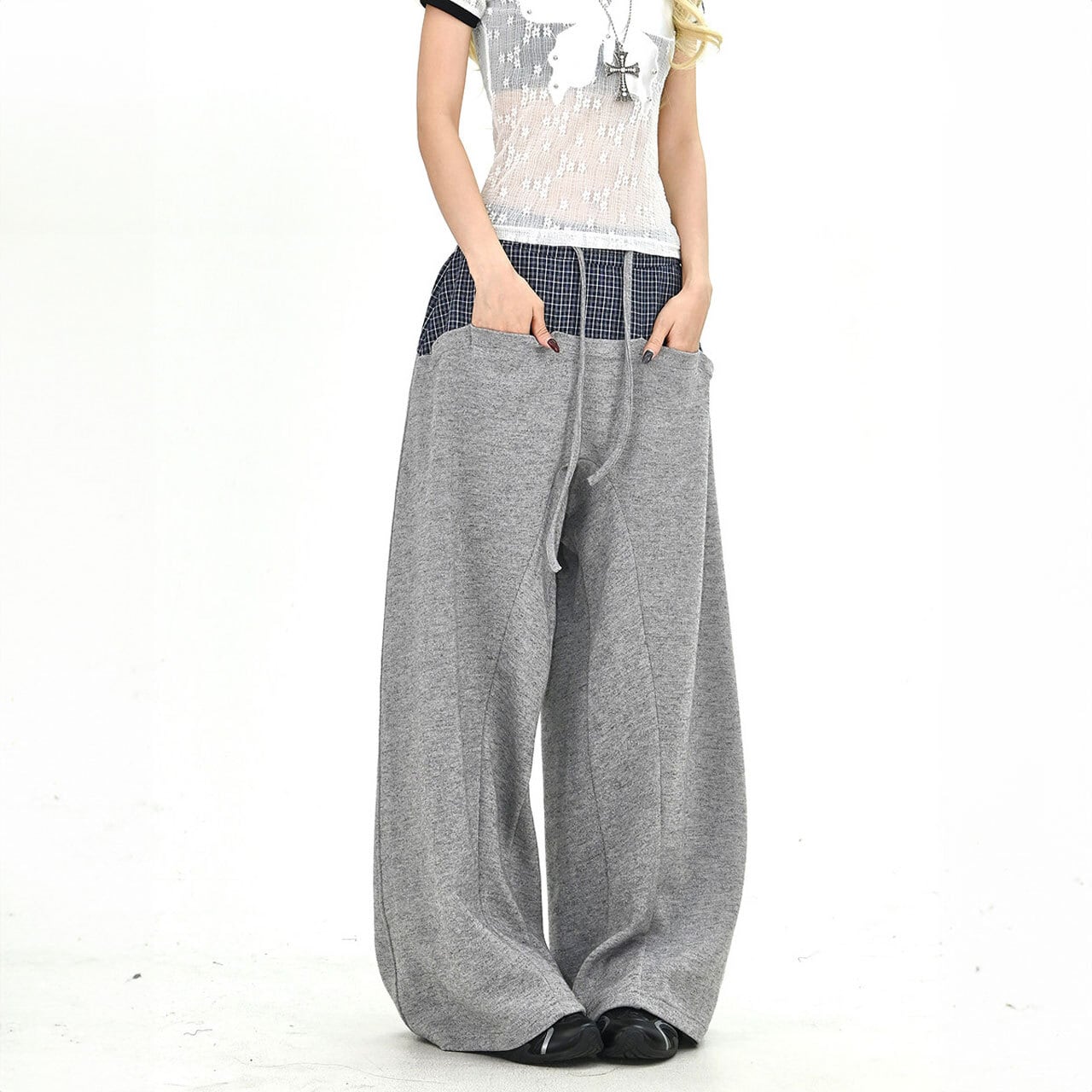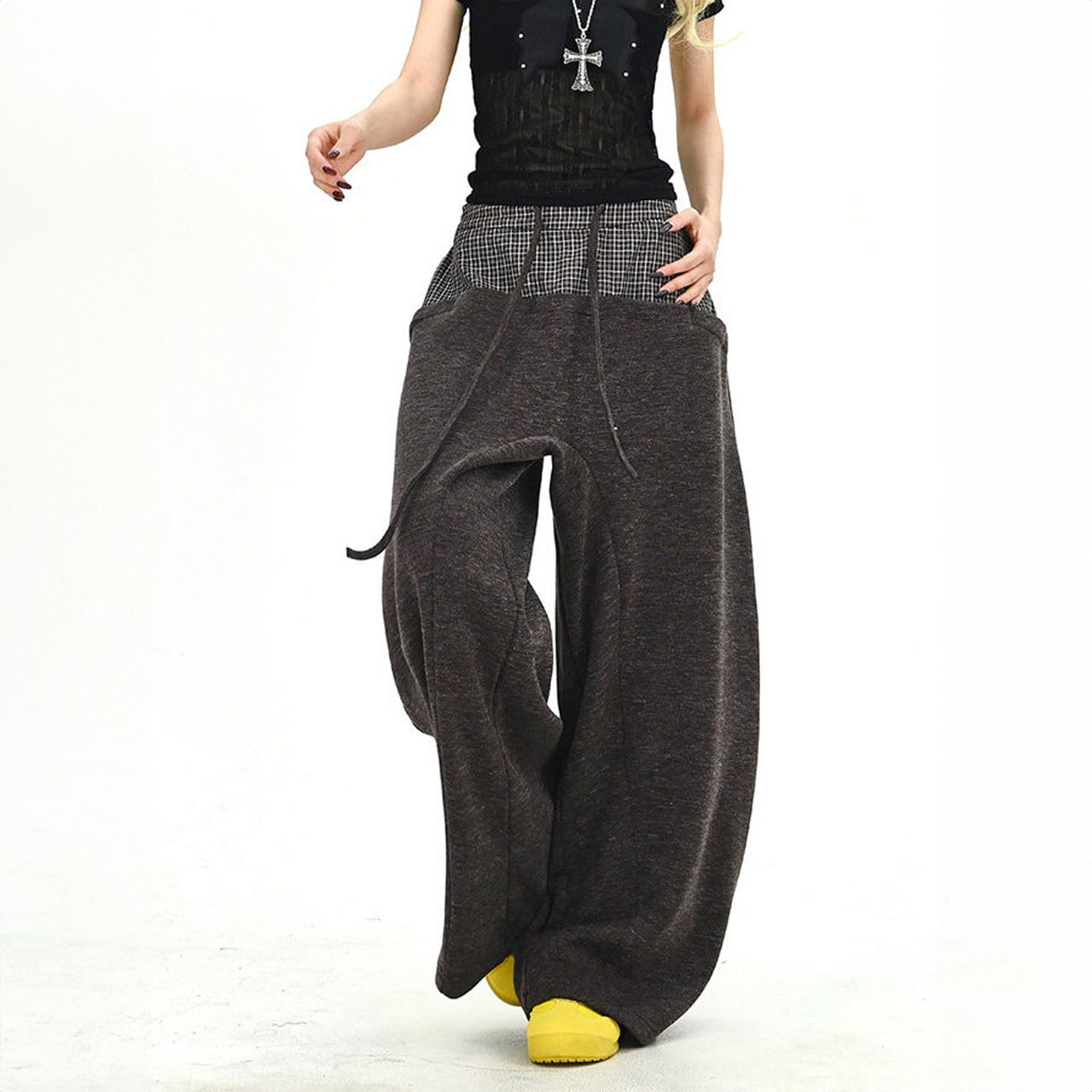 チェックレイヤードドローストリングワイドパンツ 2col R01663