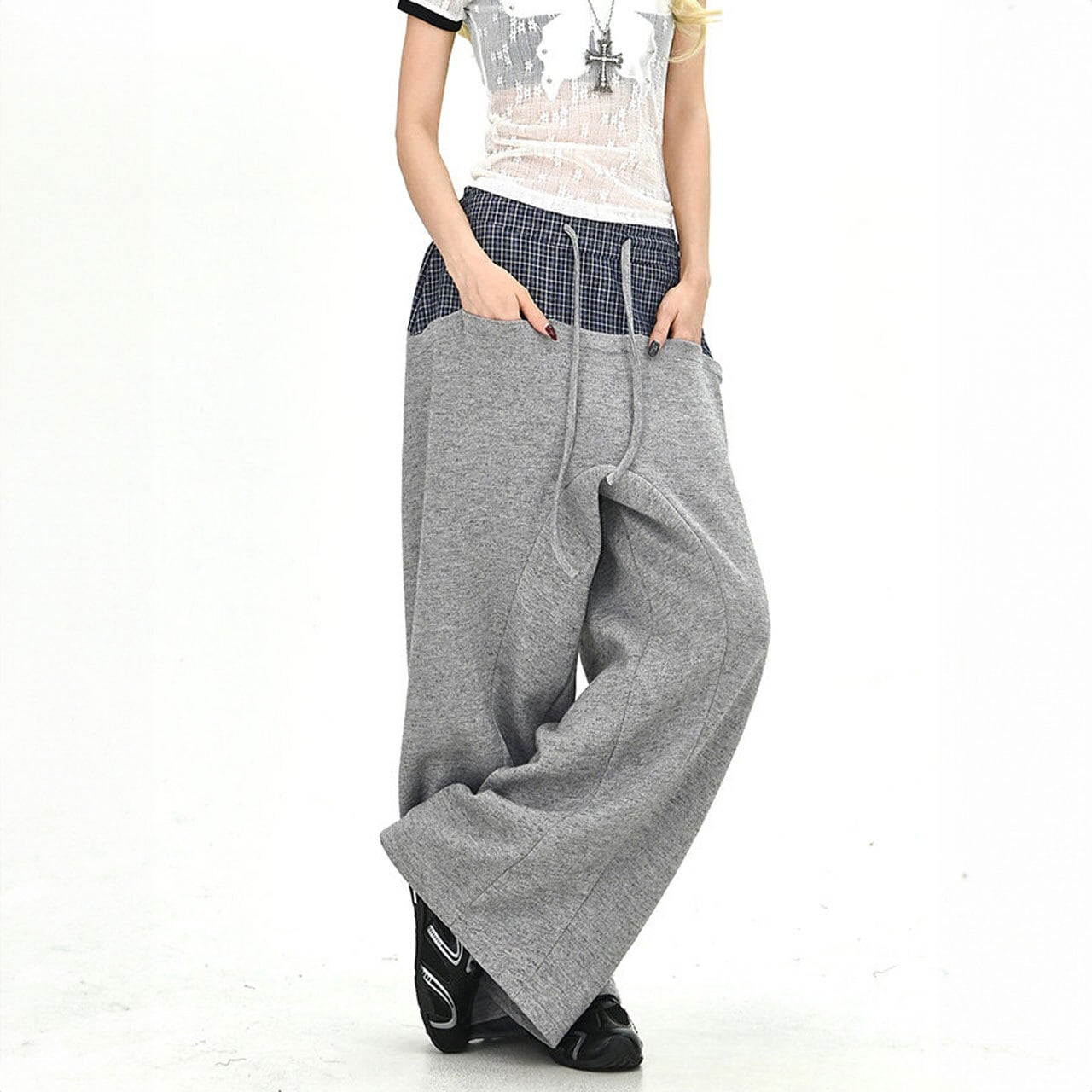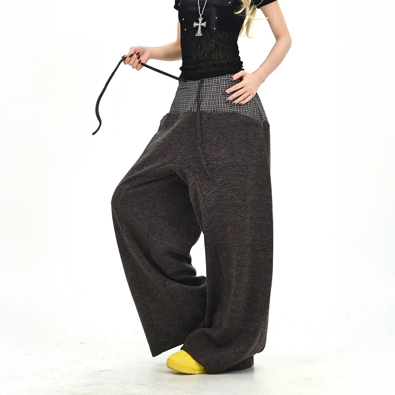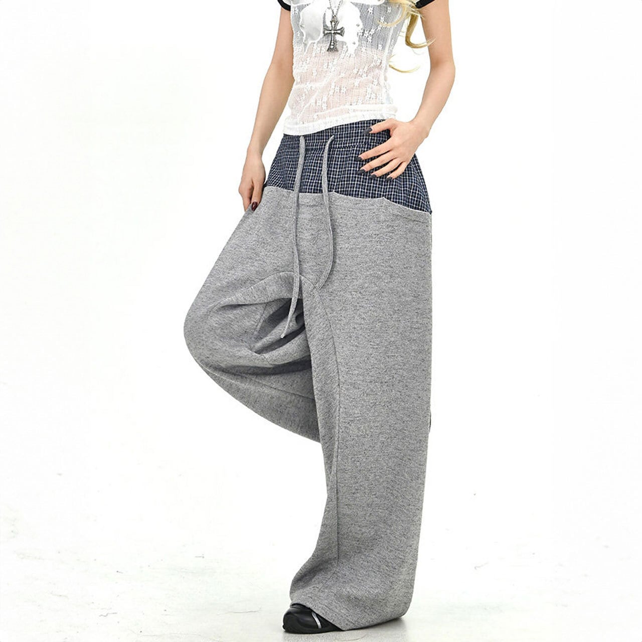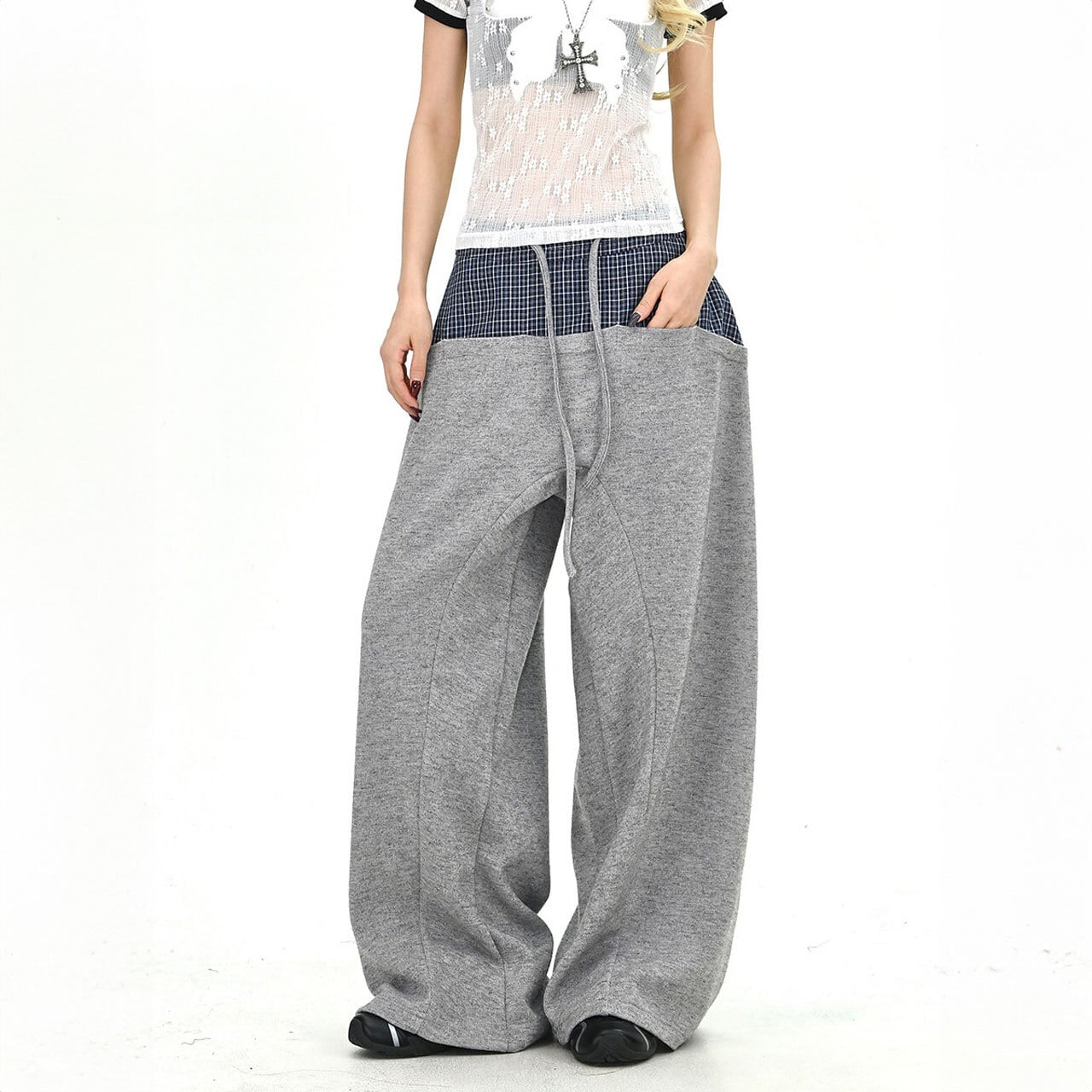 チェックレイヤードドローストリングワイドパンツ 2col R01663