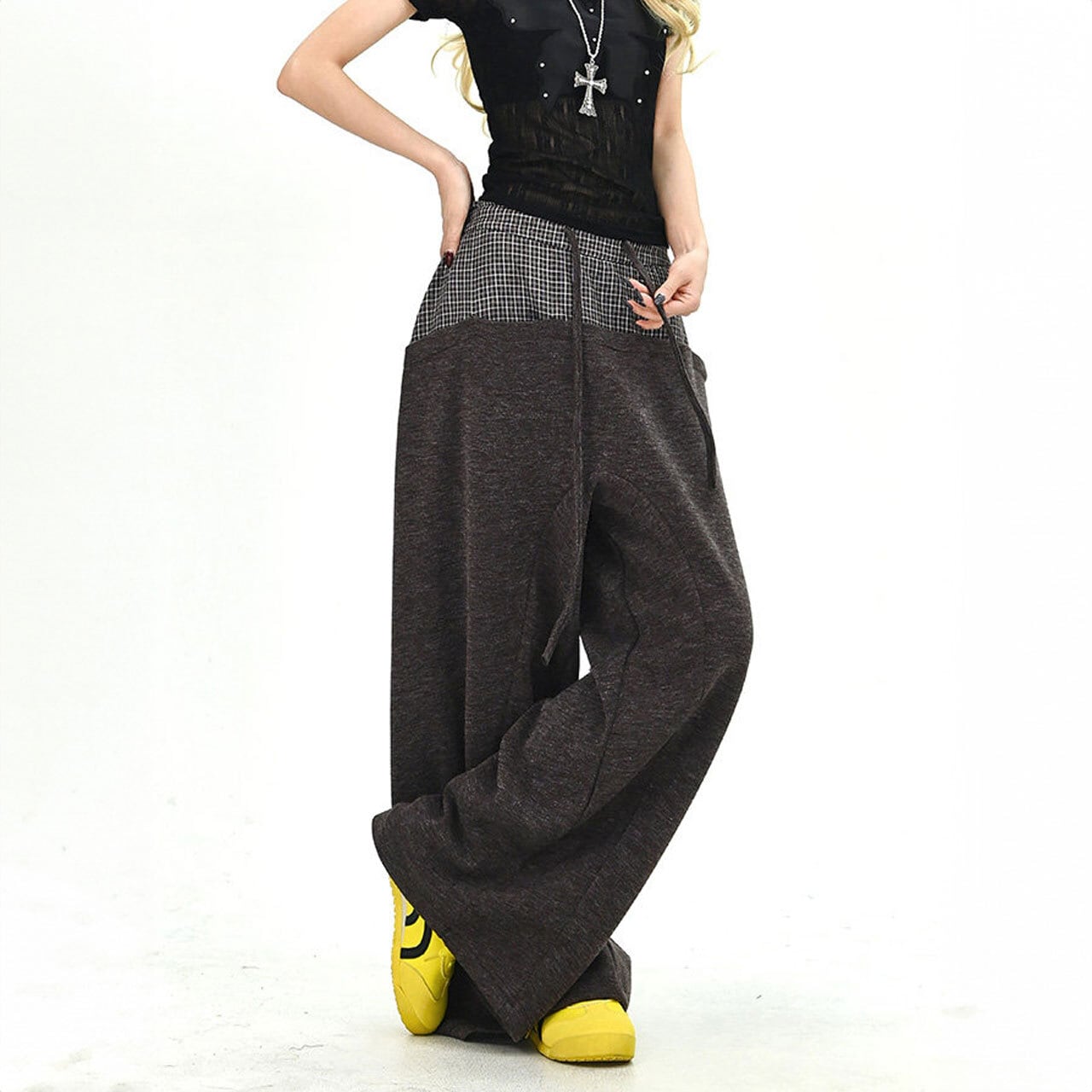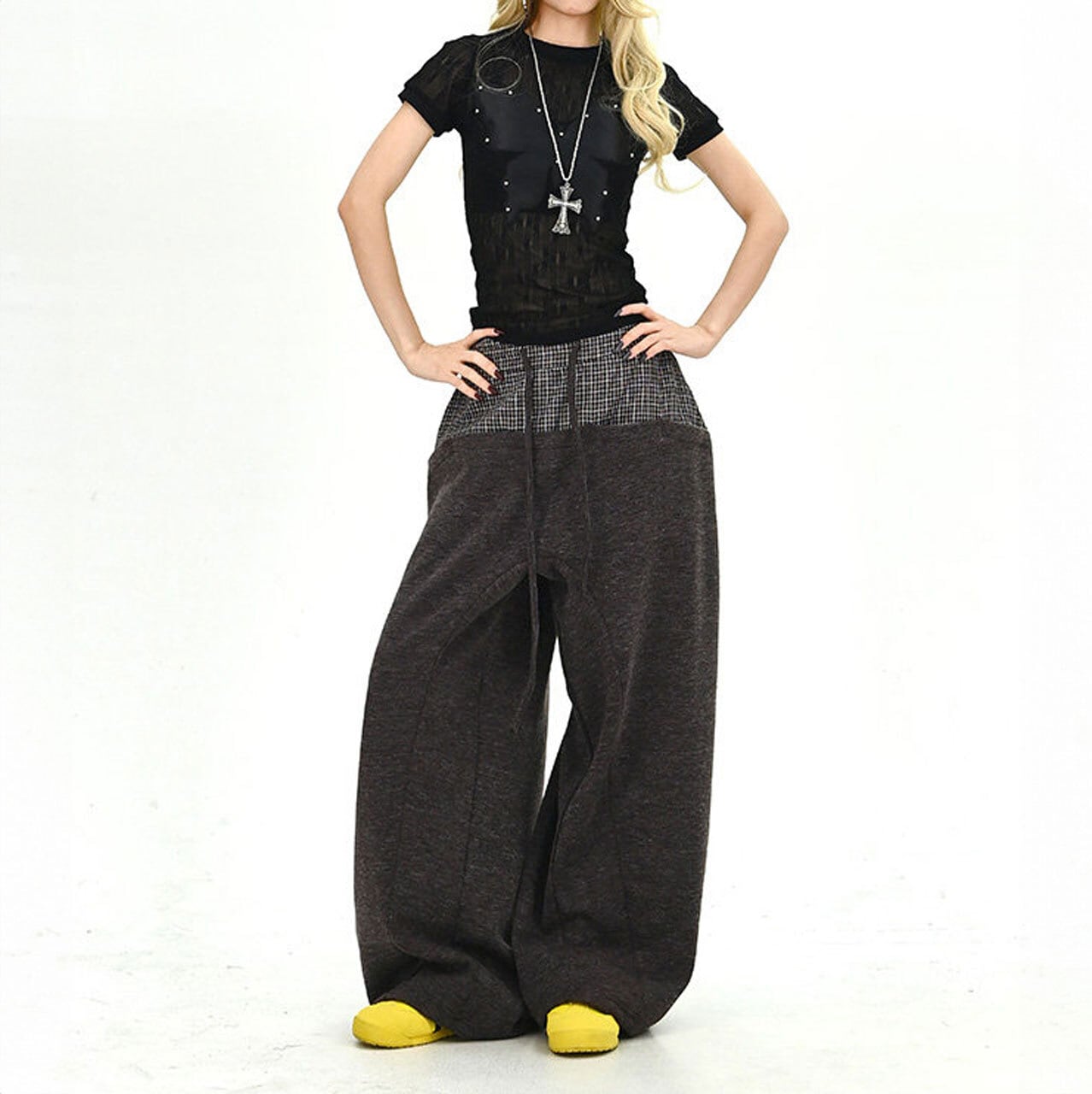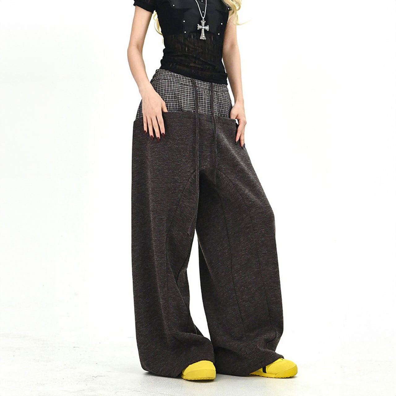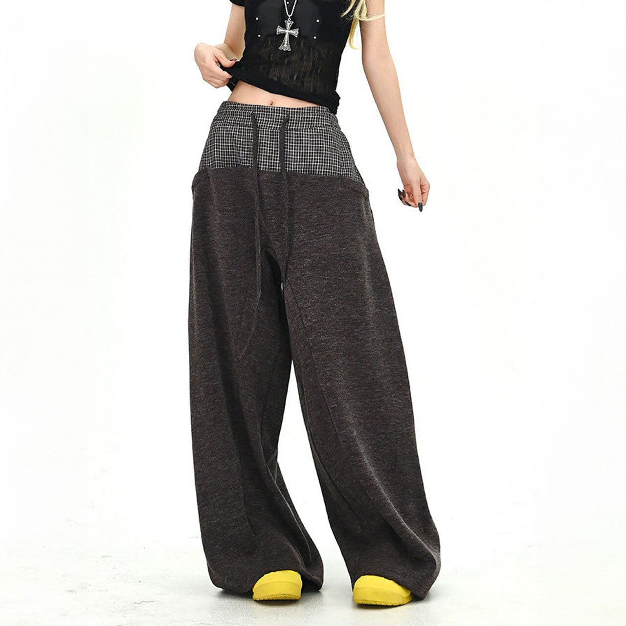 チェックレイヤードドローストリングワイドパンツ 2col R01663