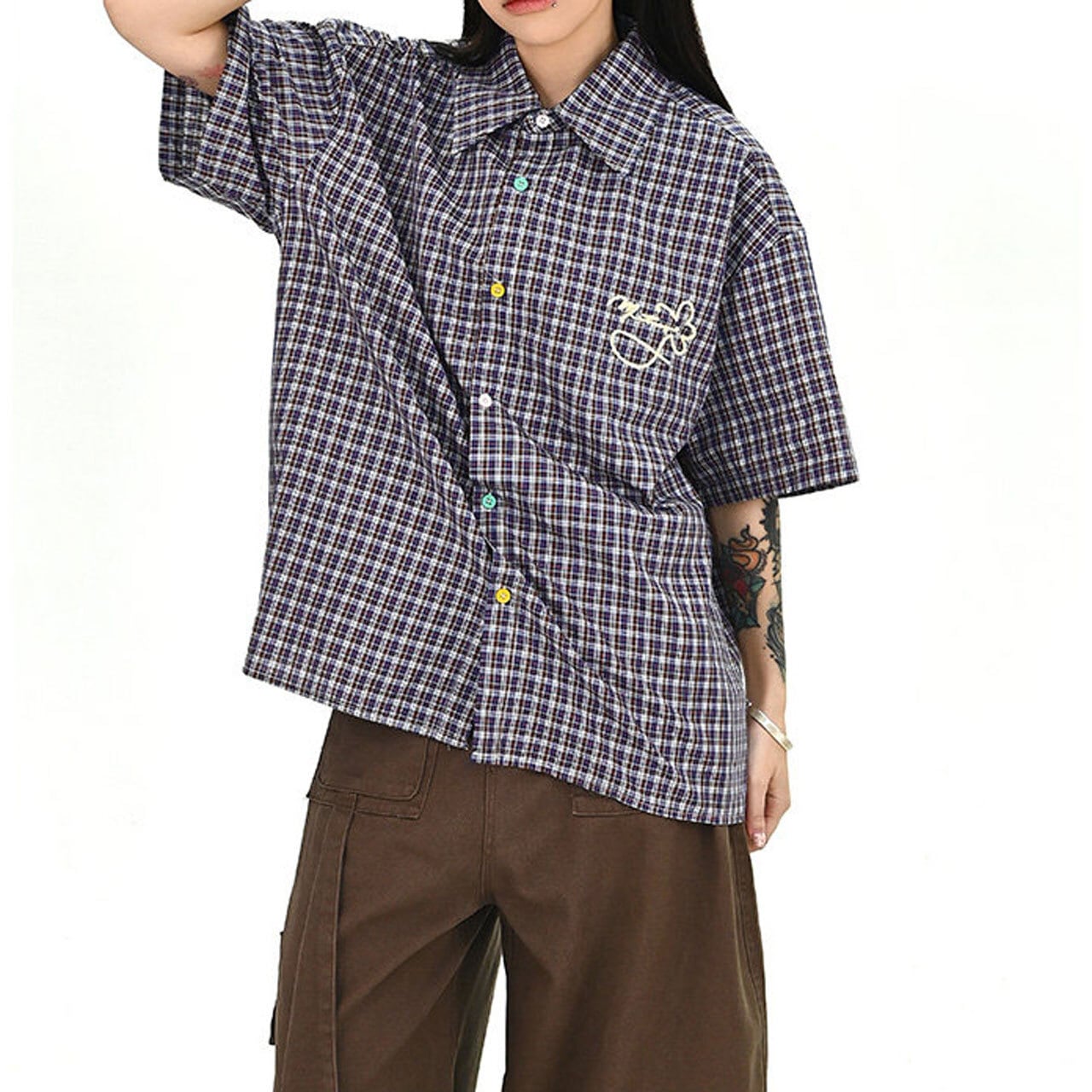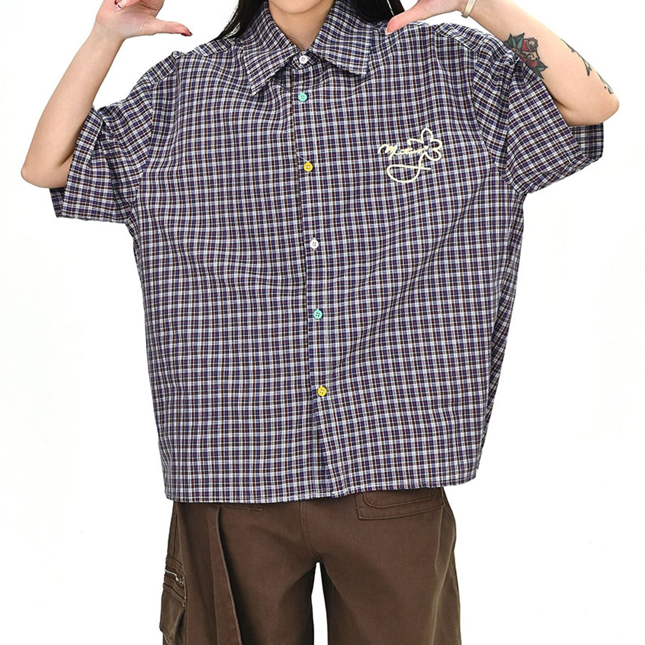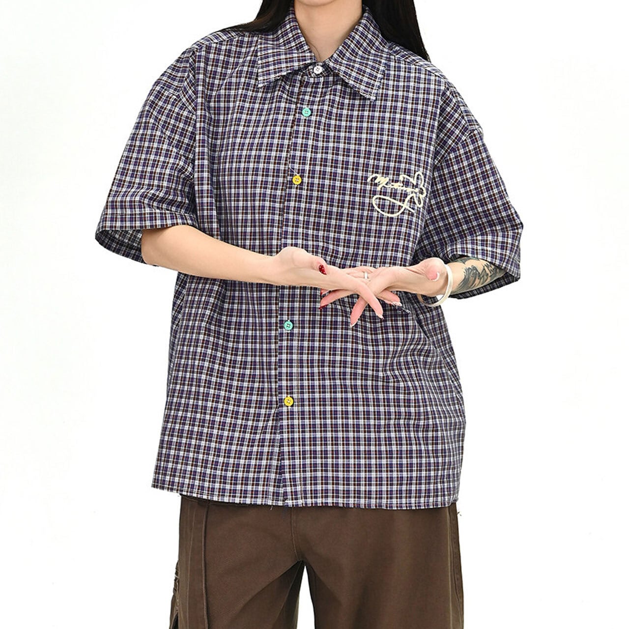 カラーボタンチェックデザインオーバーシャツ 1col R01674