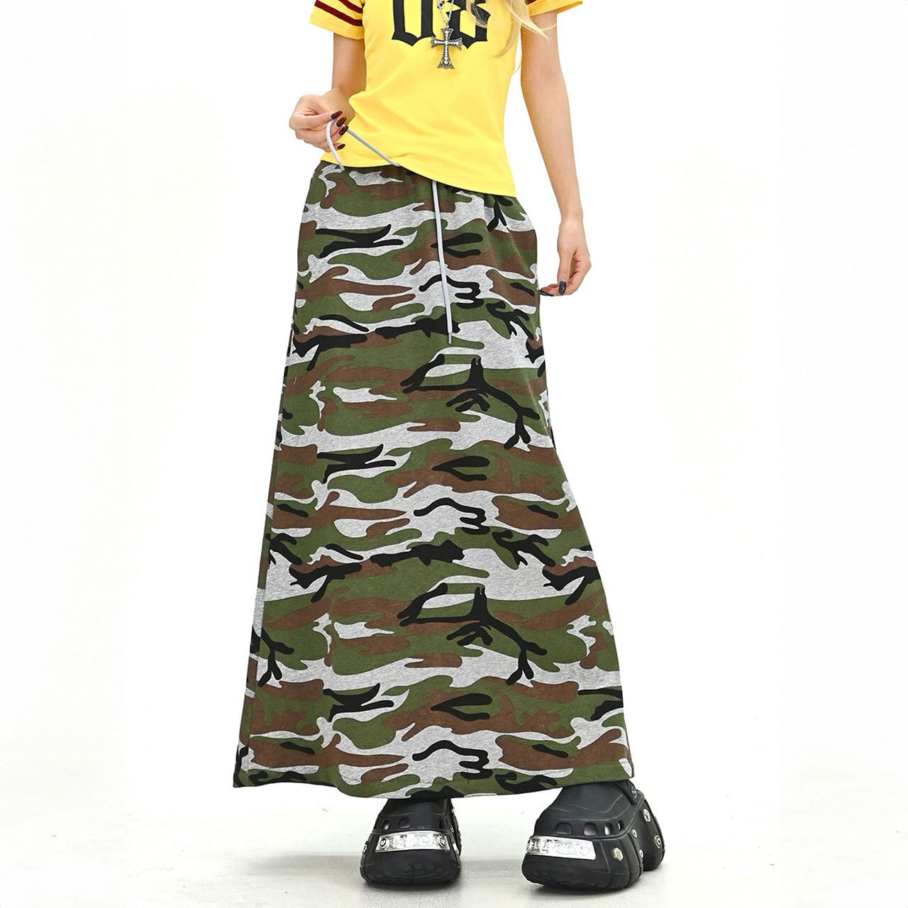 存在感のあるカモフラ柄が目を惹く、ストリートムード漂うロングスカート。