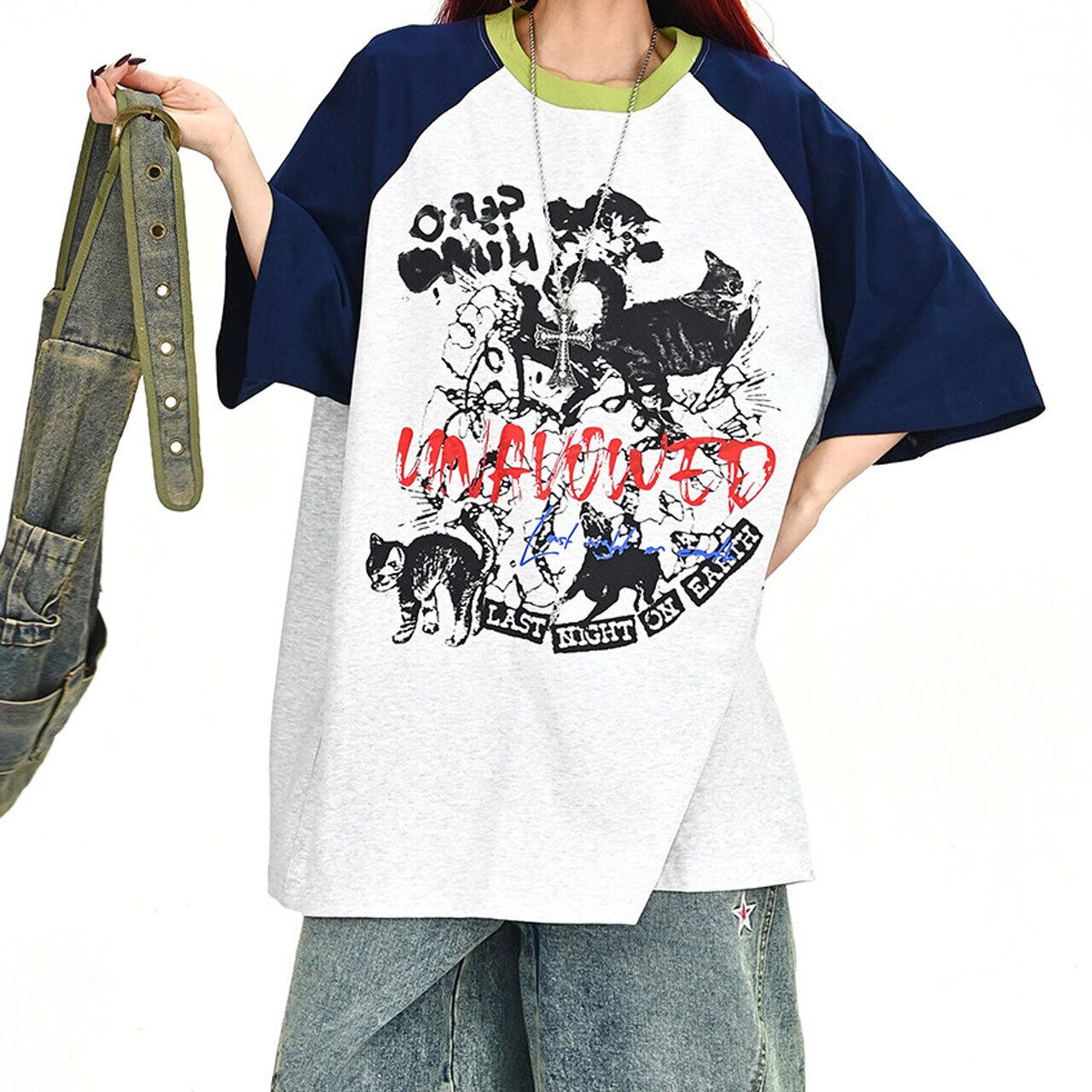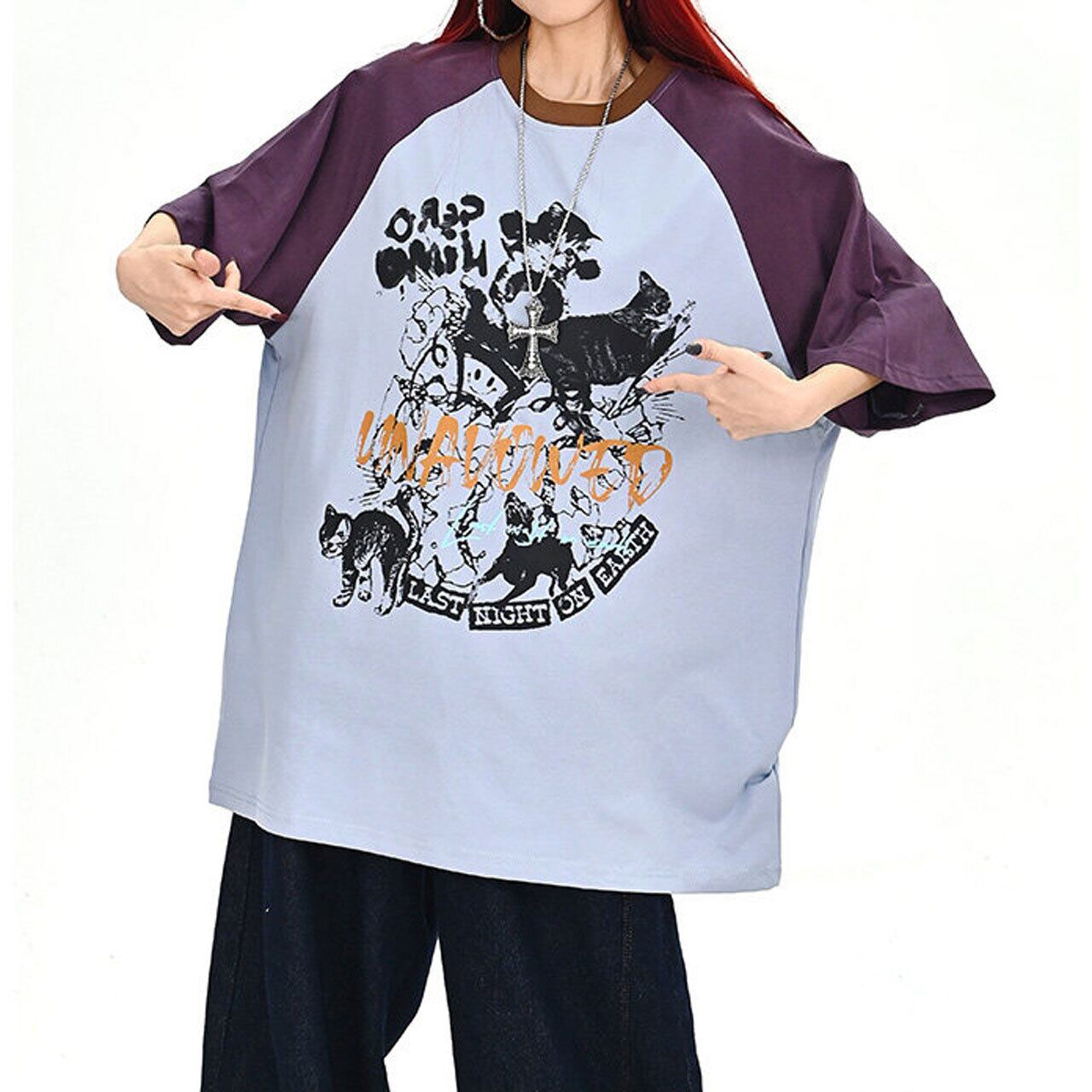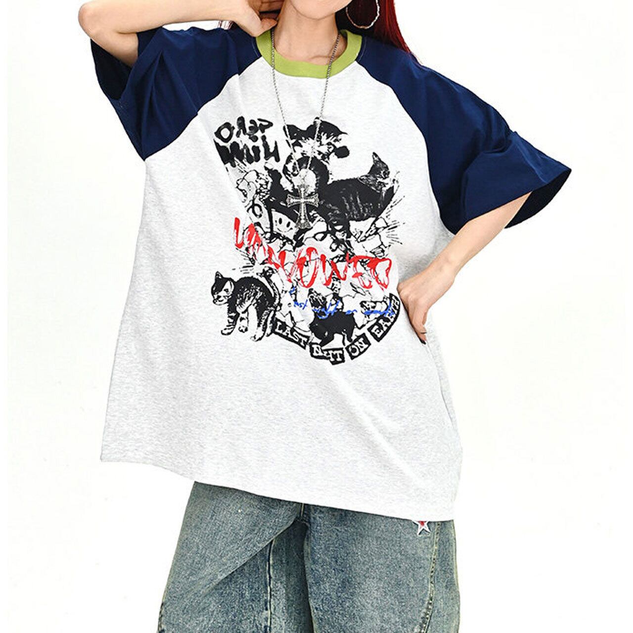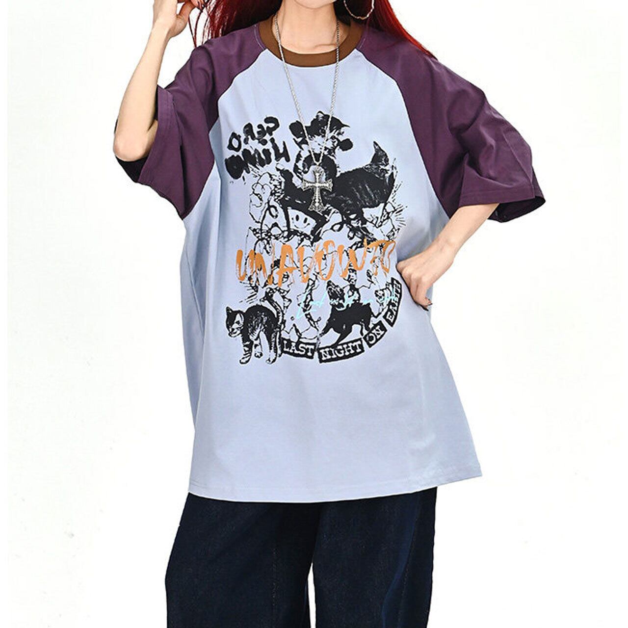 キャットグラフィックラグランビッグTシャツ 2col R01702