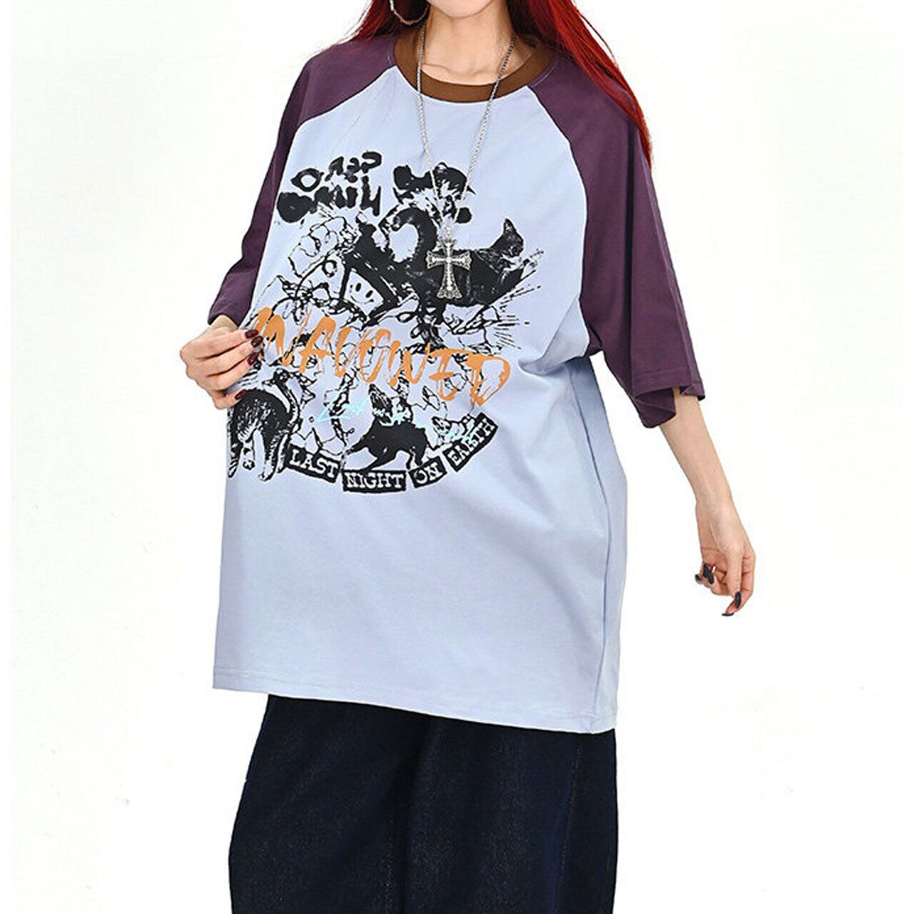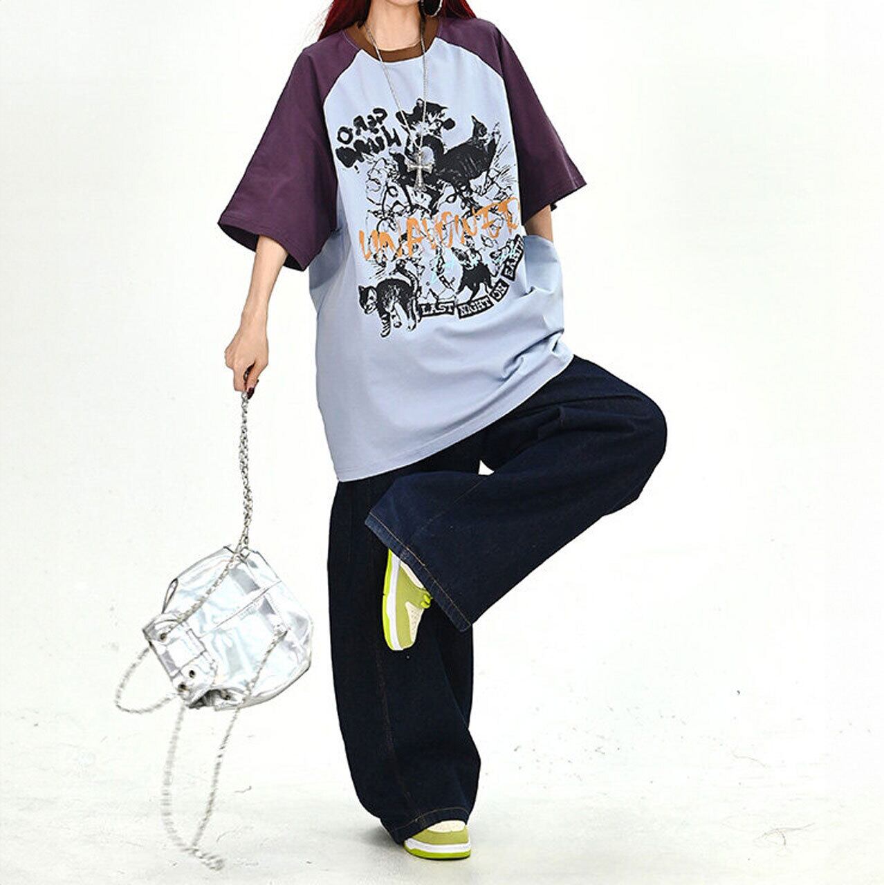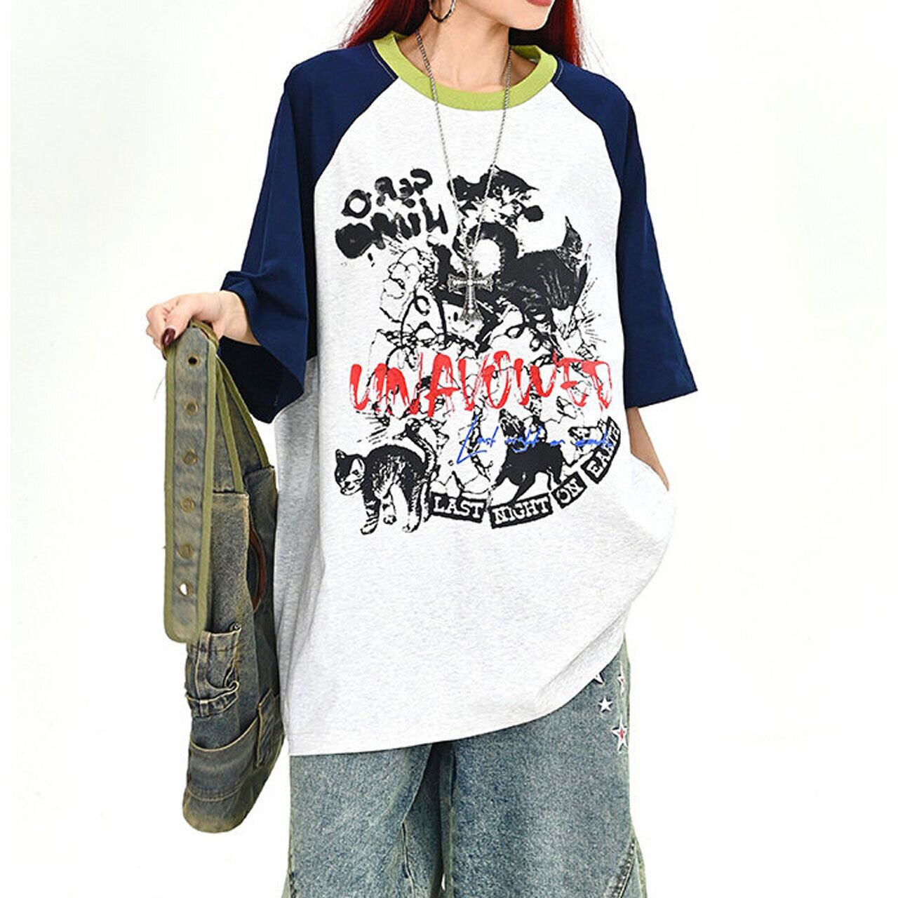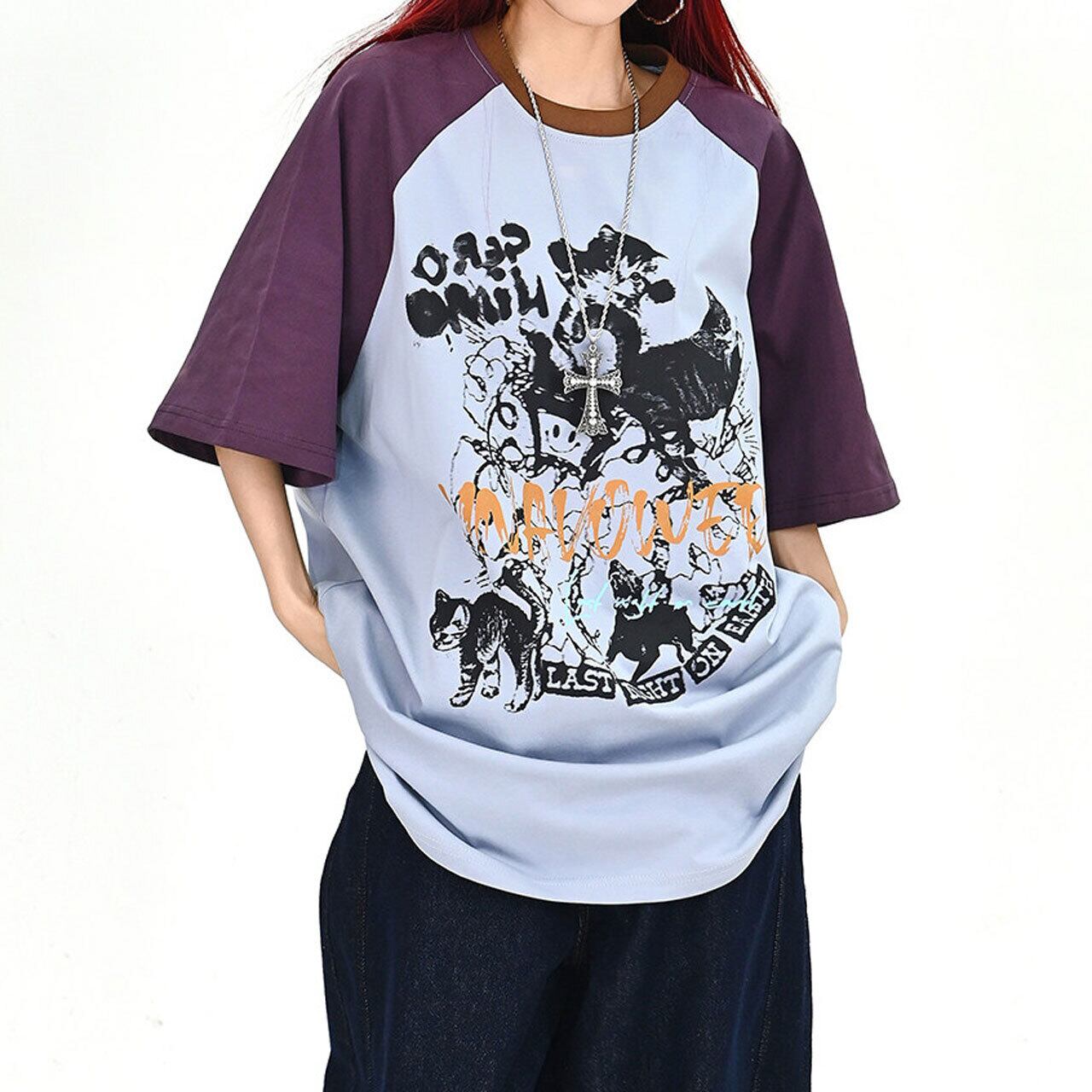 キャットグラフィックラグランビッグTシャツ 2col R01702