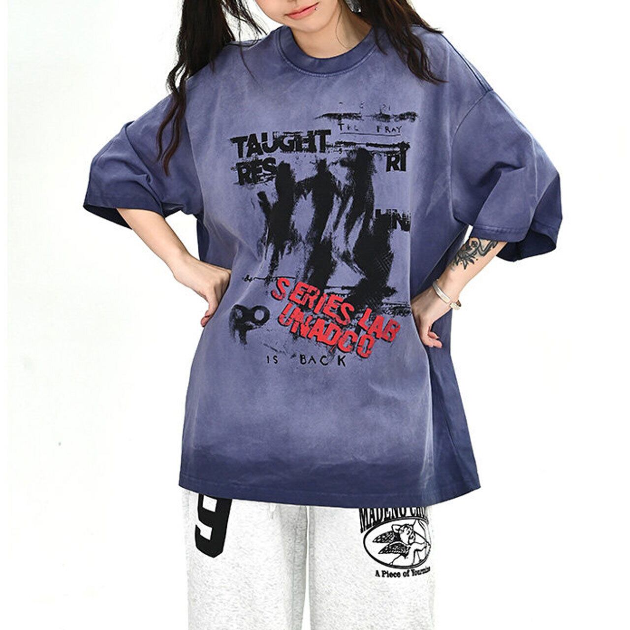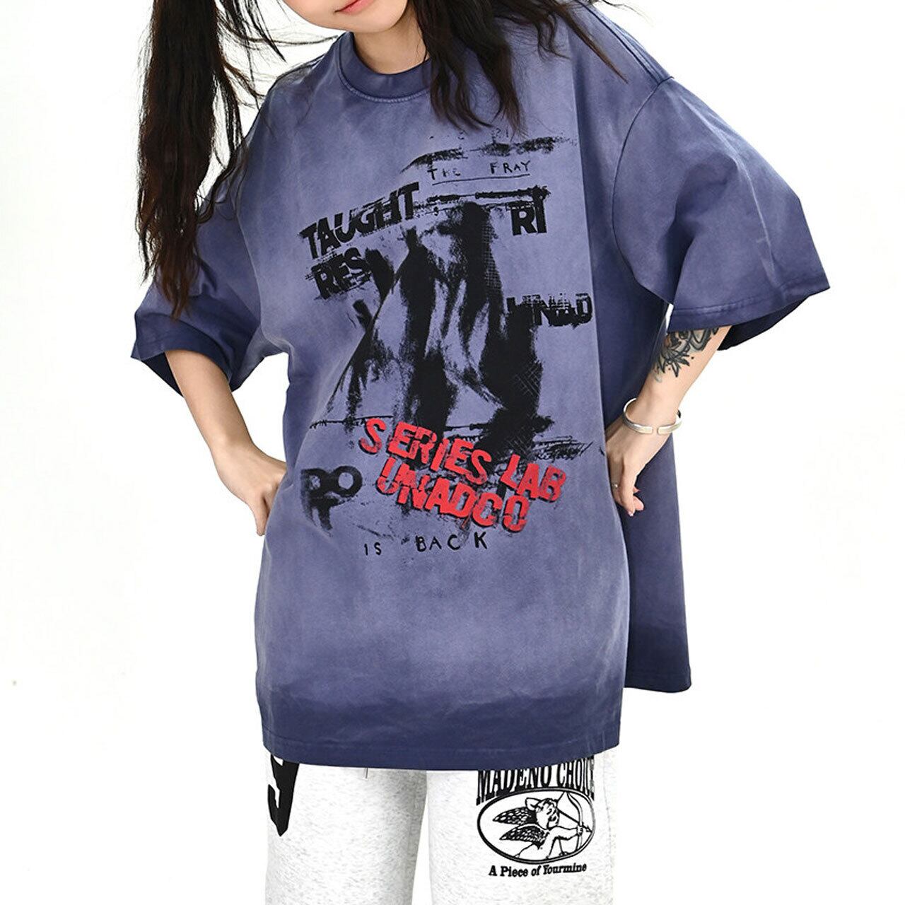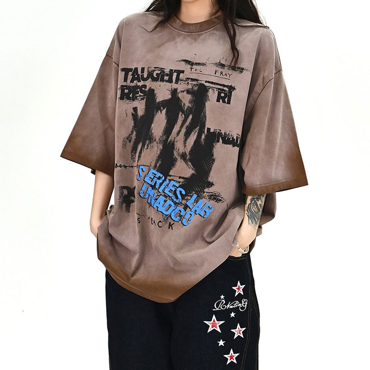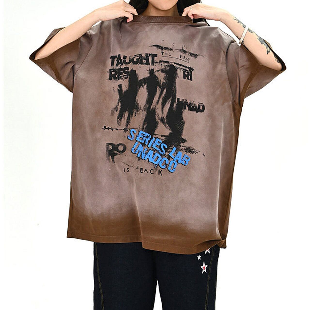 ムラ感のあるボディに大胆なグラフィックを重ねた、存在感抜群のストリートT。