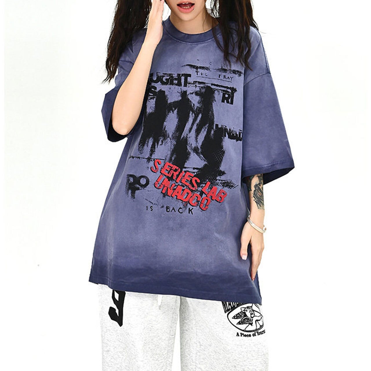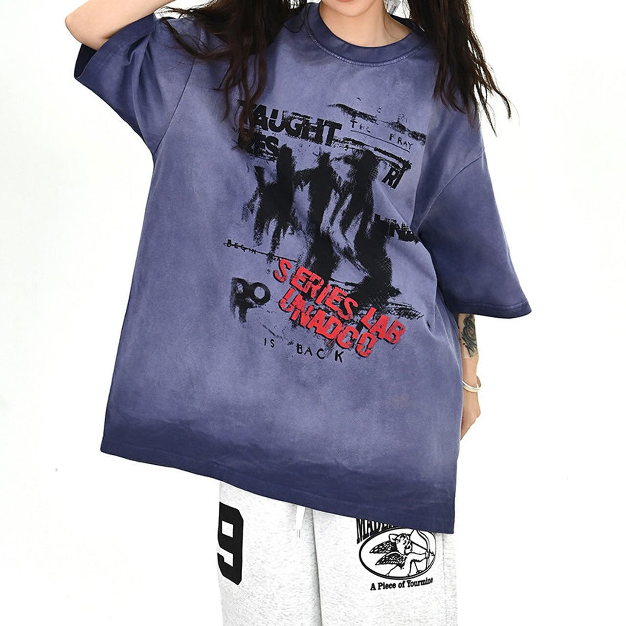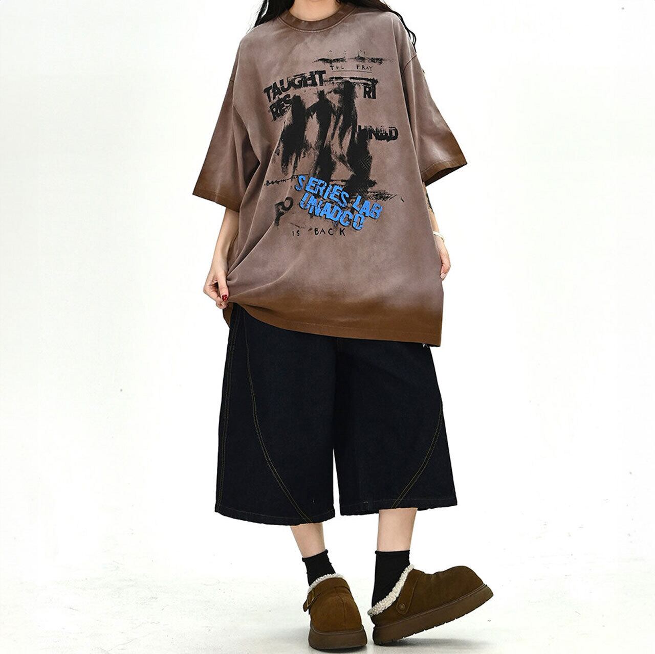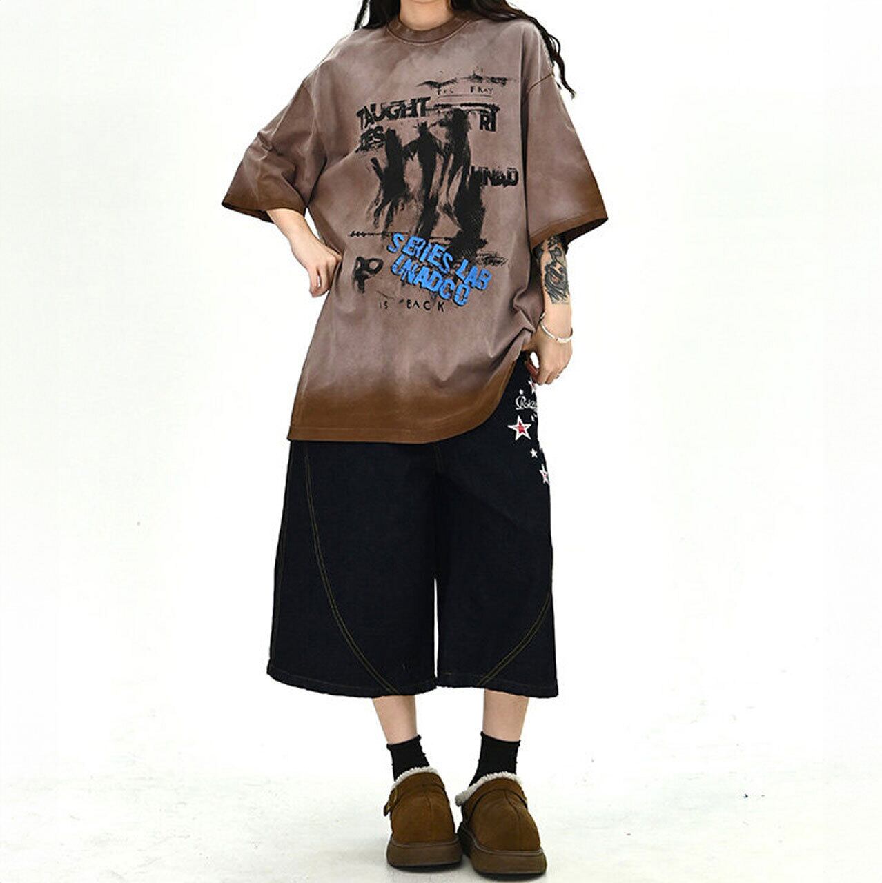 ムラ感のあるボディに大胆なグラフィックを重ねた、存在感抜群のストリートT。