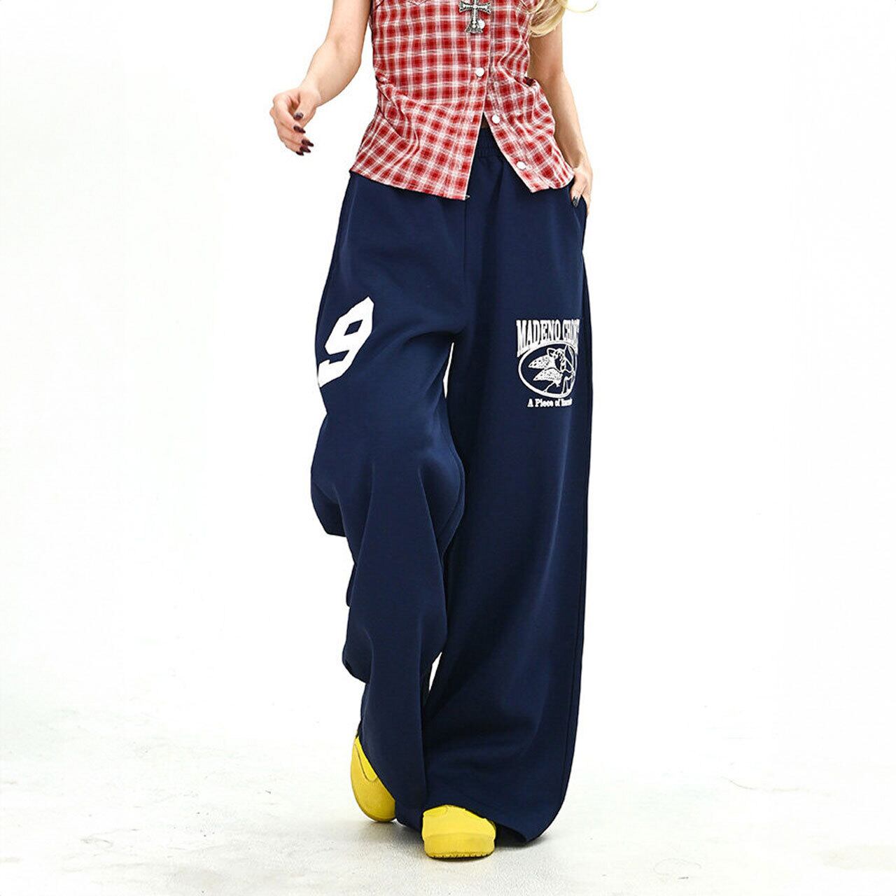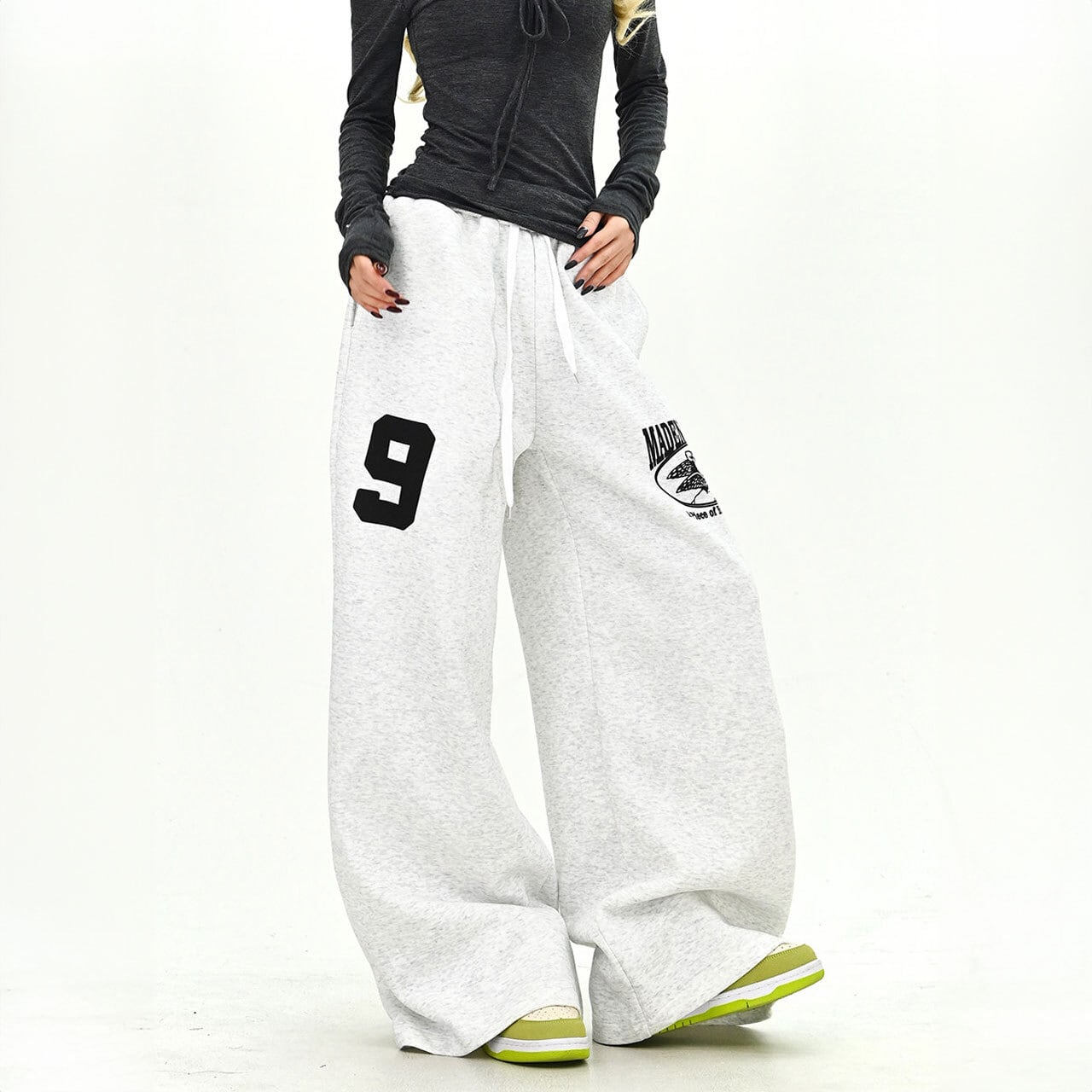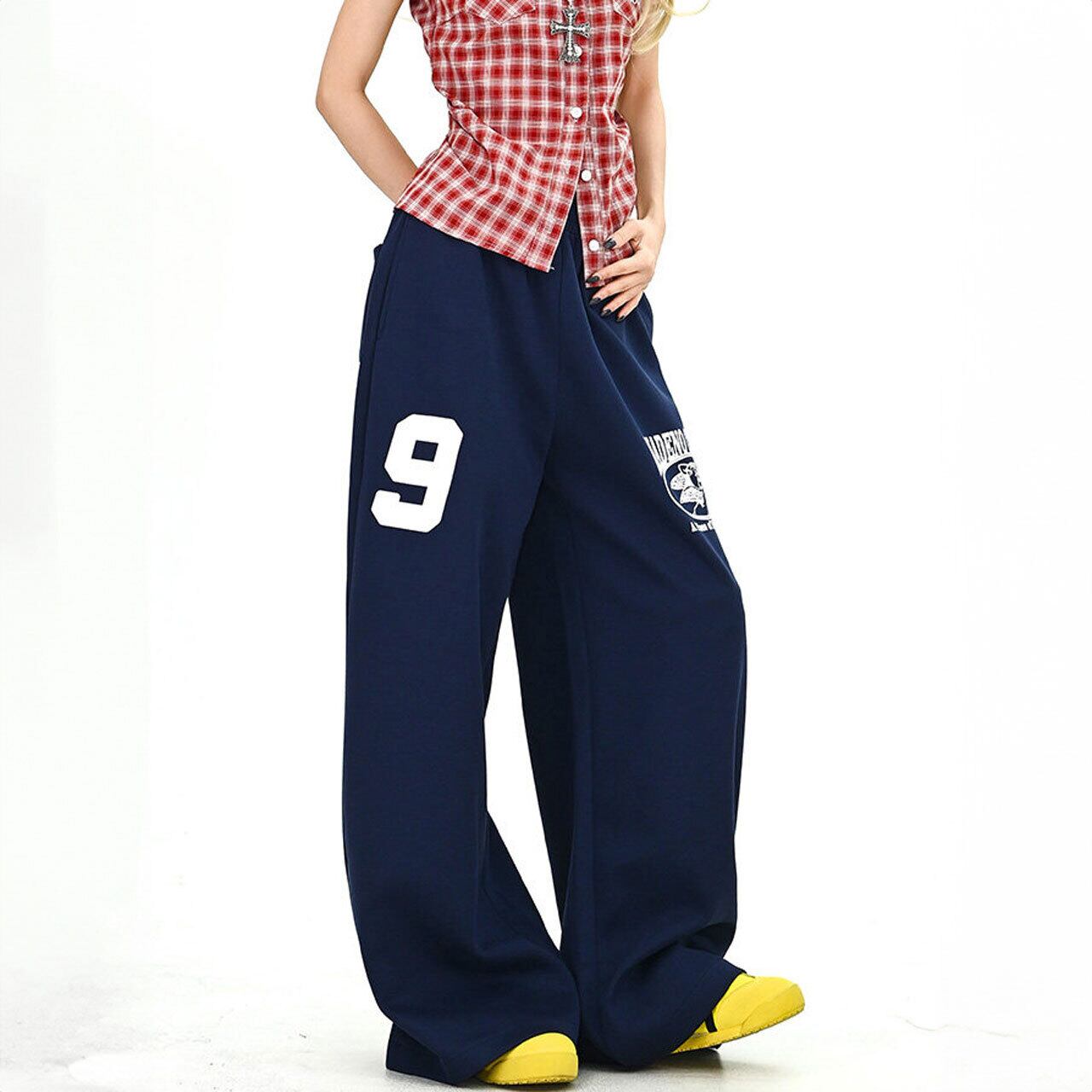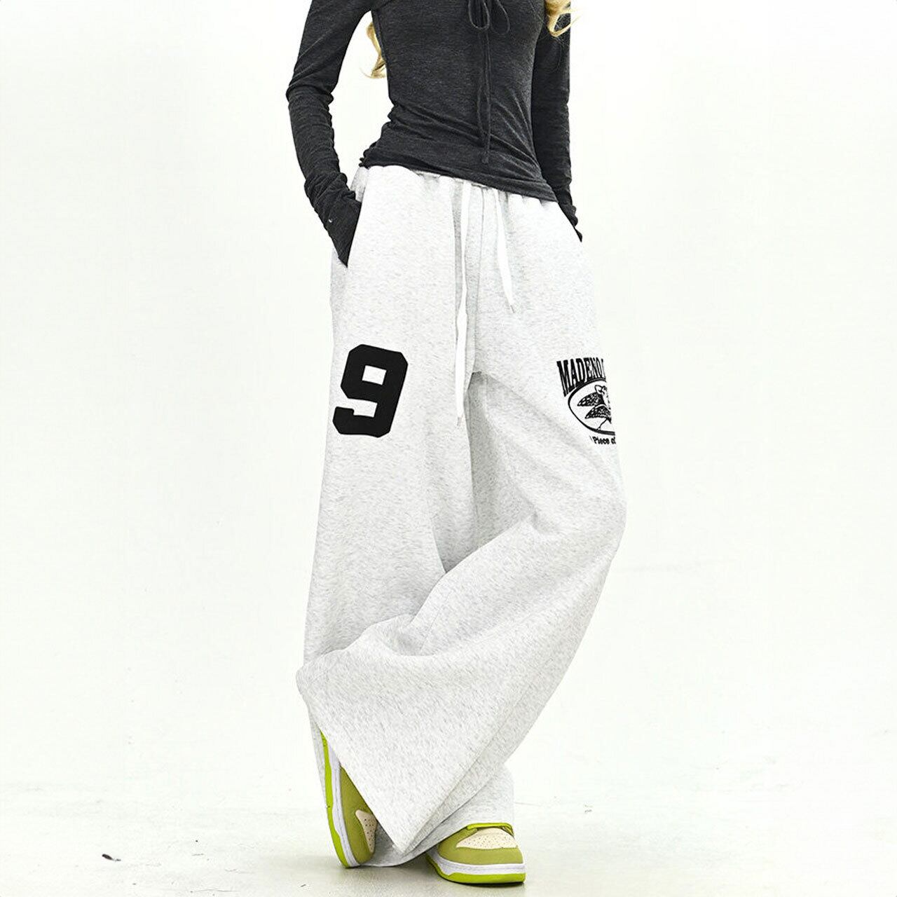 大胆なナンバーモチーフとレタリングデザインが映える、ストリート感たっぷりのワイドパンツ。