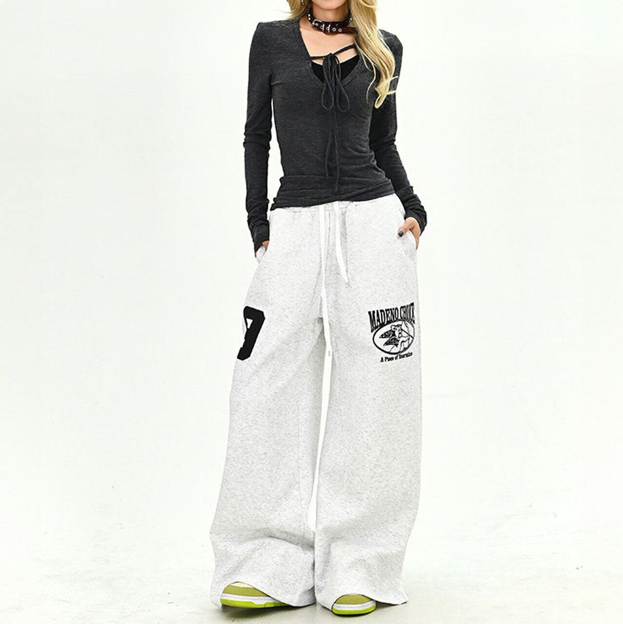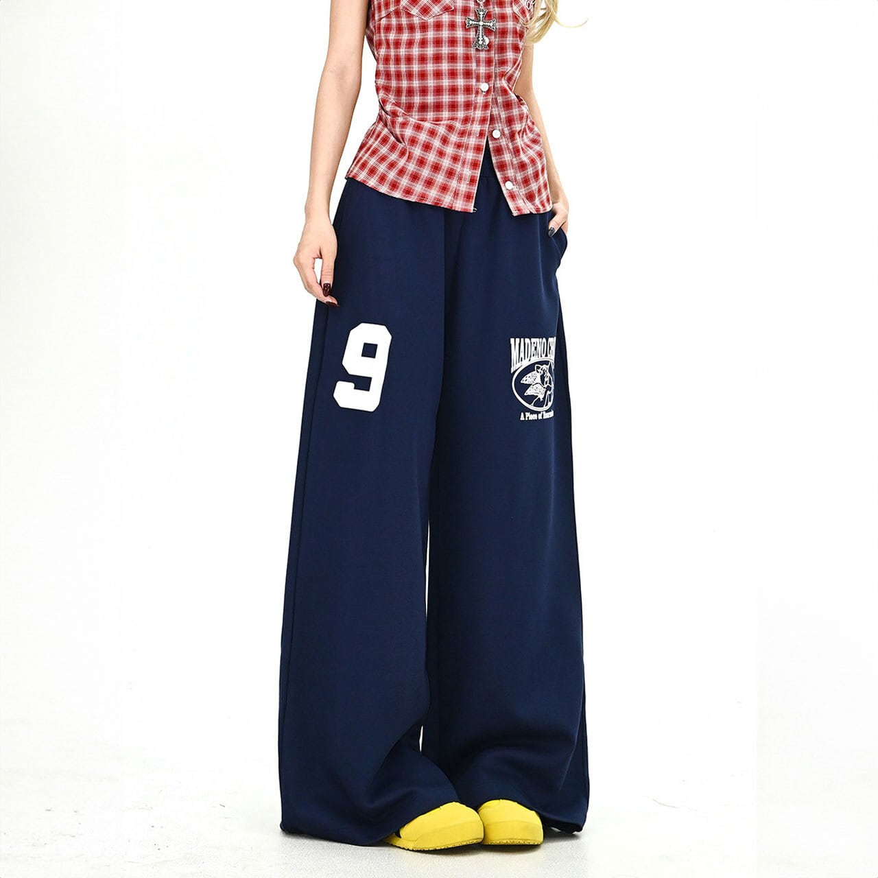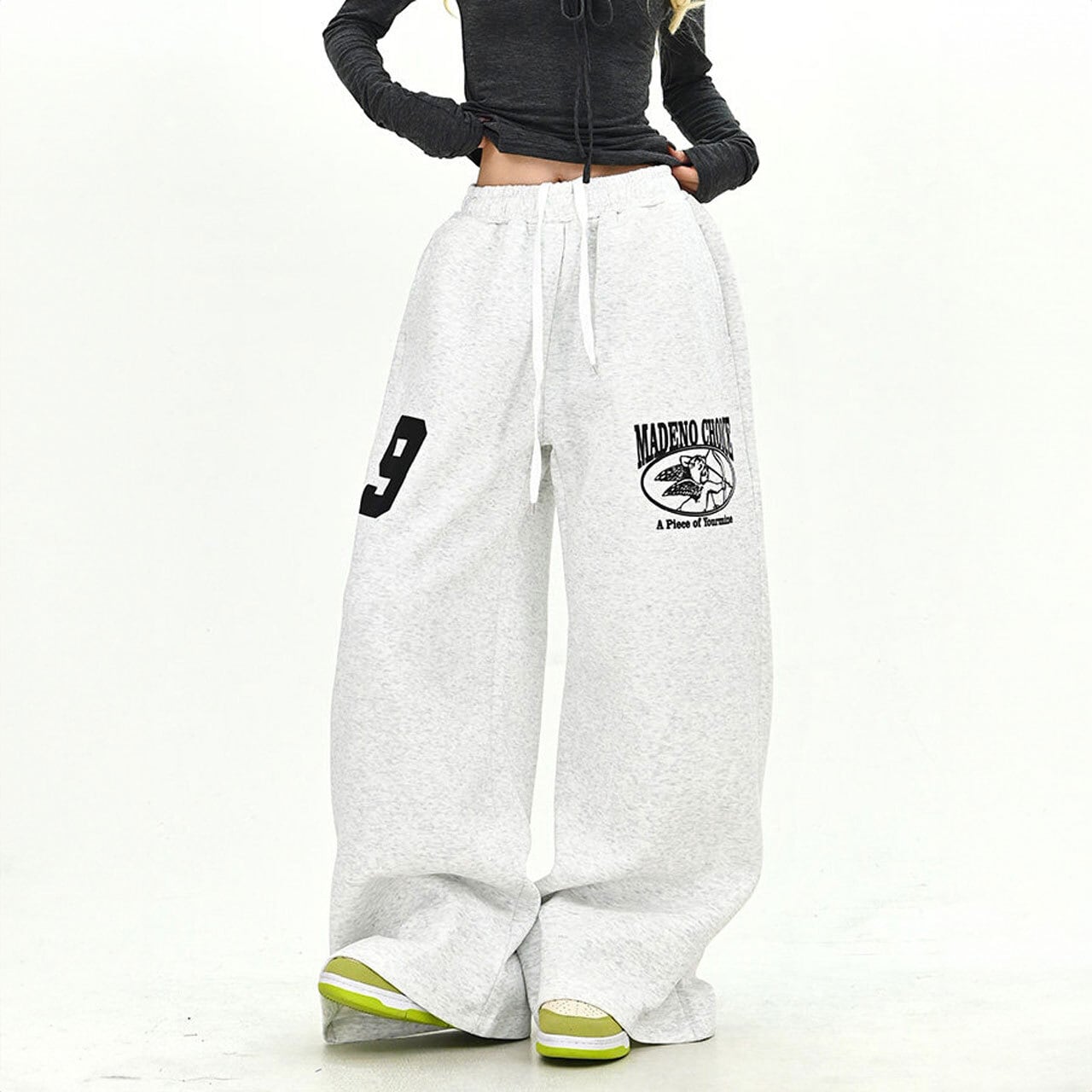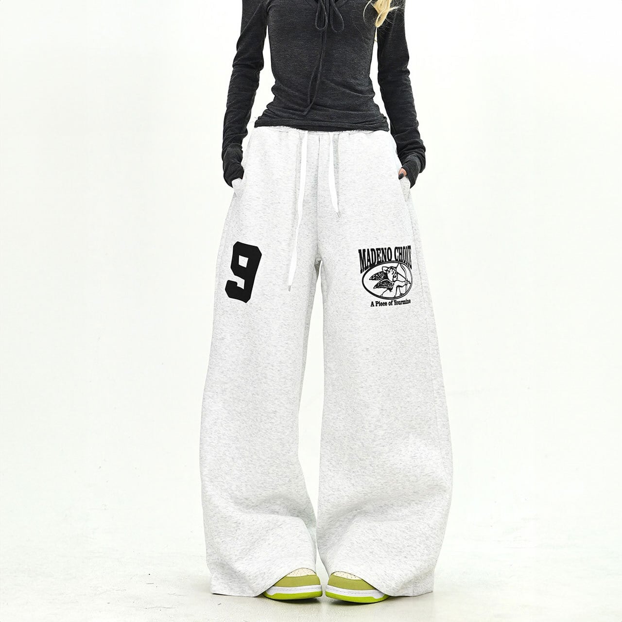大胆なナンバーモチーフとレタリングデザインが映える、ストリート感たっぷりのワイドパンツ。