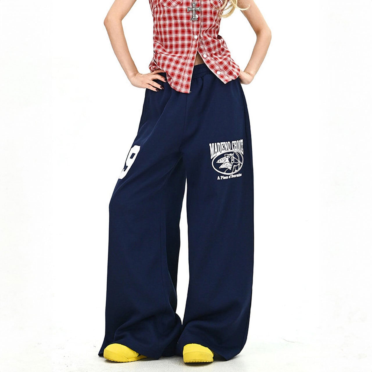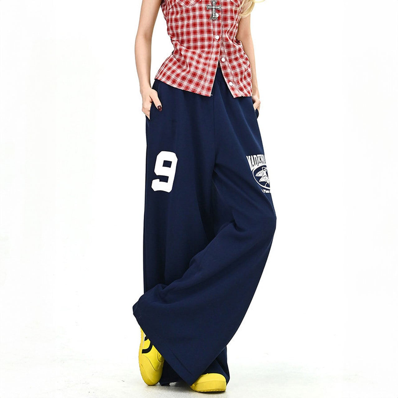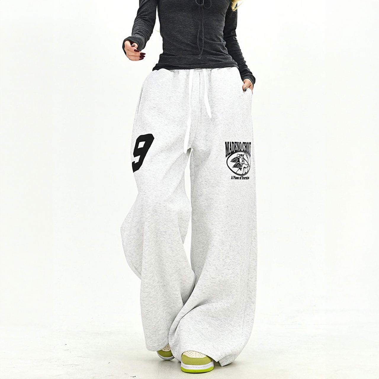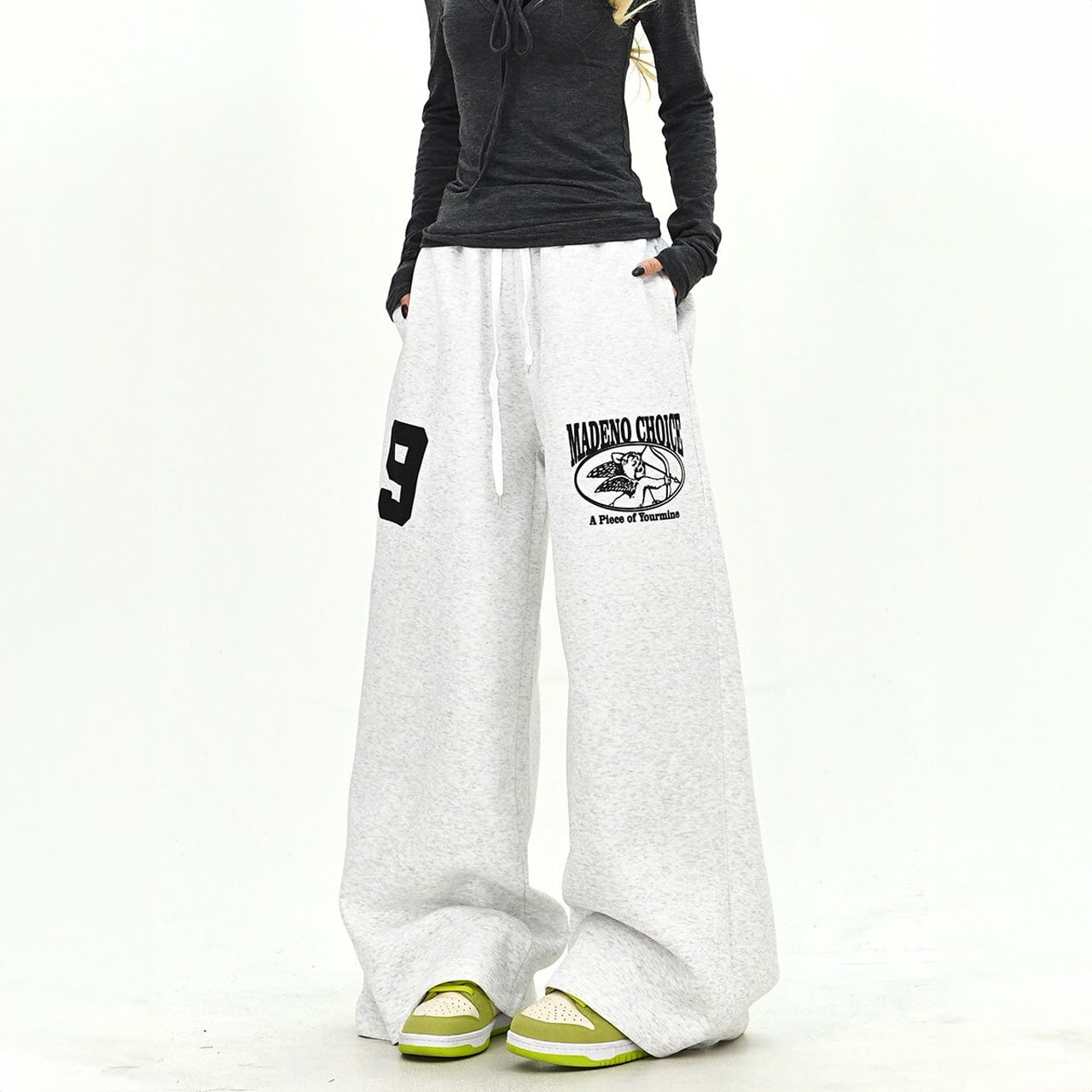大胆なナンバーモチーフとレタリングデザインが映える、ストリート感たっぷりのワイドパンツ。
