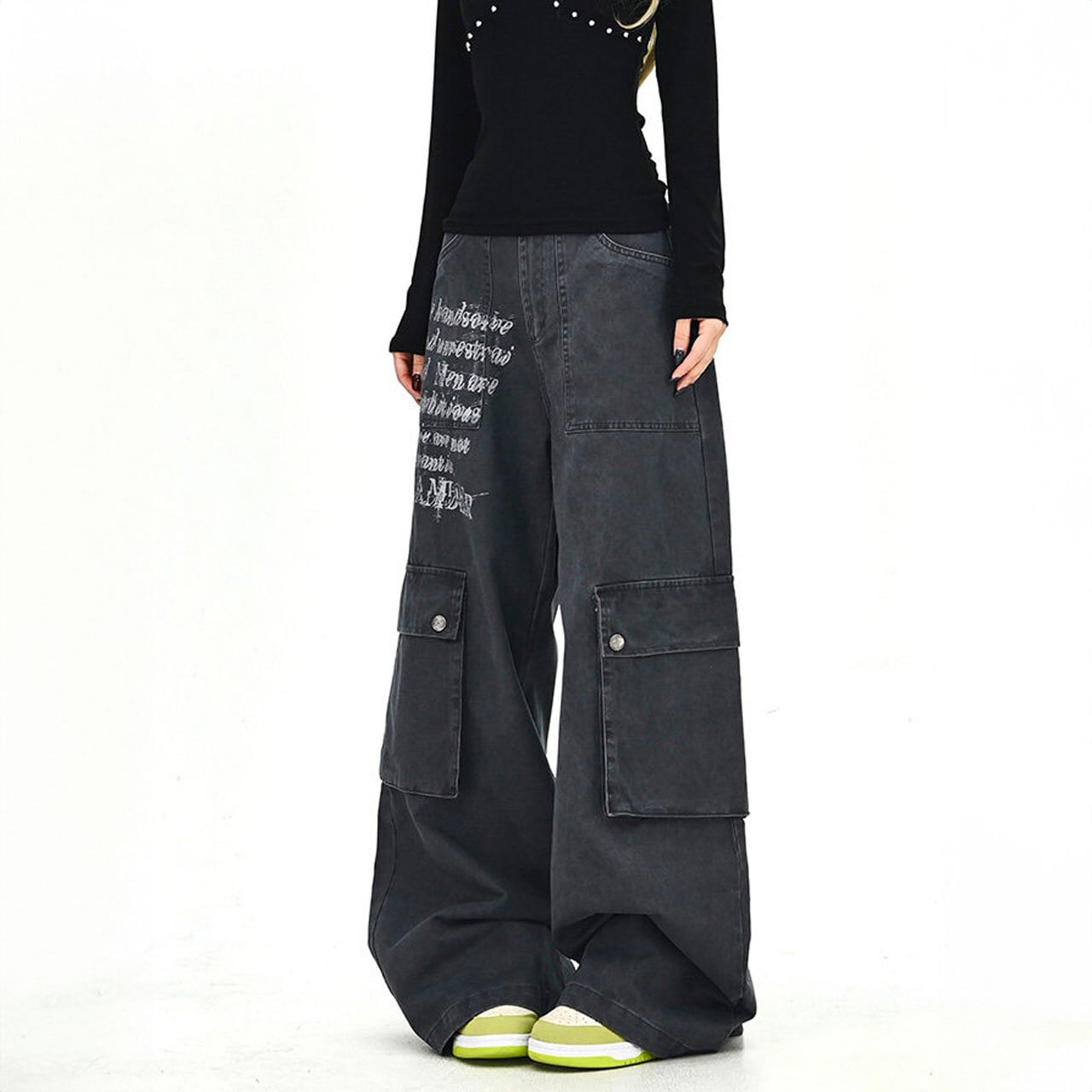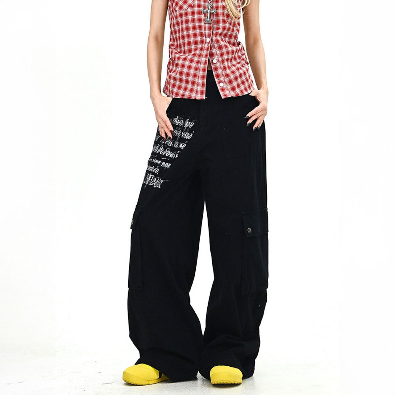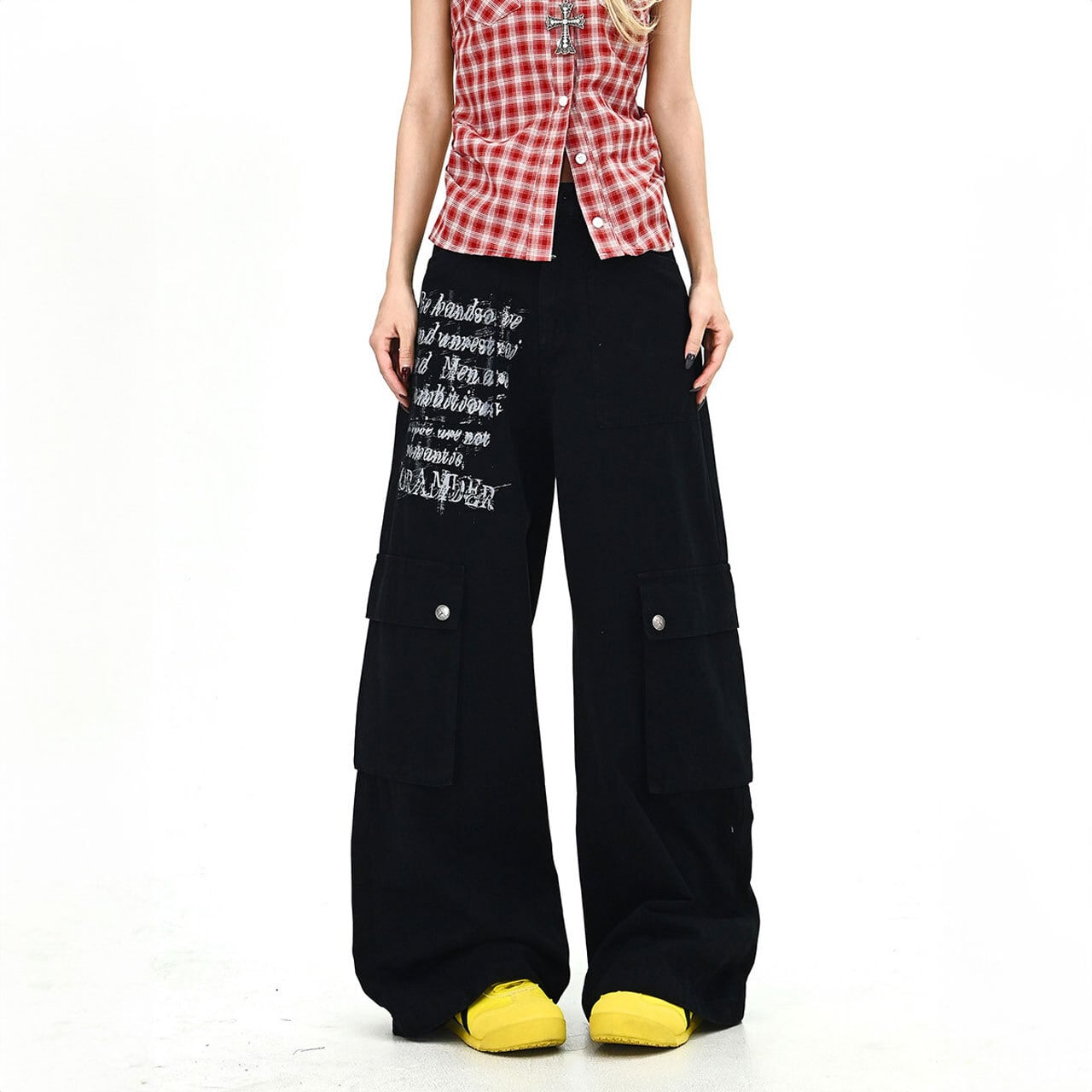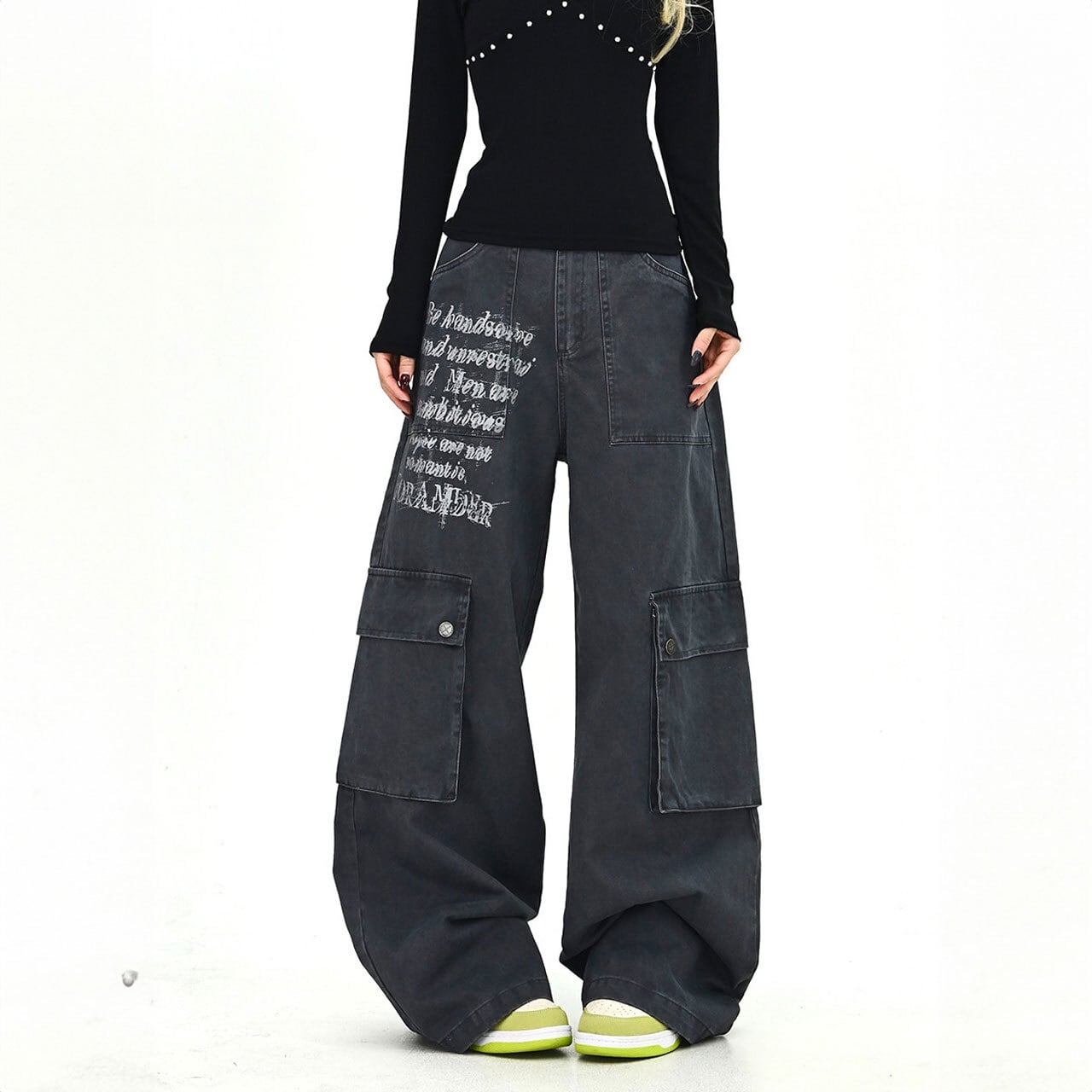 大胆なレタリングデザインと立体的なカーゴポケットが目を引く、ストリート感漂うワイドパンツ。