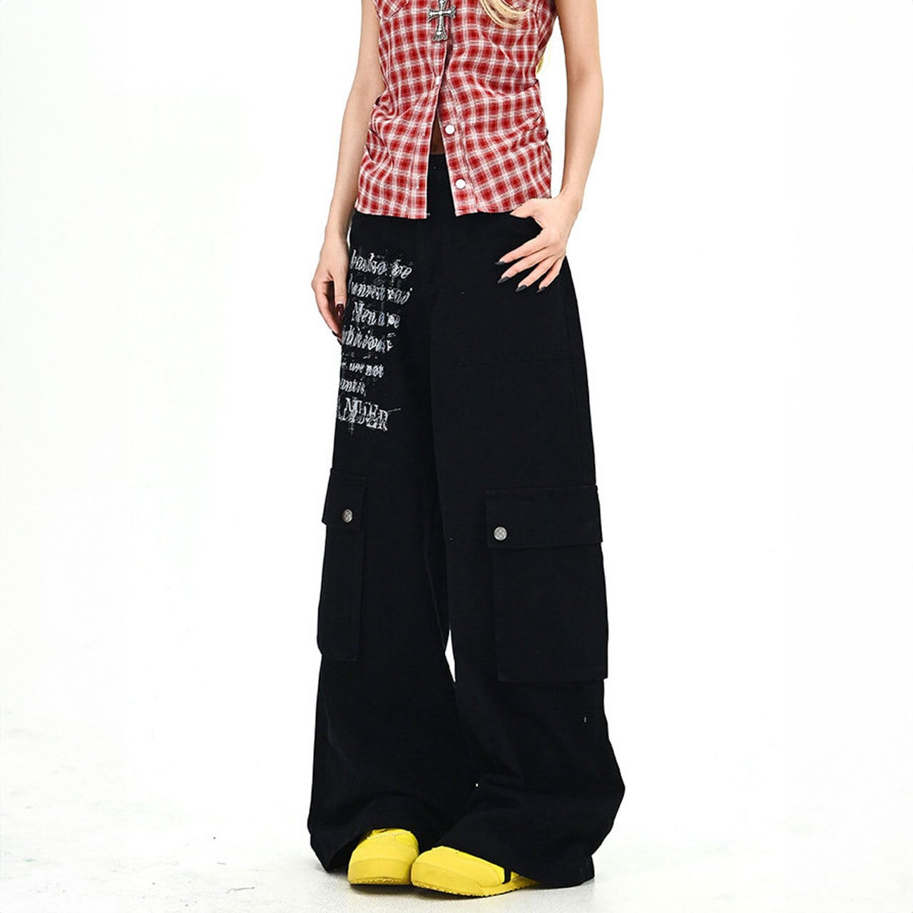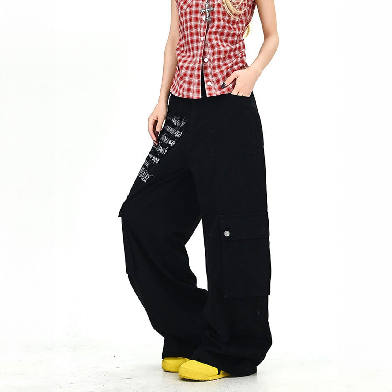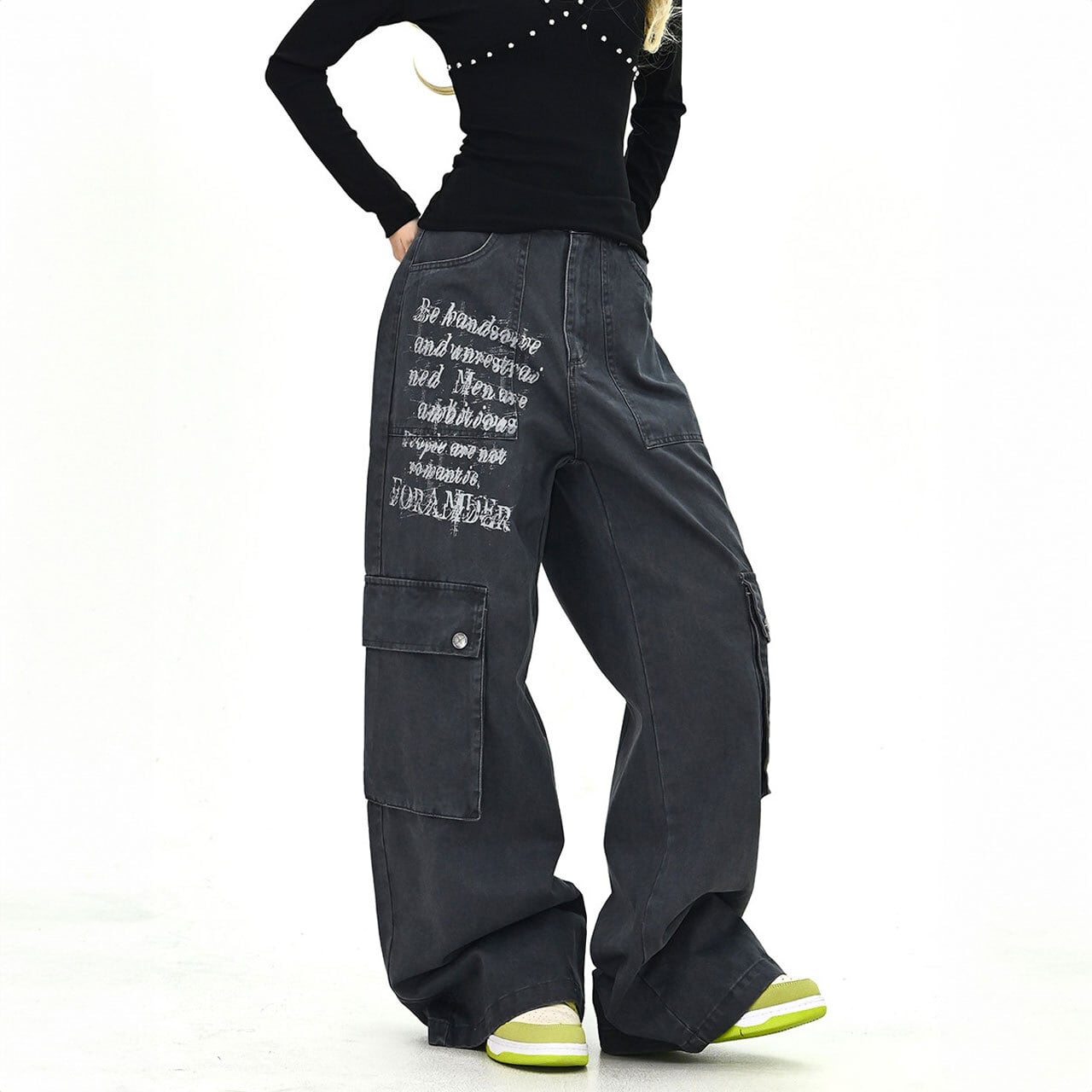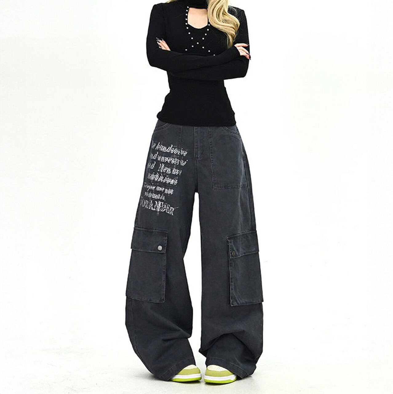 大胆なレタリングデザインと立体的なカーゴポケットが目を引く、ストリート感漂うワイドパンツ。