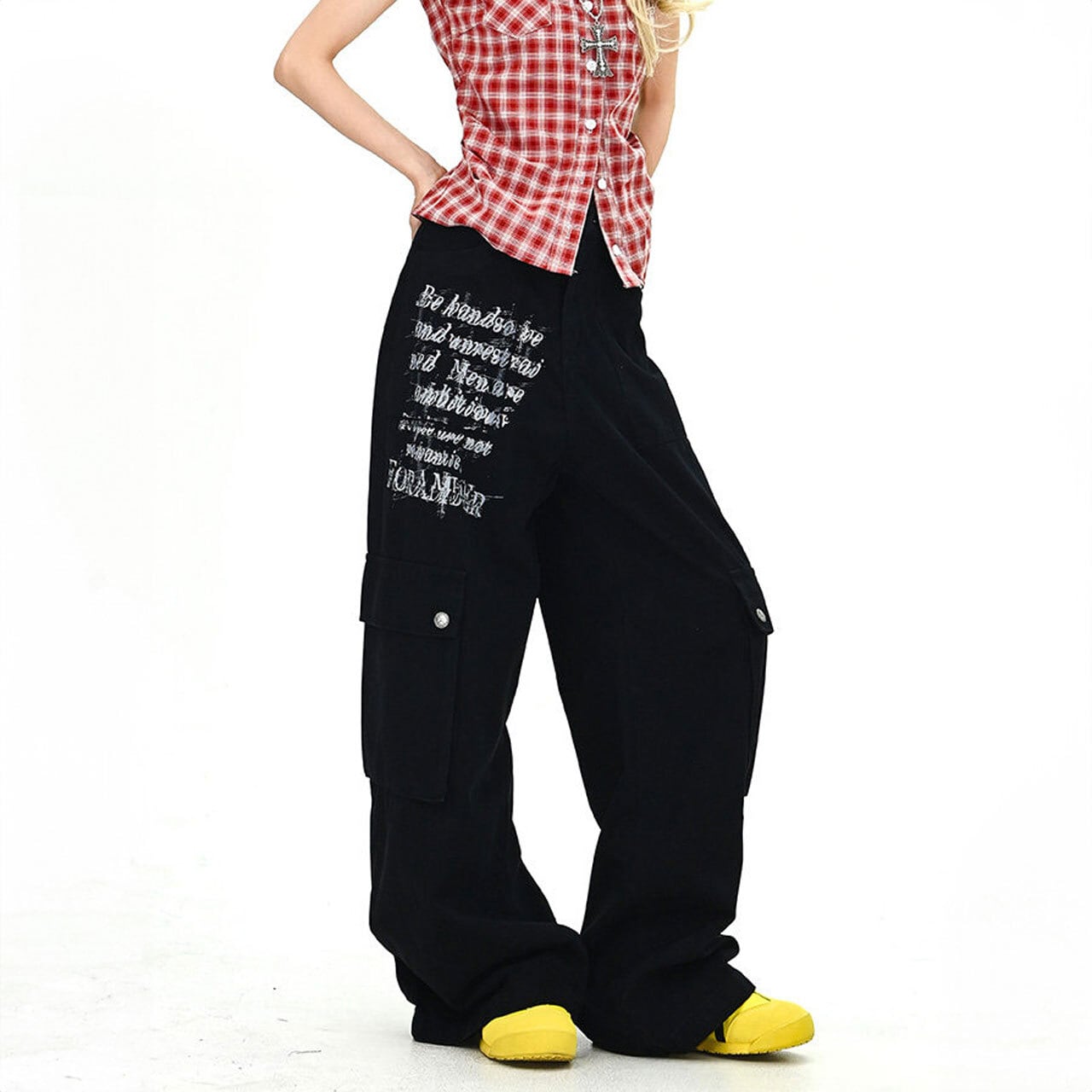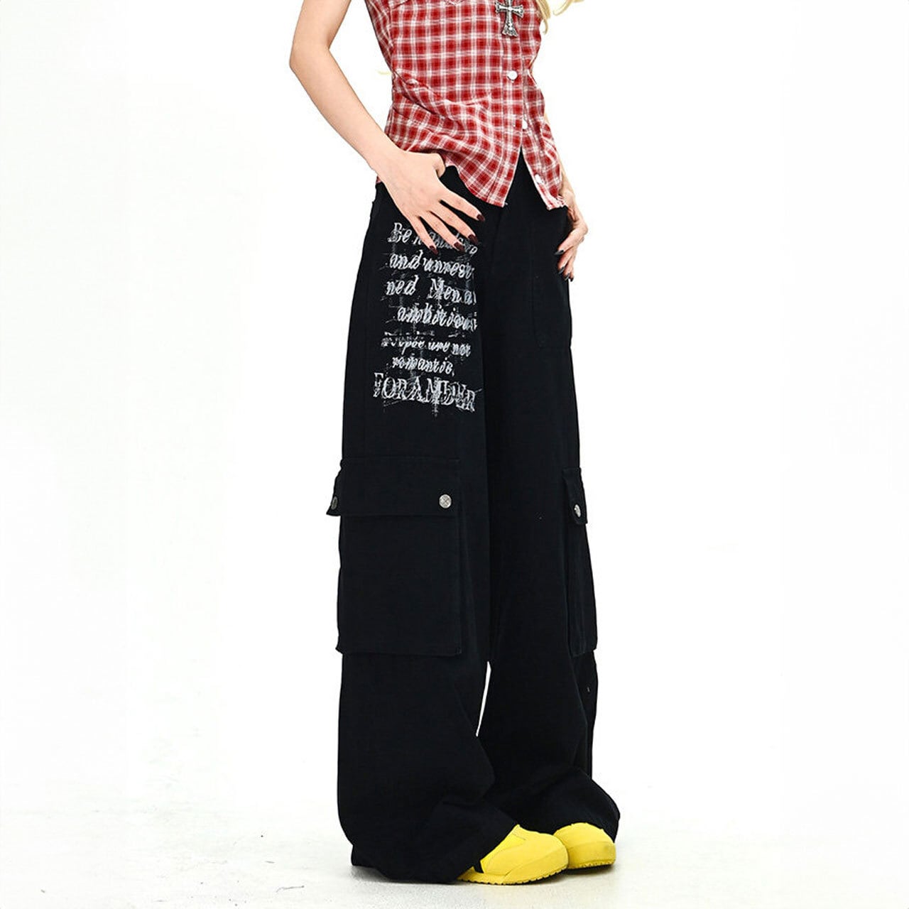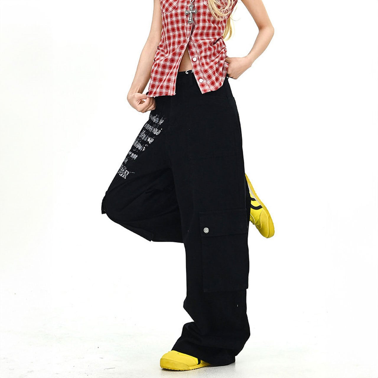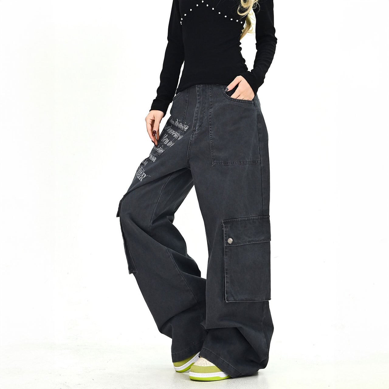 大胆なレタリングデザインと立体的なカーゴポケットが目を引く、ストリート感漂うワイドパンツ。