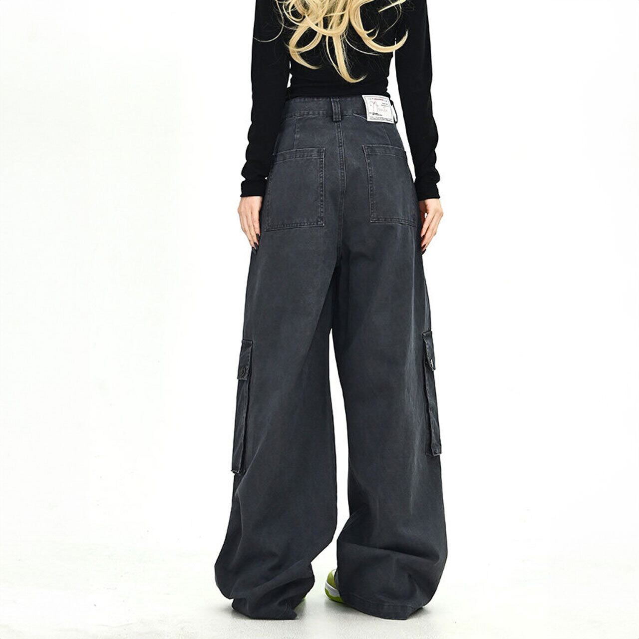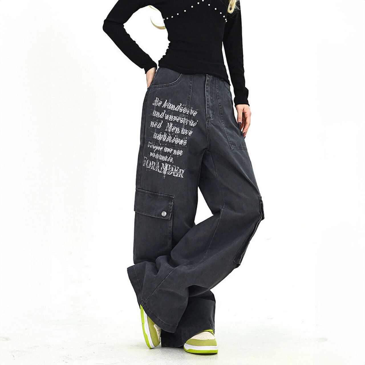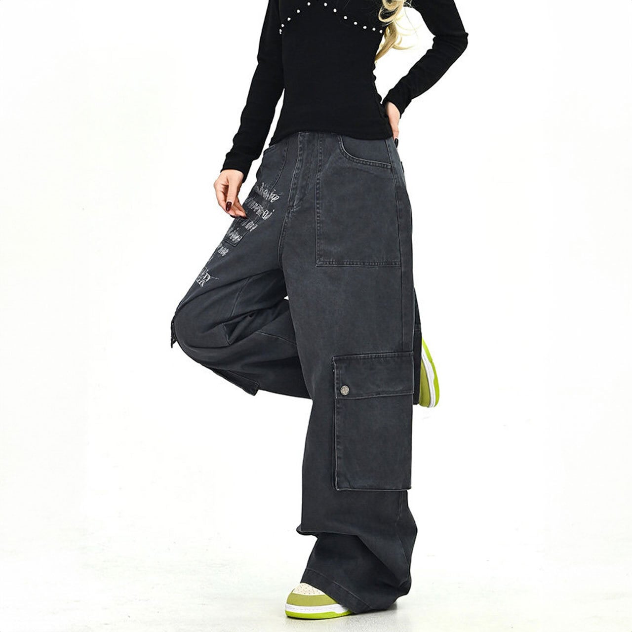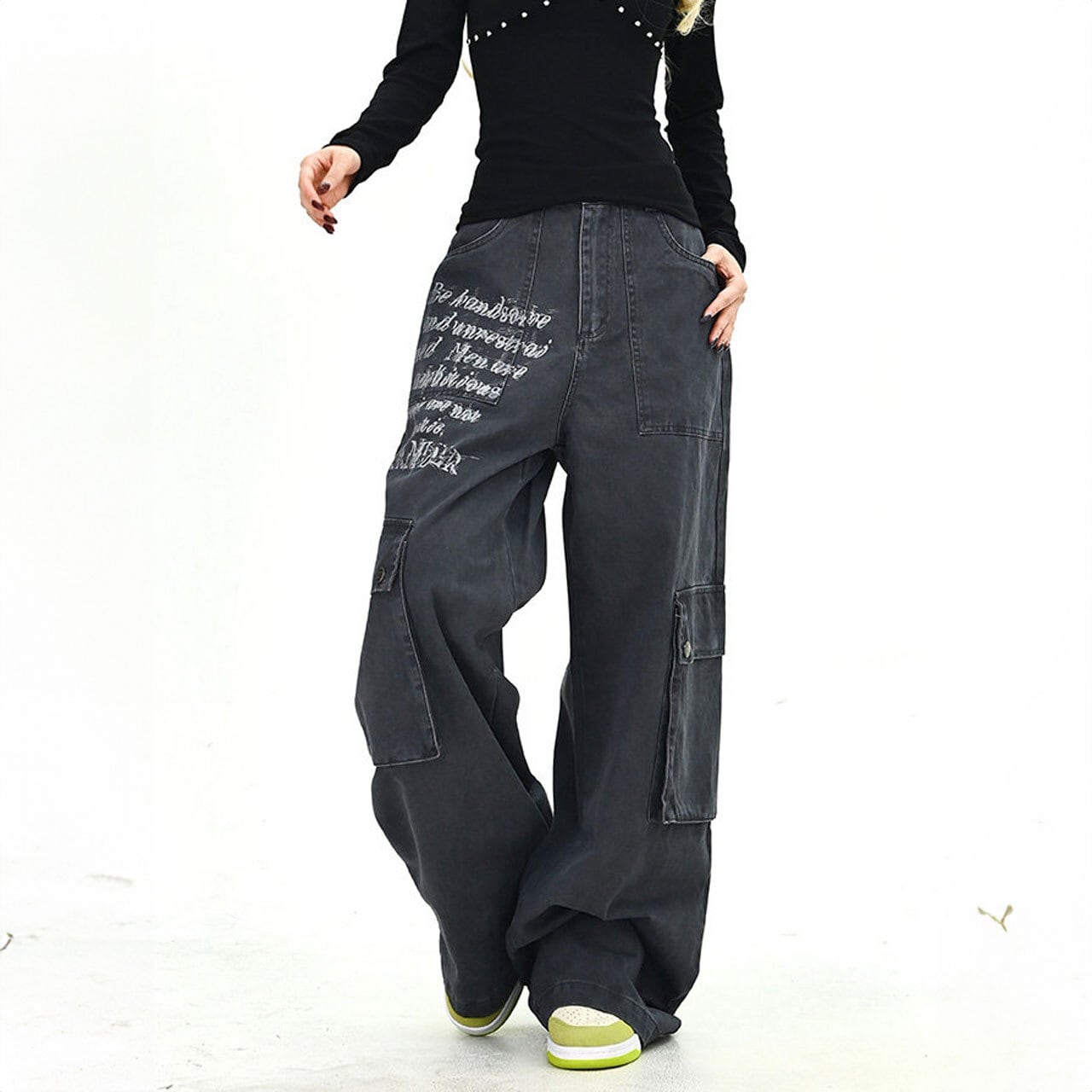 大胆なレタリングデザインと立体的なカーゴポケットが目を引く、ストリート感漂うワイドパンツ。