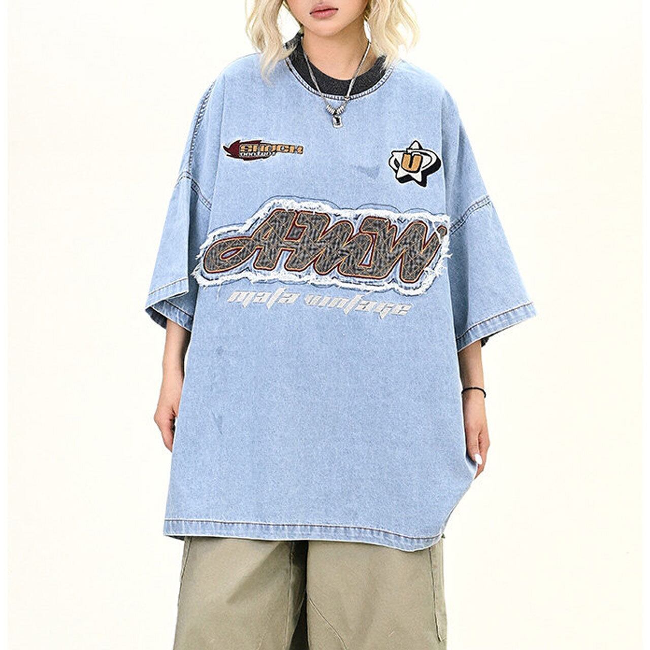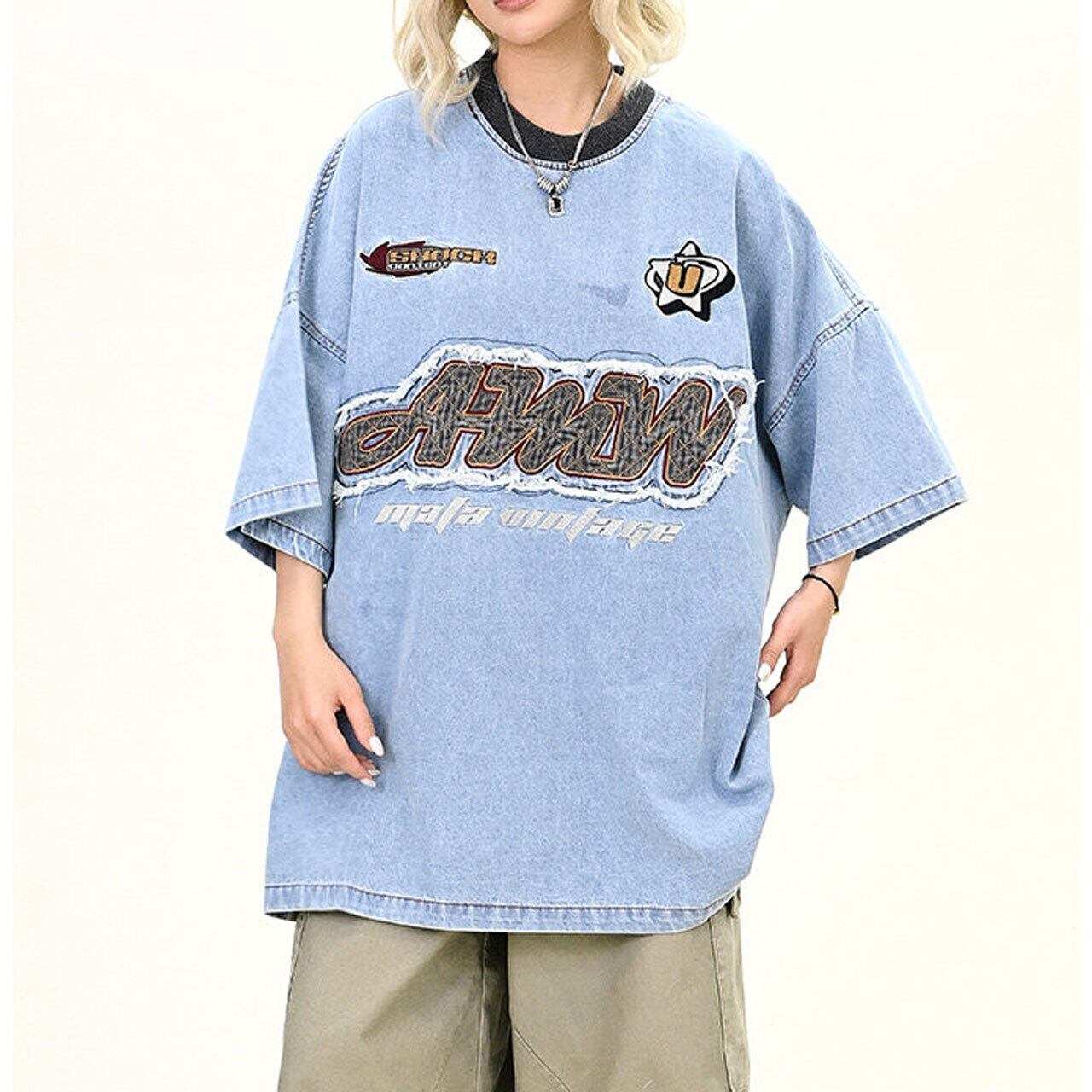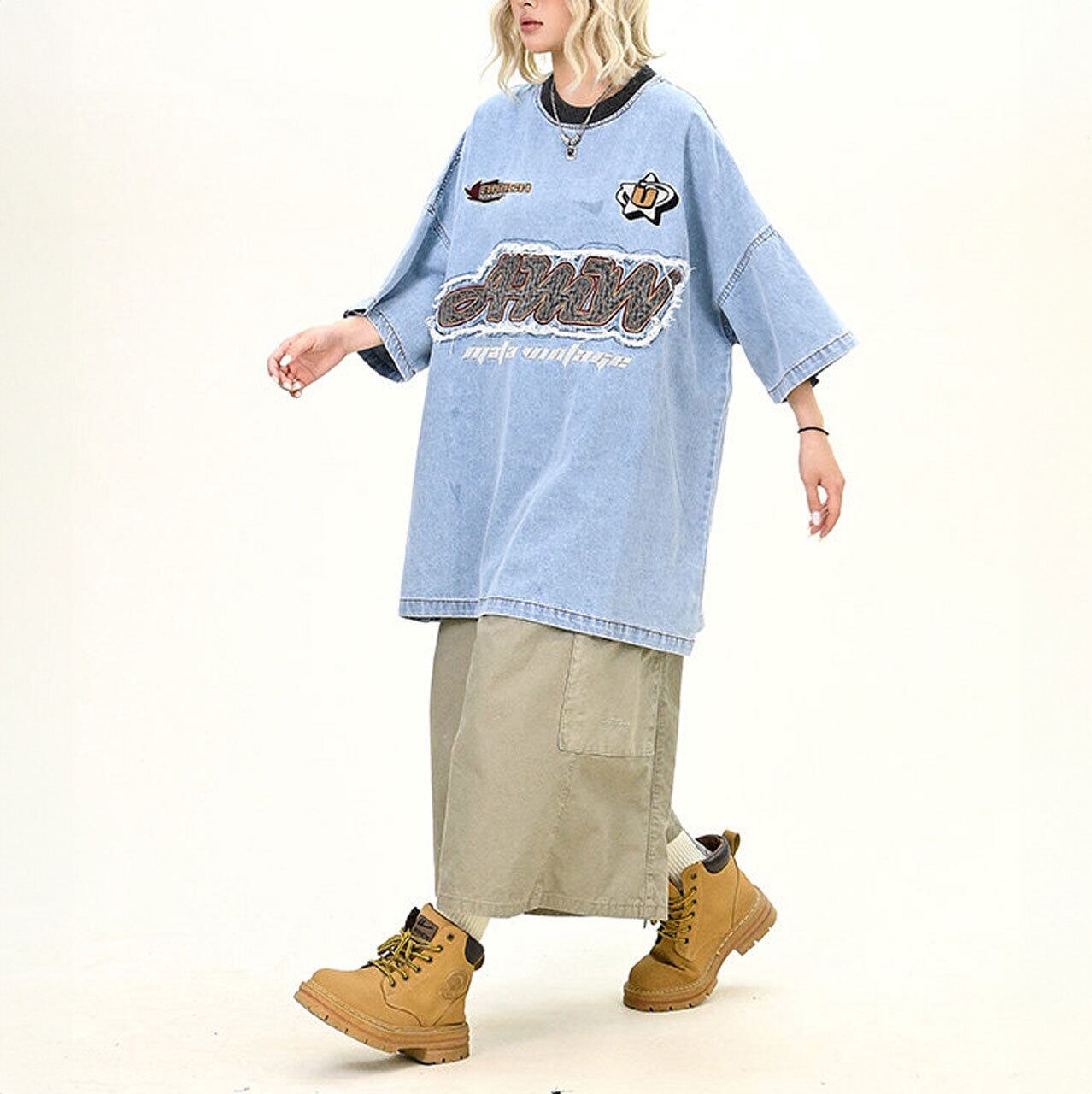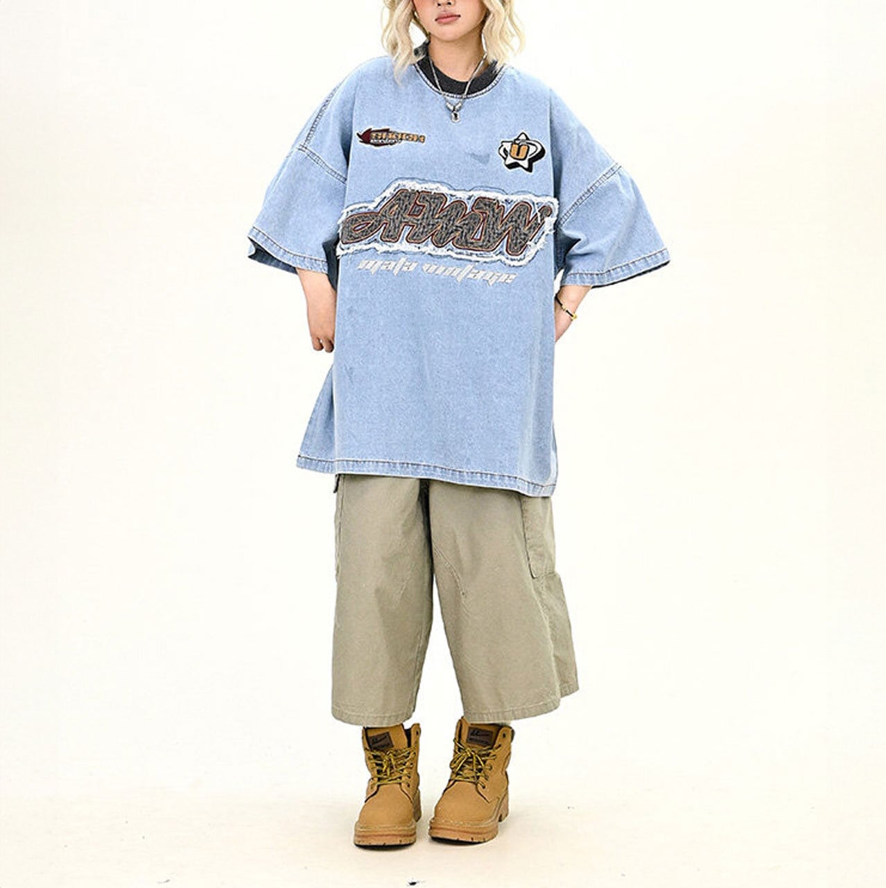 胸元に散りばめられたロゴやワッペン風デザインが、ポップなストリートムードを引き立てます。
