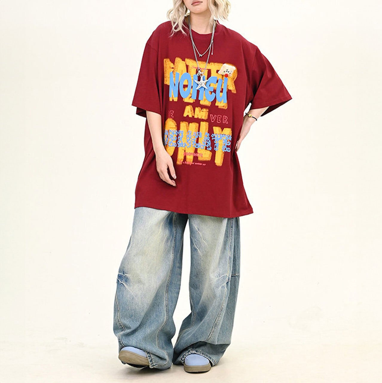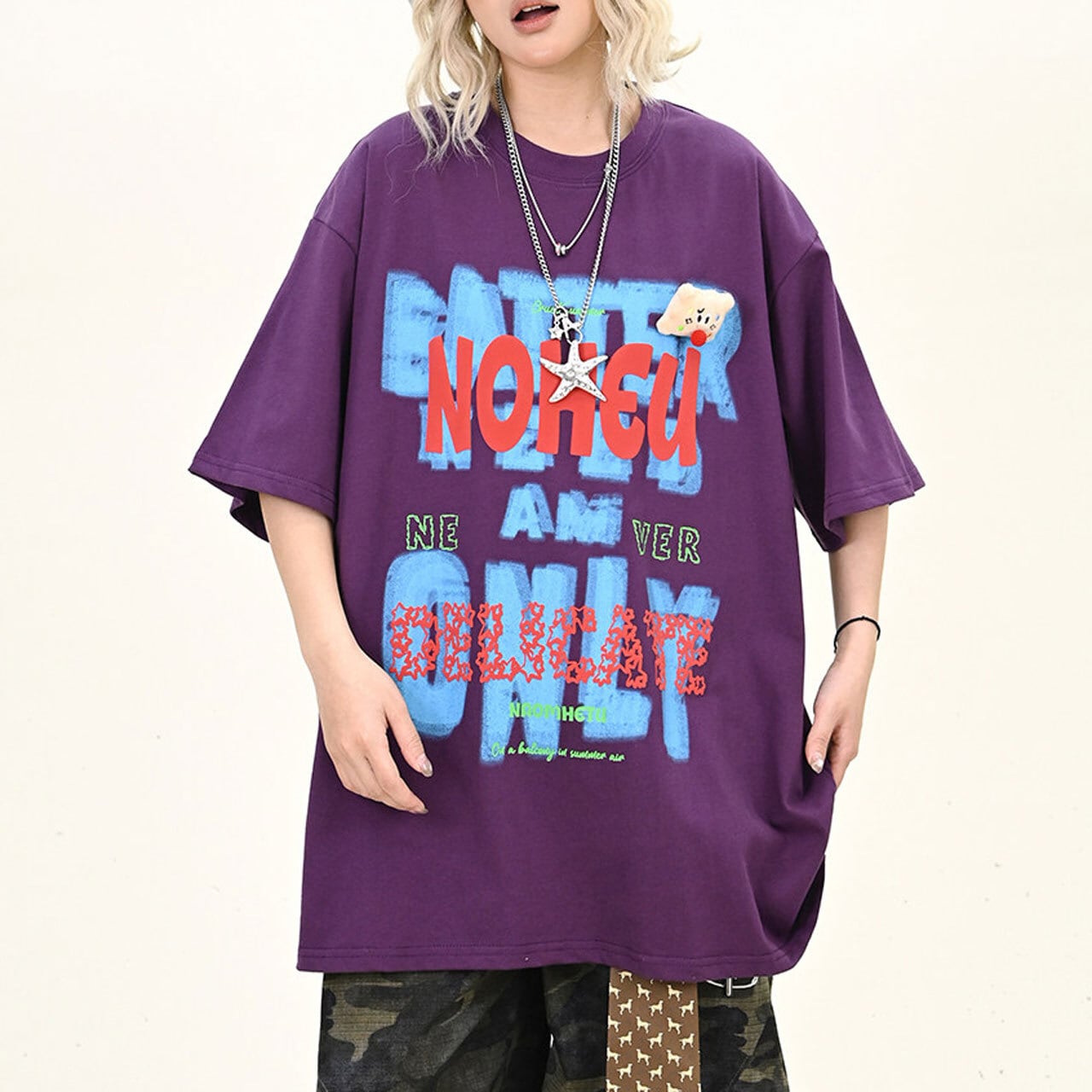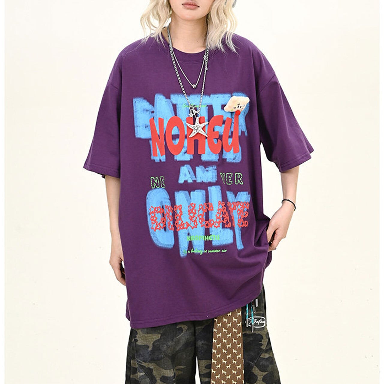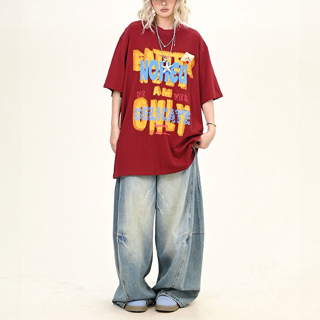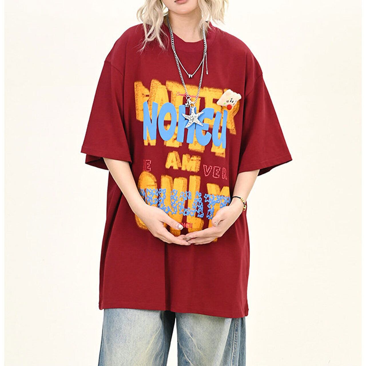 大胆なレタリングモチーフを重ねた、インパクト抜群のビッグTシャツ。