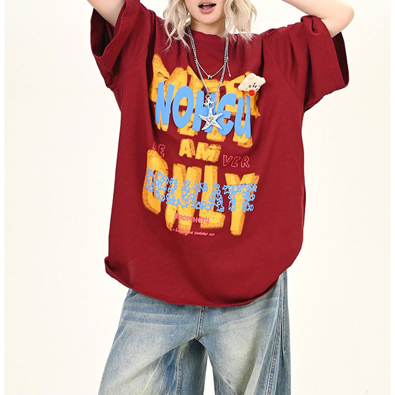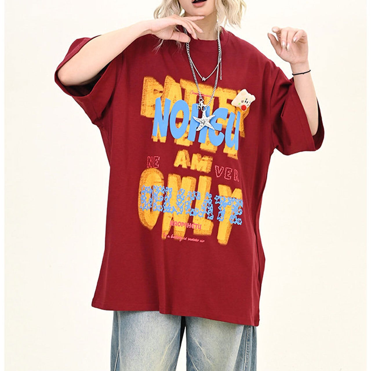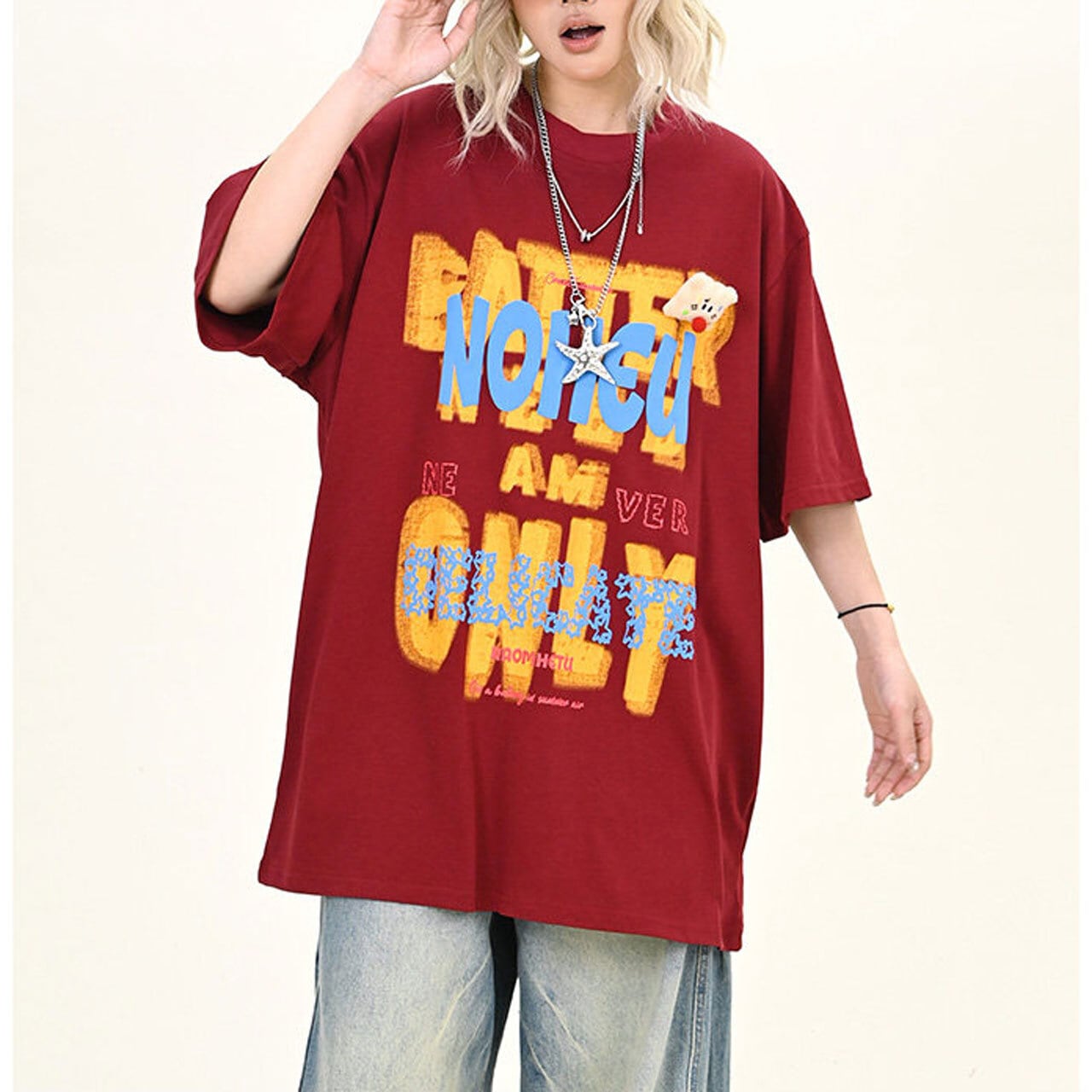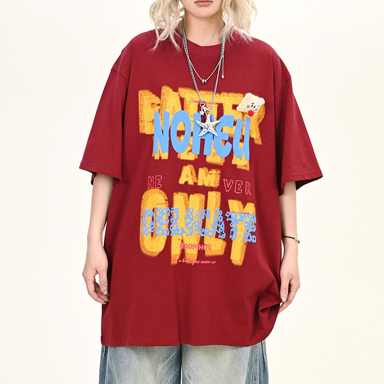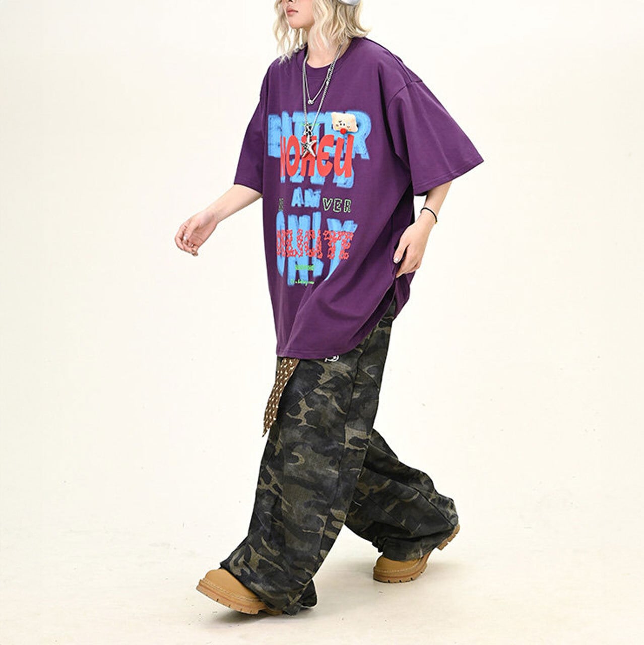 大胆なレタリングモチーフを重ねた、インパクト抜群のビッグTシャツ。