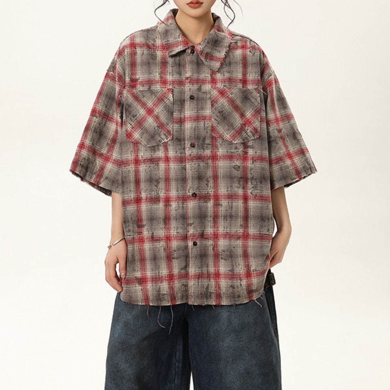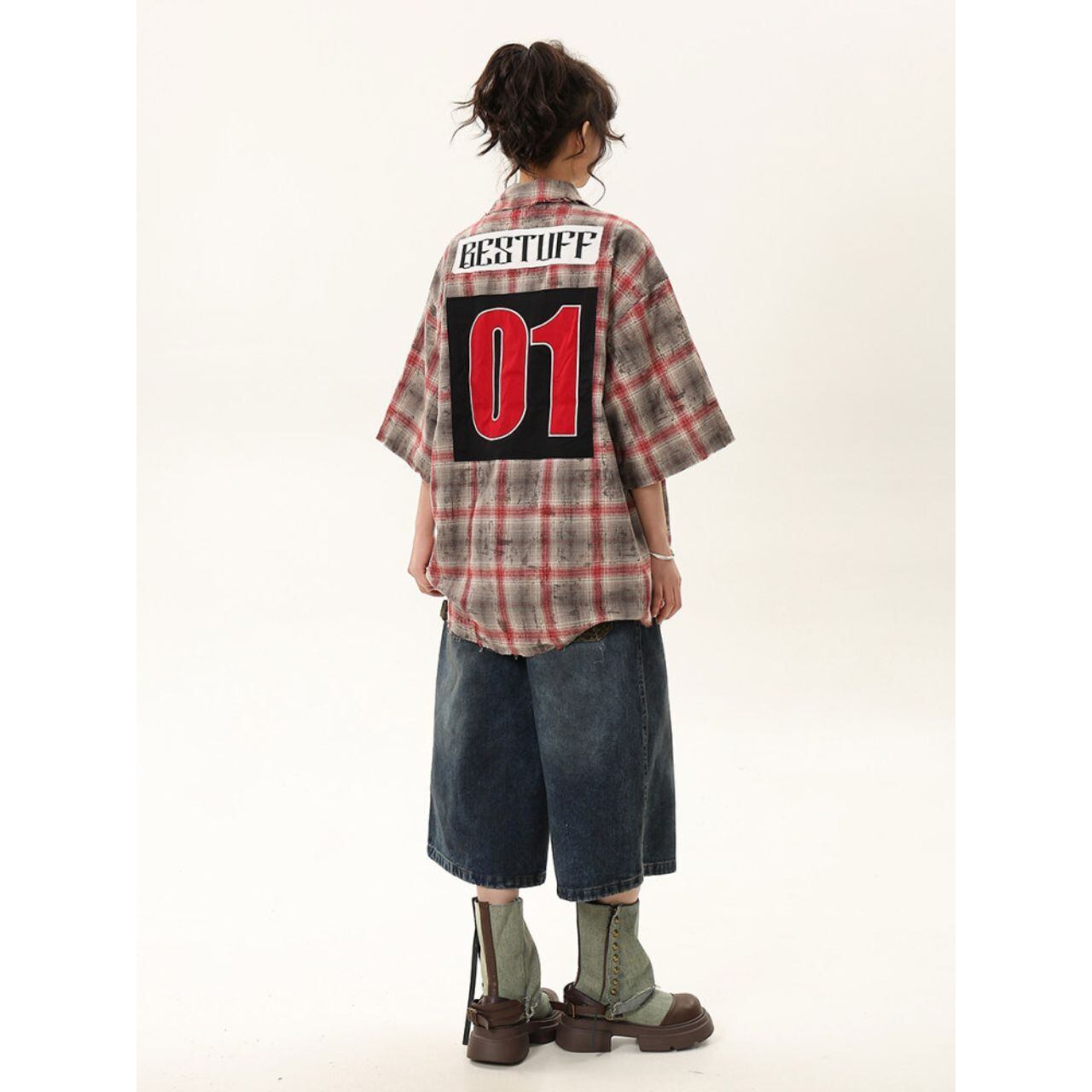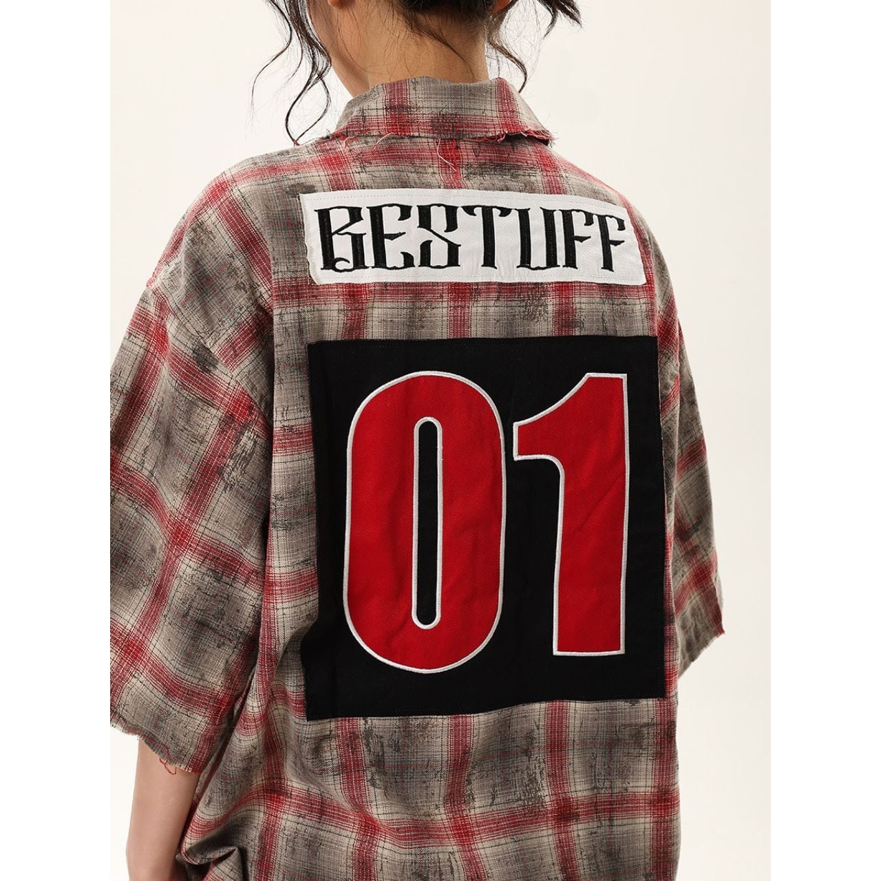 目を引くパッチワークとチェック柄の組み合わせが、個性的な存在感を放つ半袖シャツ。