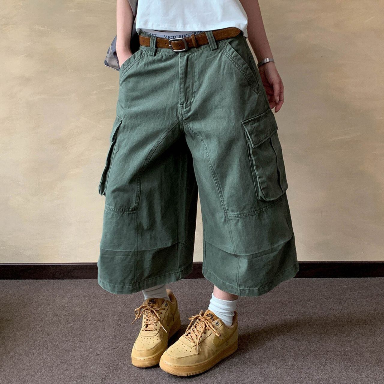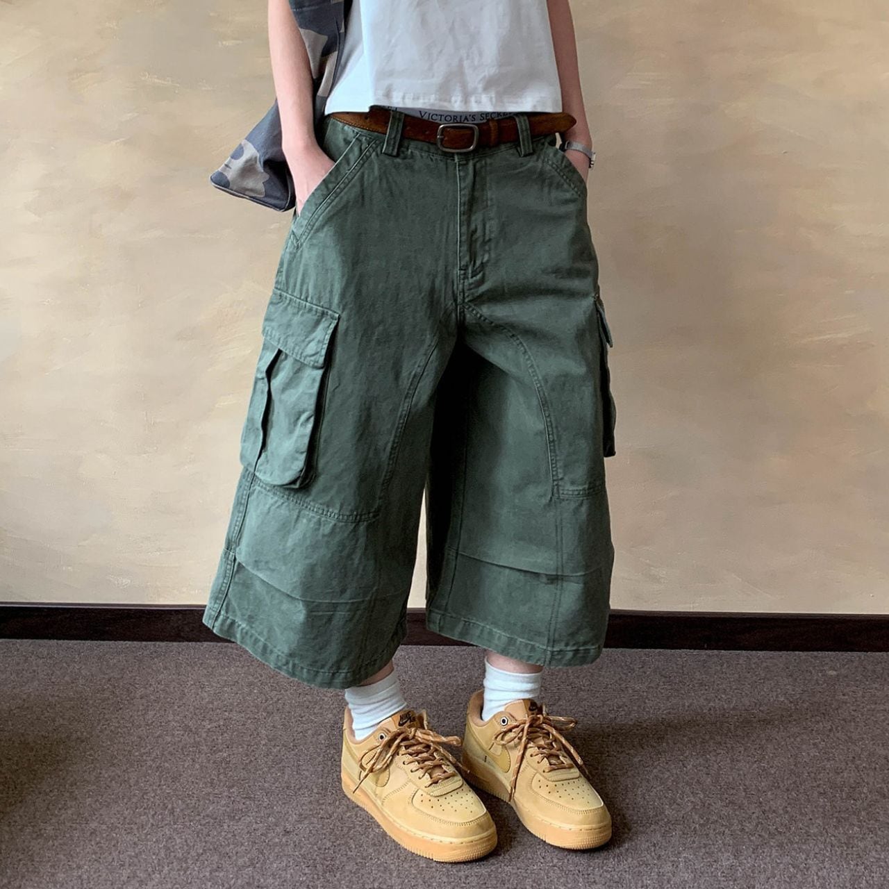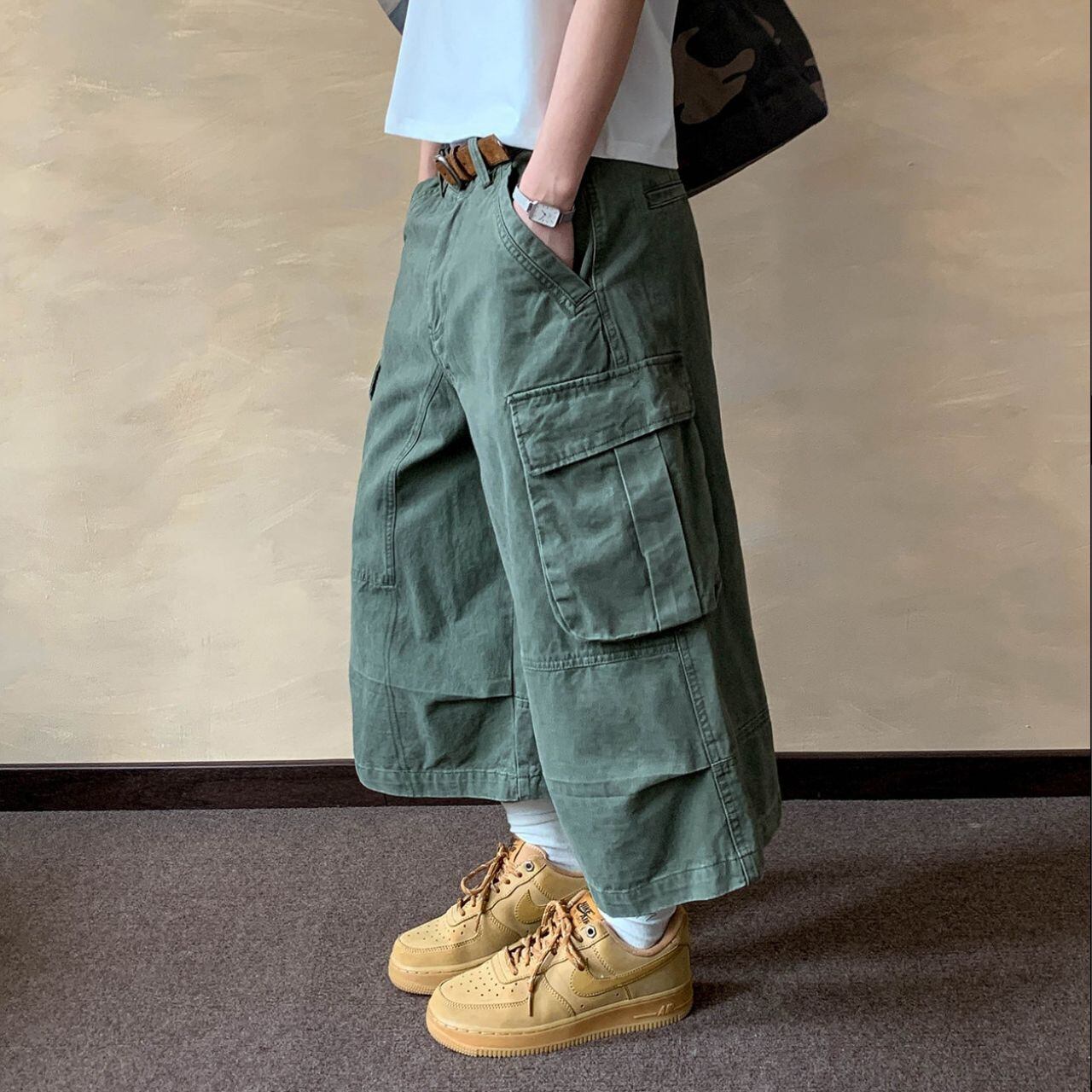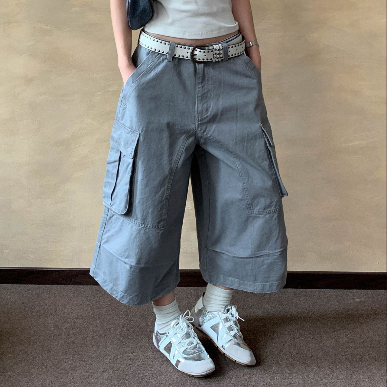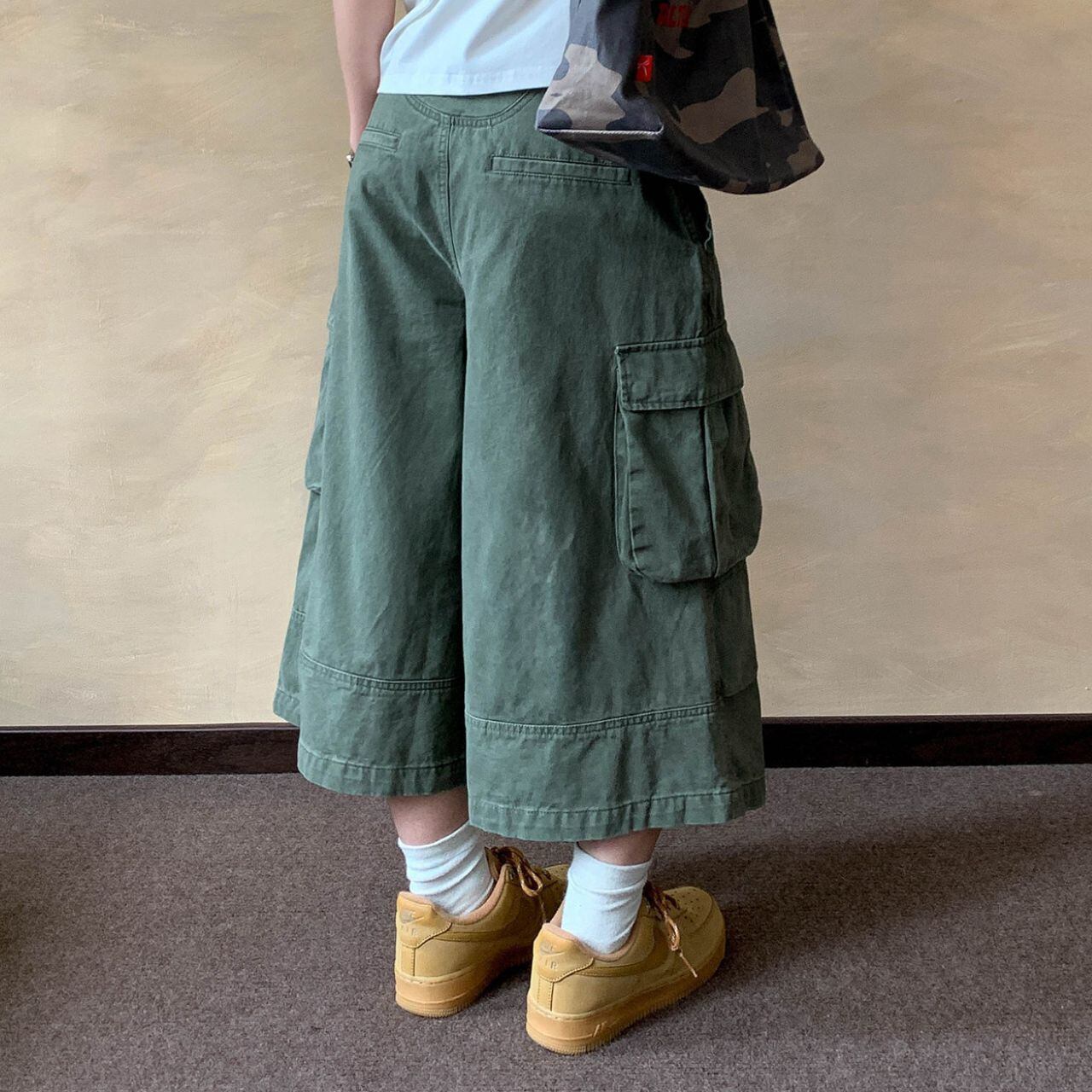 ワイドなシルエットが特徴的なクロップド丈カーゴパンツ。