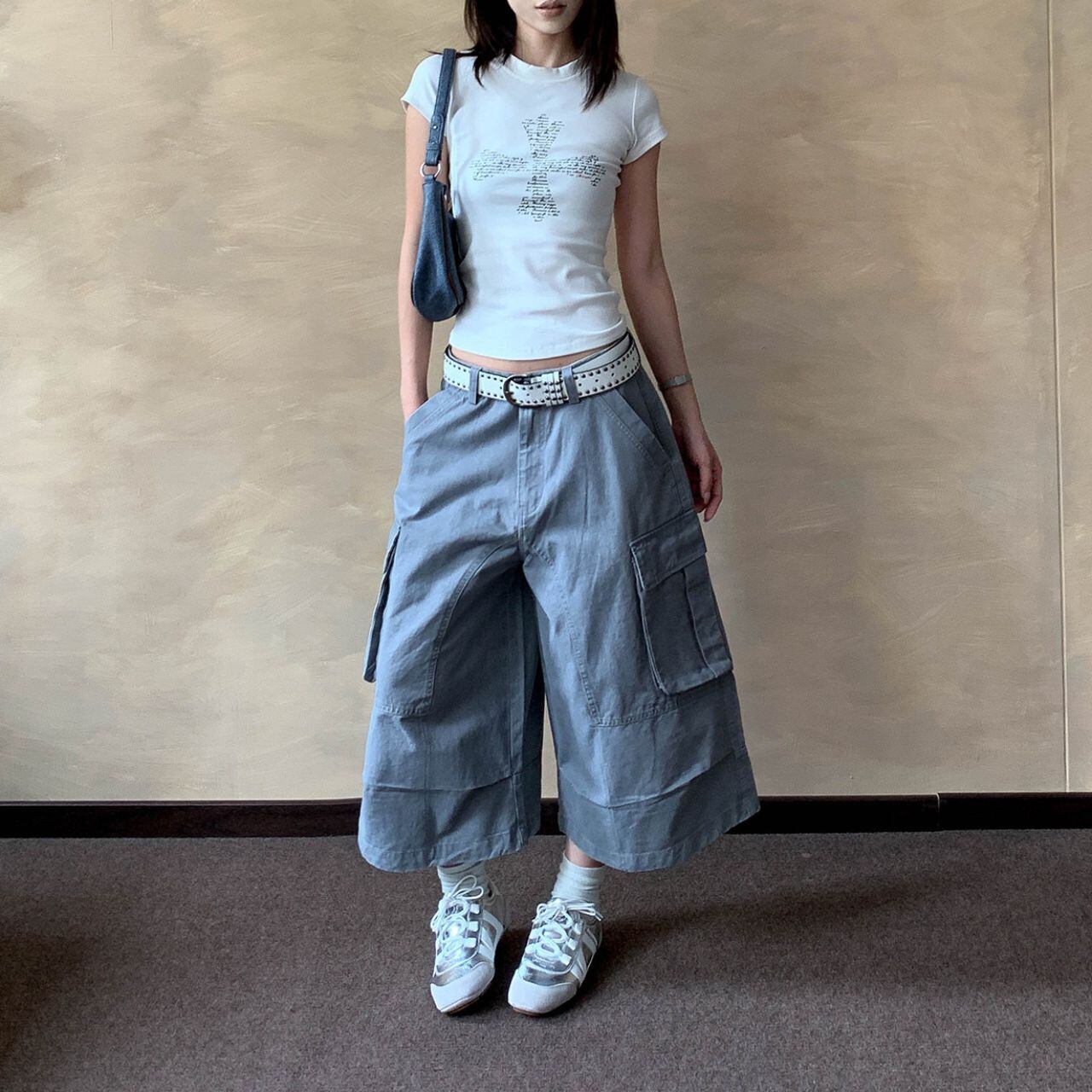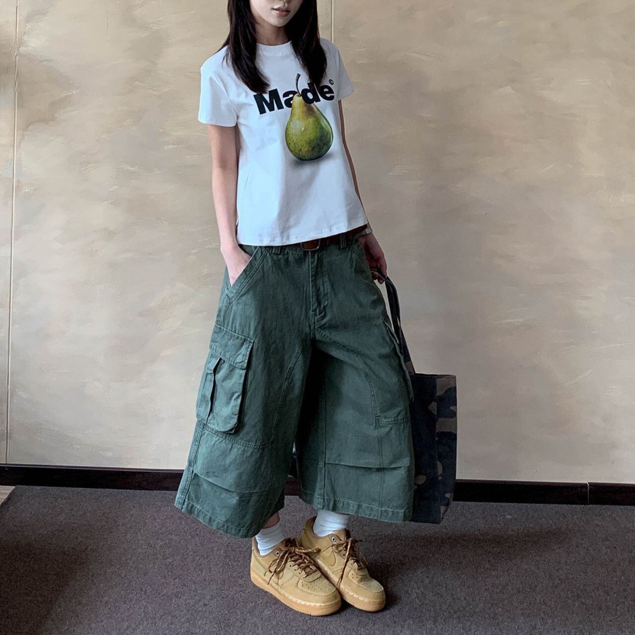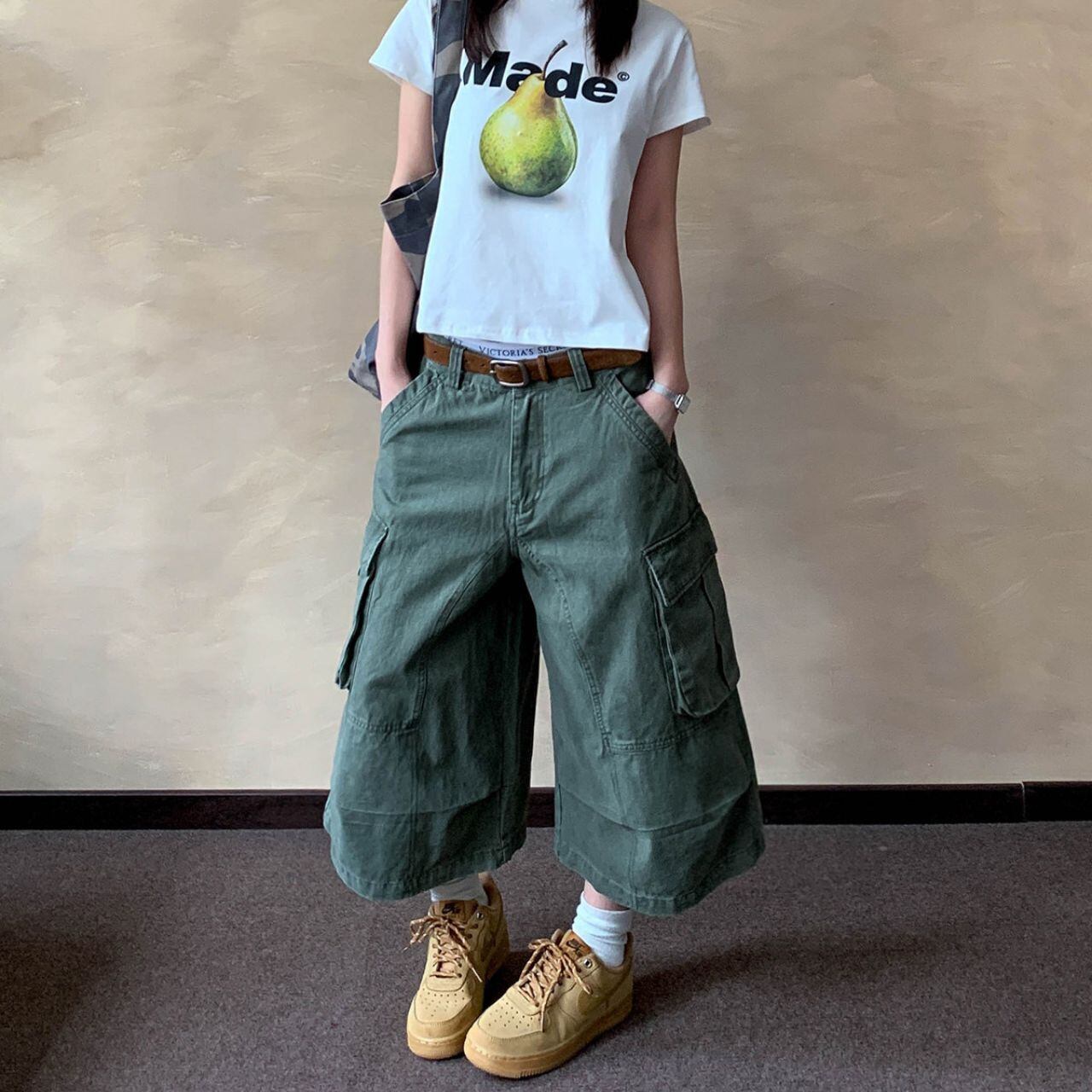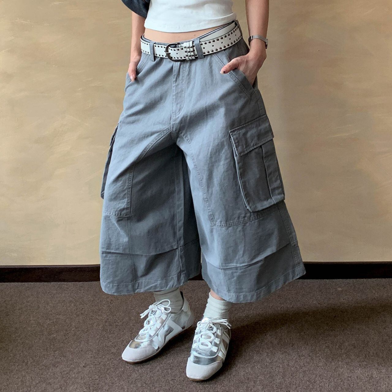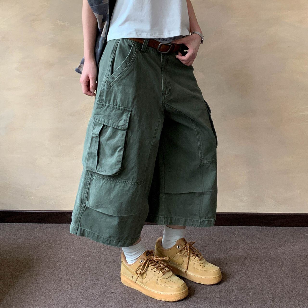 ワイドなシルエットが特徴的なクロップド丈カーゴパンツ。