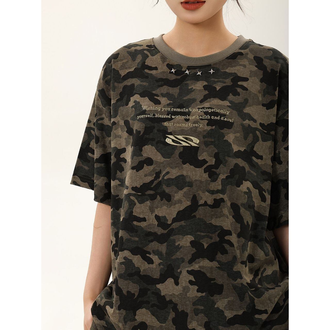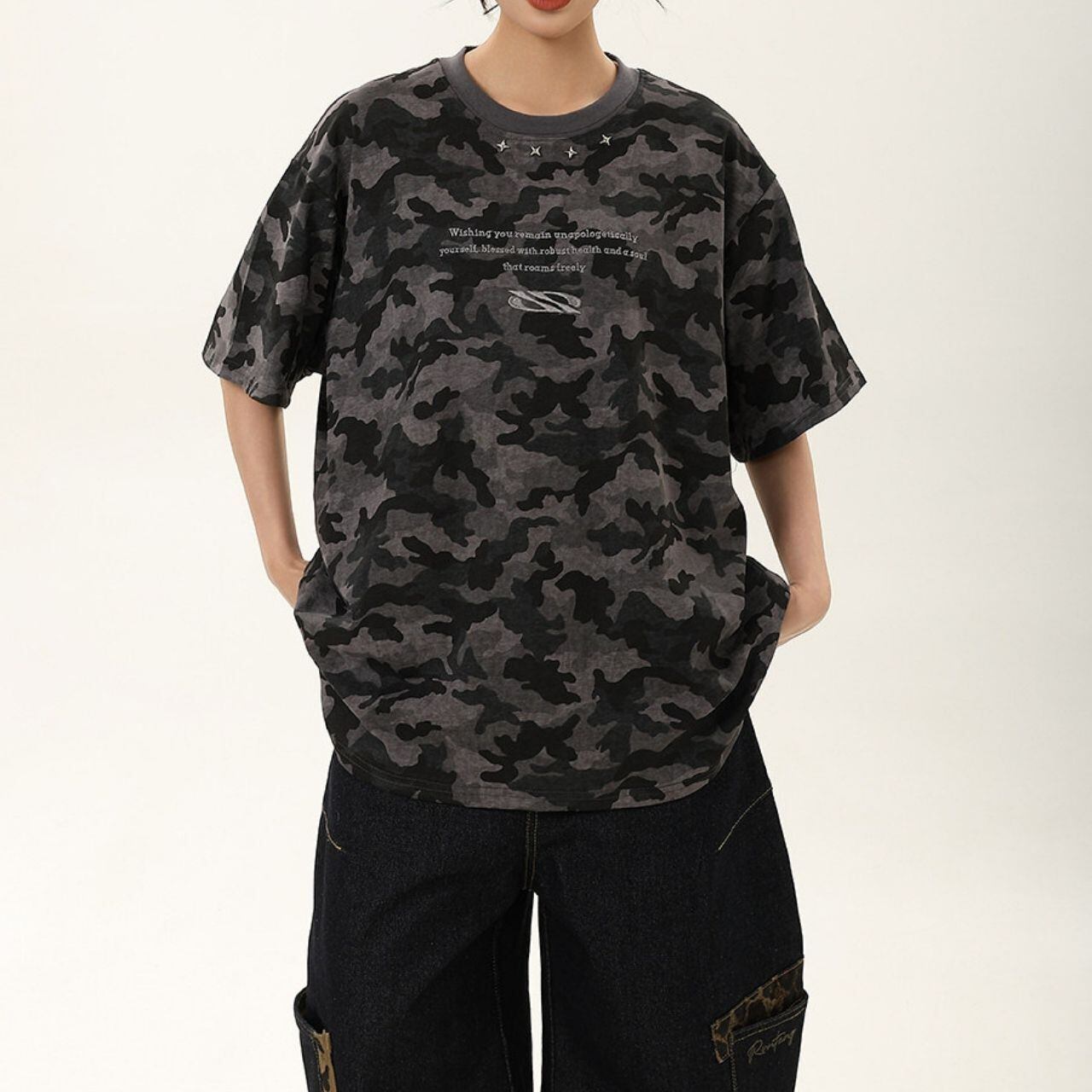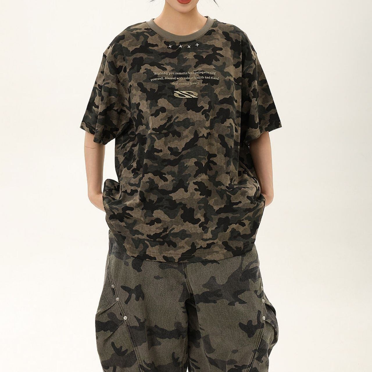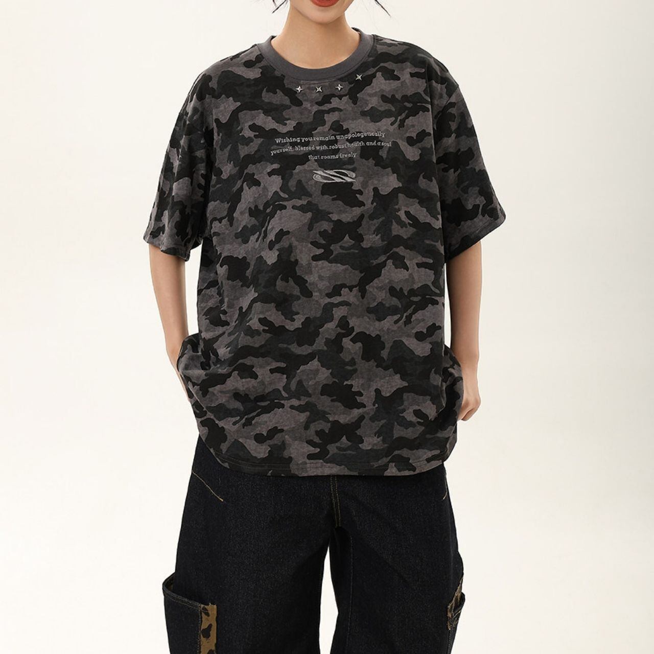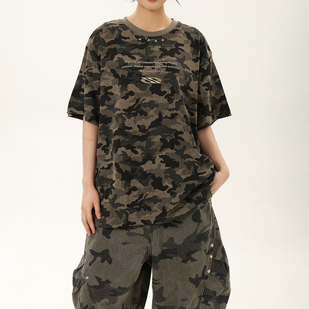 全面に広がるカモフラージュモチーフが目を惹く、ストリートムード漂うデザインTシャツ。