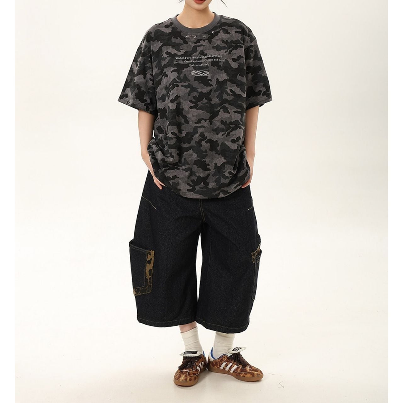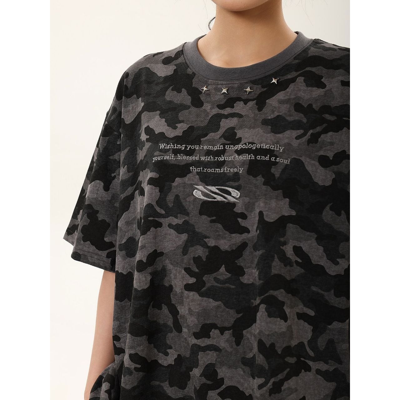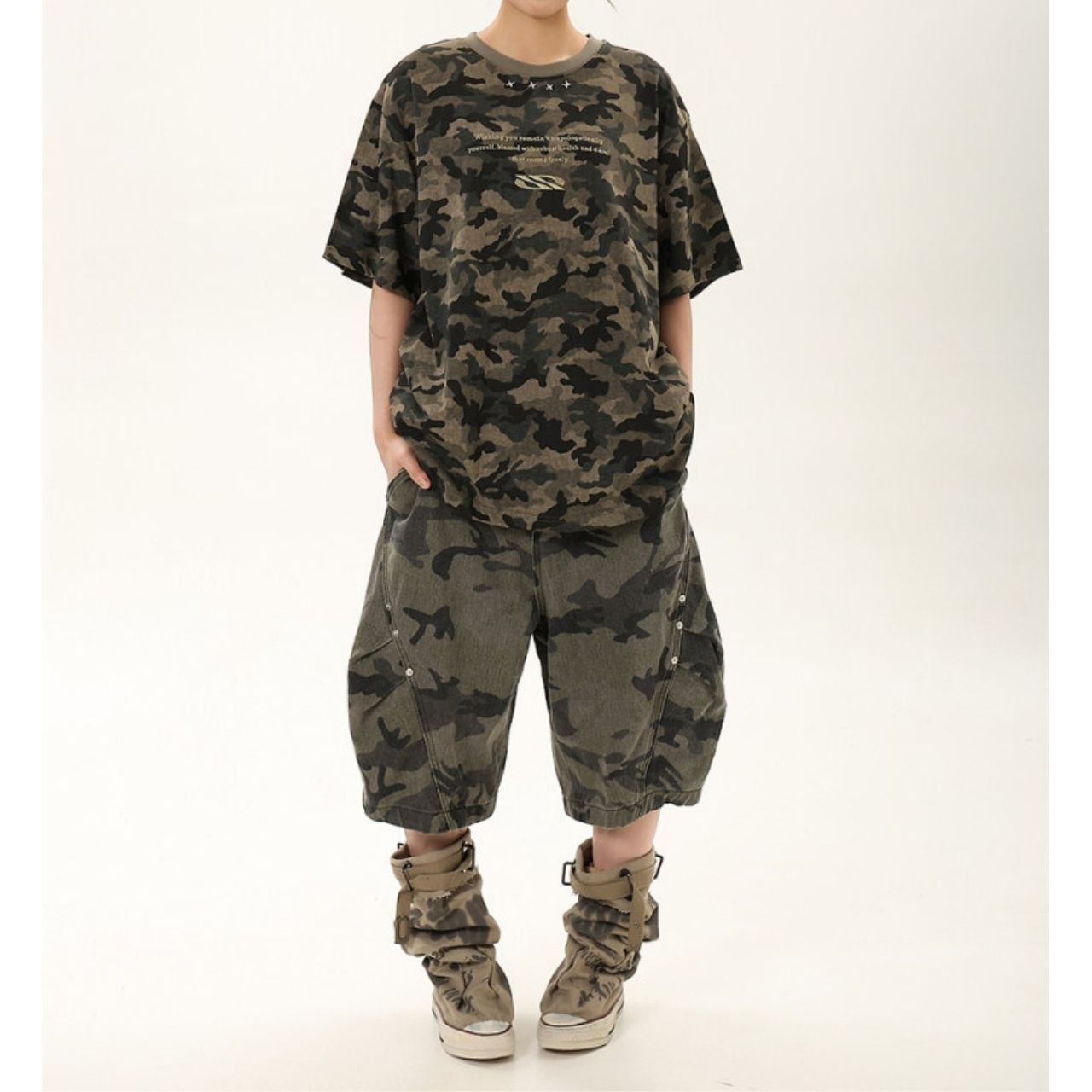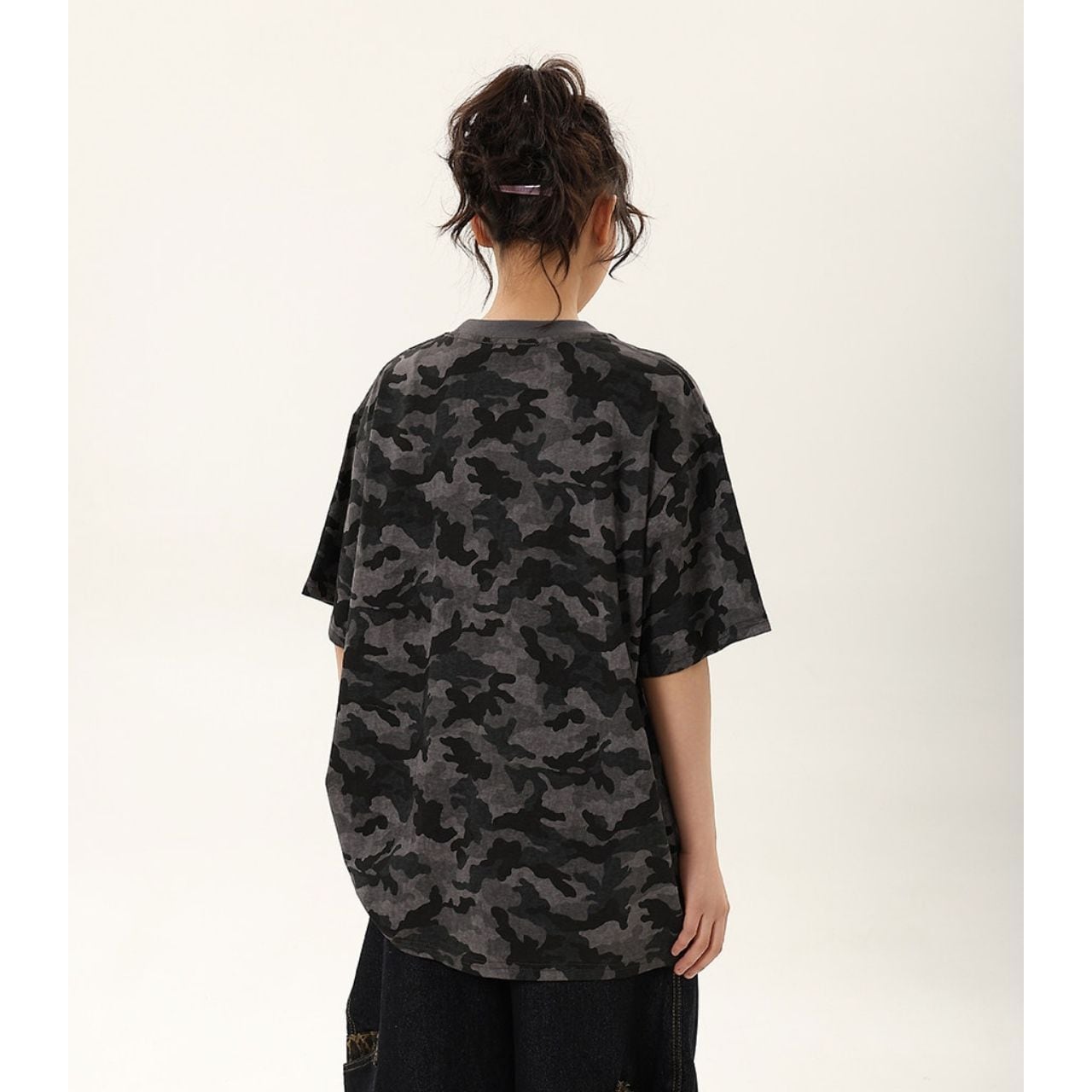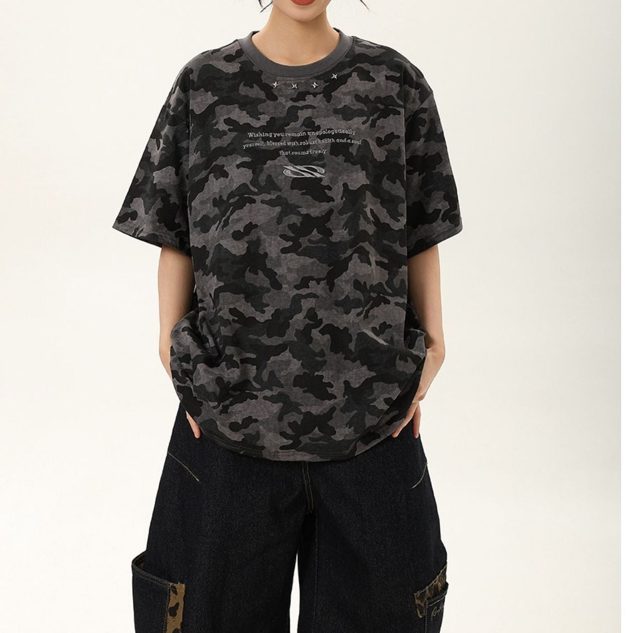 全面に広がるカモフラージュモチーフが目を惹く、ストリートムード漂うデザインTシャツ。